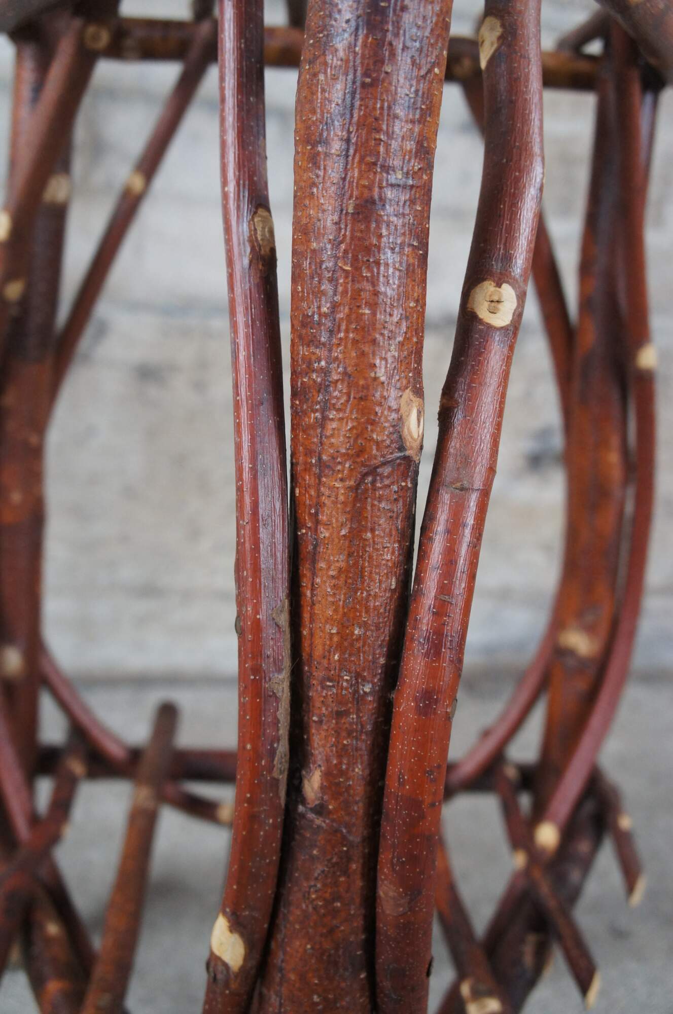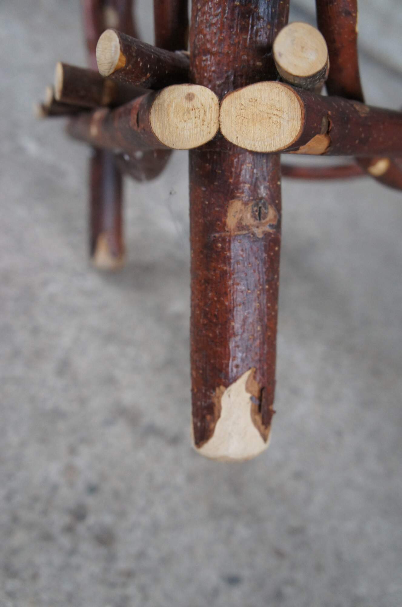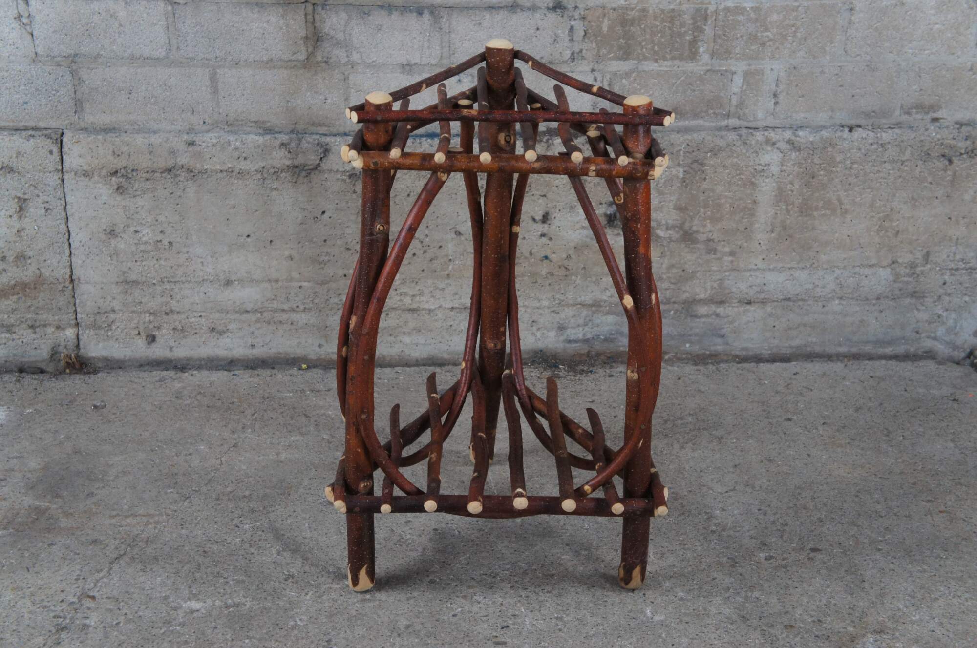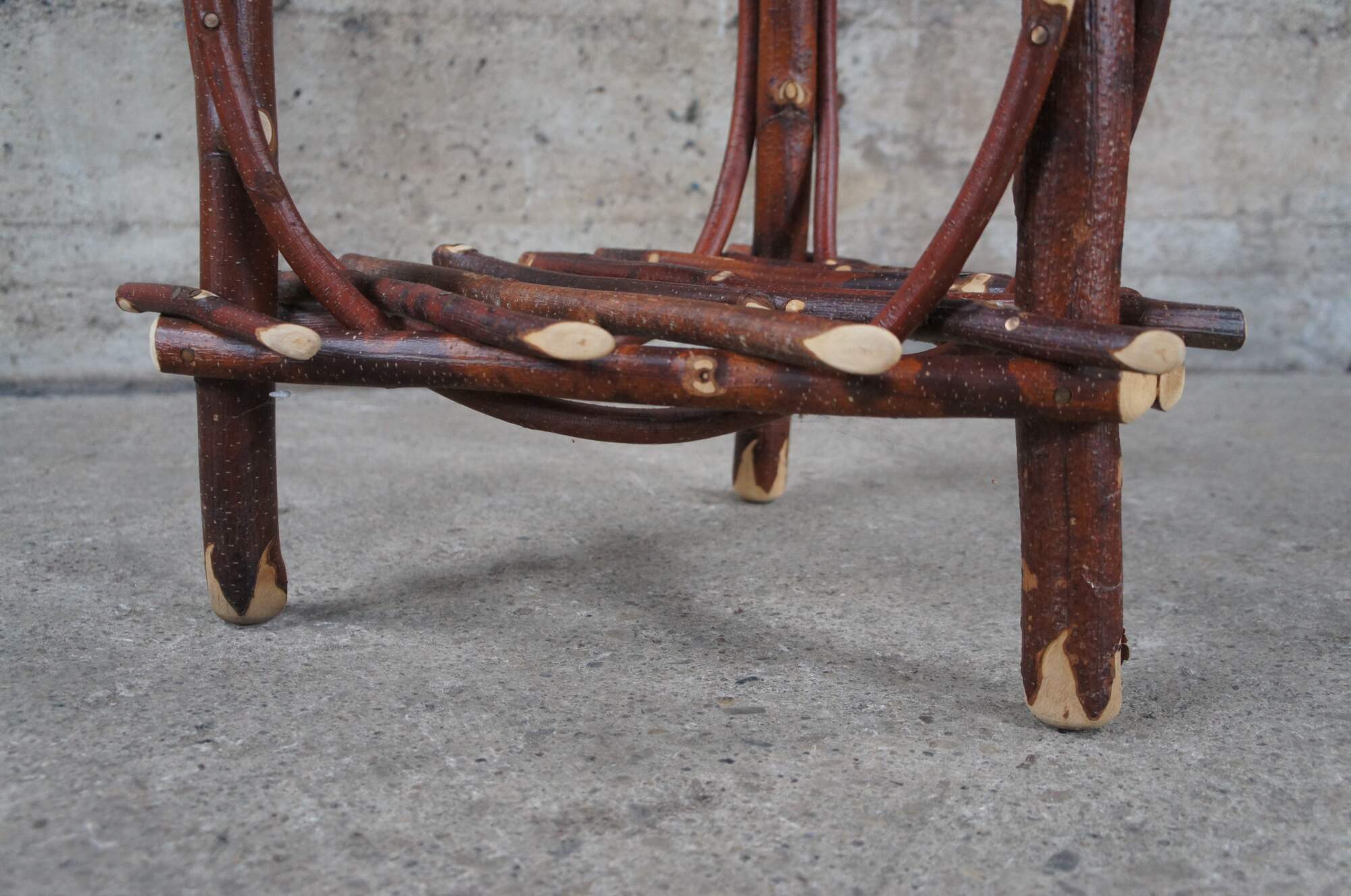 Vintage adirondack stick or twig table featuring triangular form with two tiers, upper gallery, and bentwood accents.