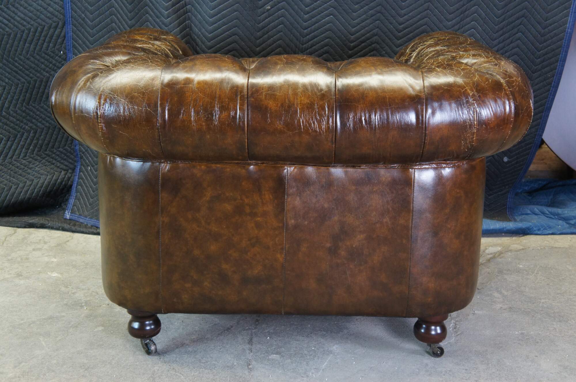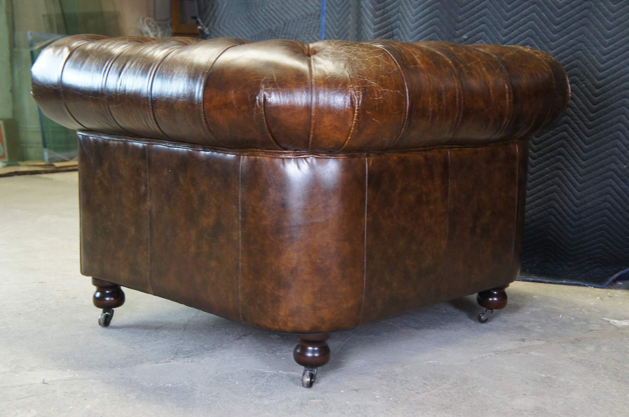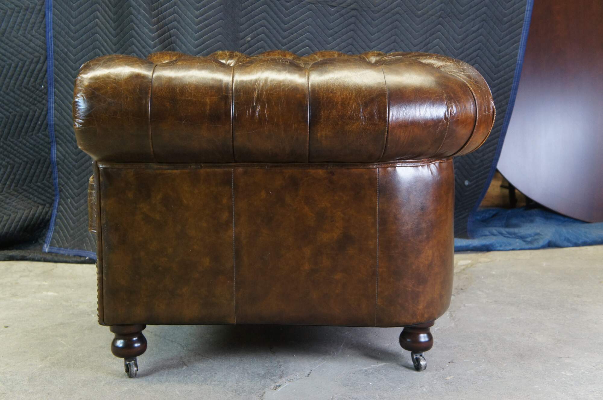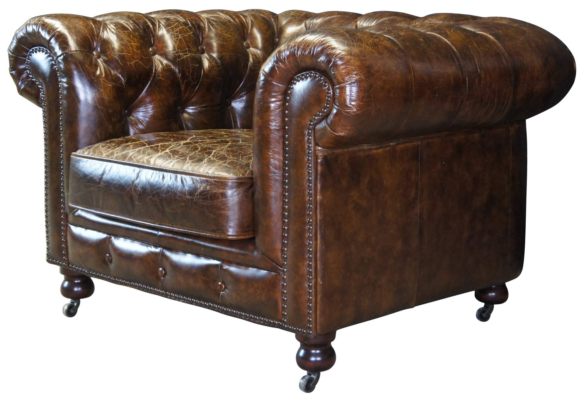 An elegant 20th Century Chestefield Club Arm Chair. Upholstered in a warm brown leather with natural distressing, tufting and nailhead trim. The chair rest on mahogany bun feet with casters.