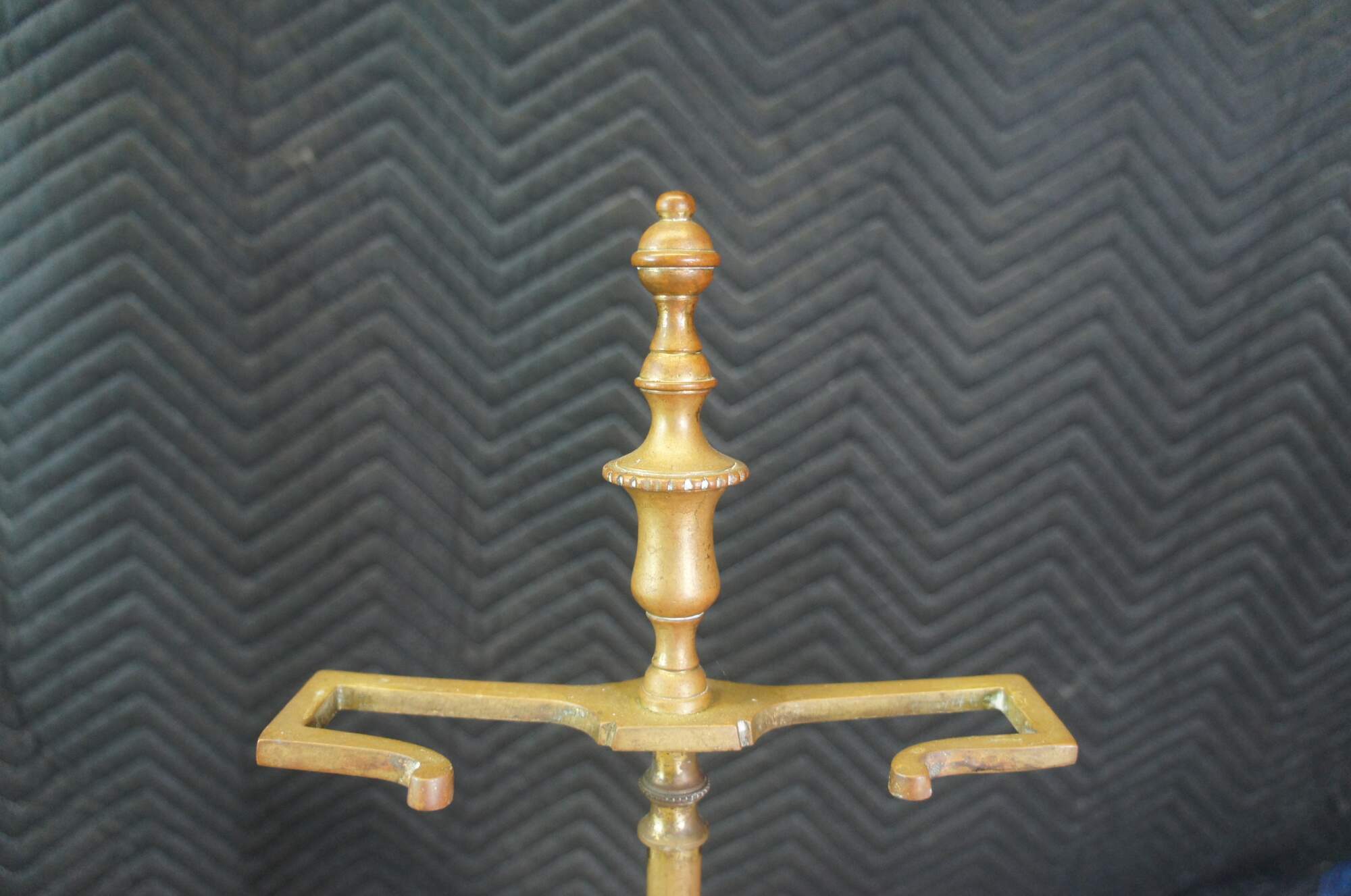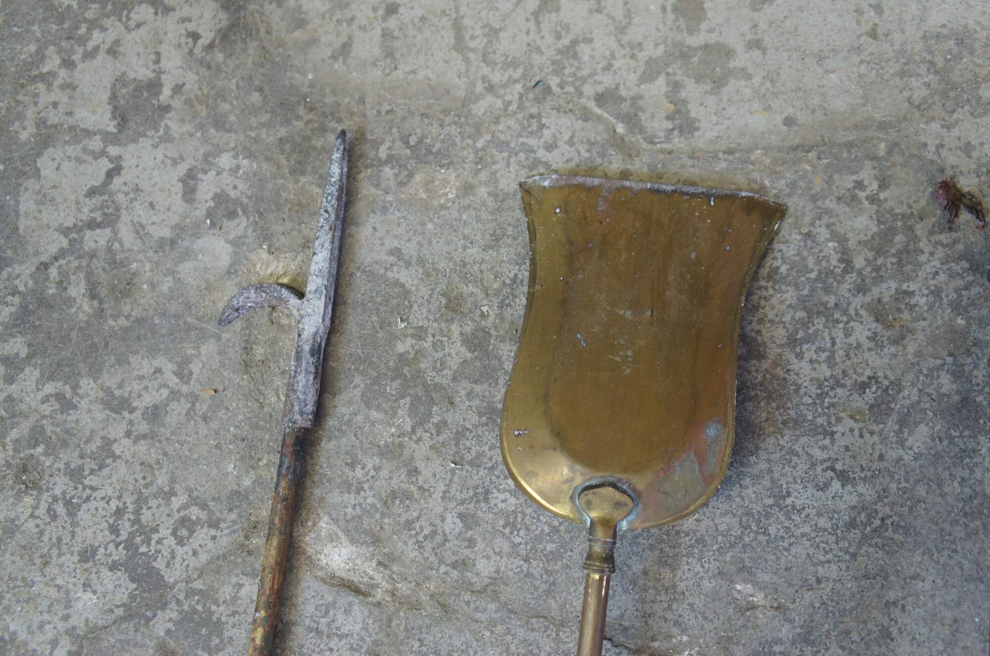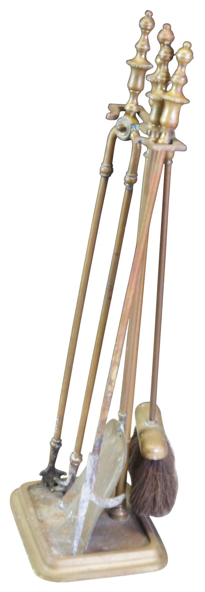 Antique five piece brass fireplace hearthware tool set featuring a brush, tongs with claws, a shovel, poker and stand.