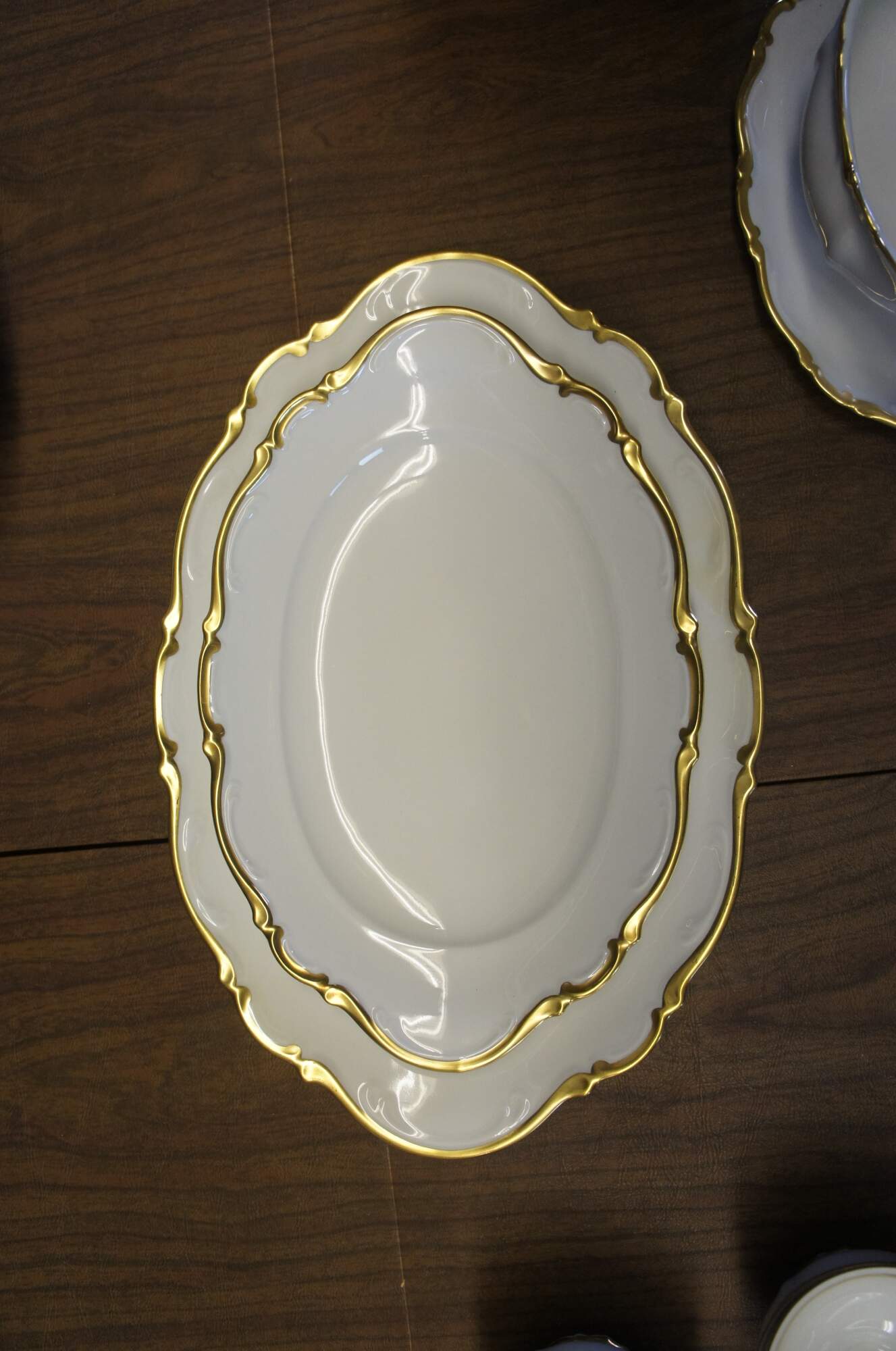 Vintage Mitterteich Bavaria Golden Lark china, tea and coffee dinner set featuring serpentine design with a classic white with gold pattern rim. Pattern 1507. Germany.