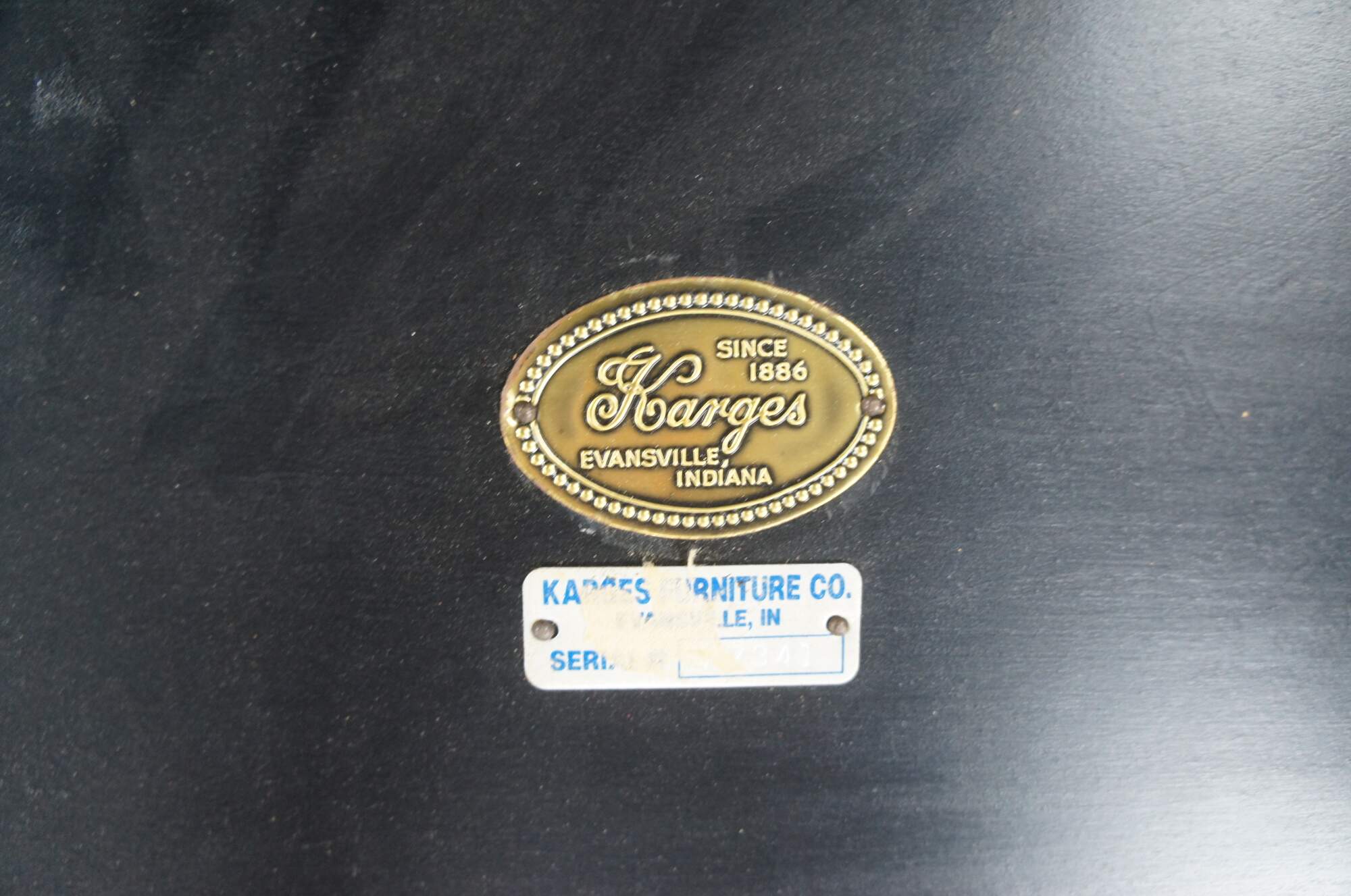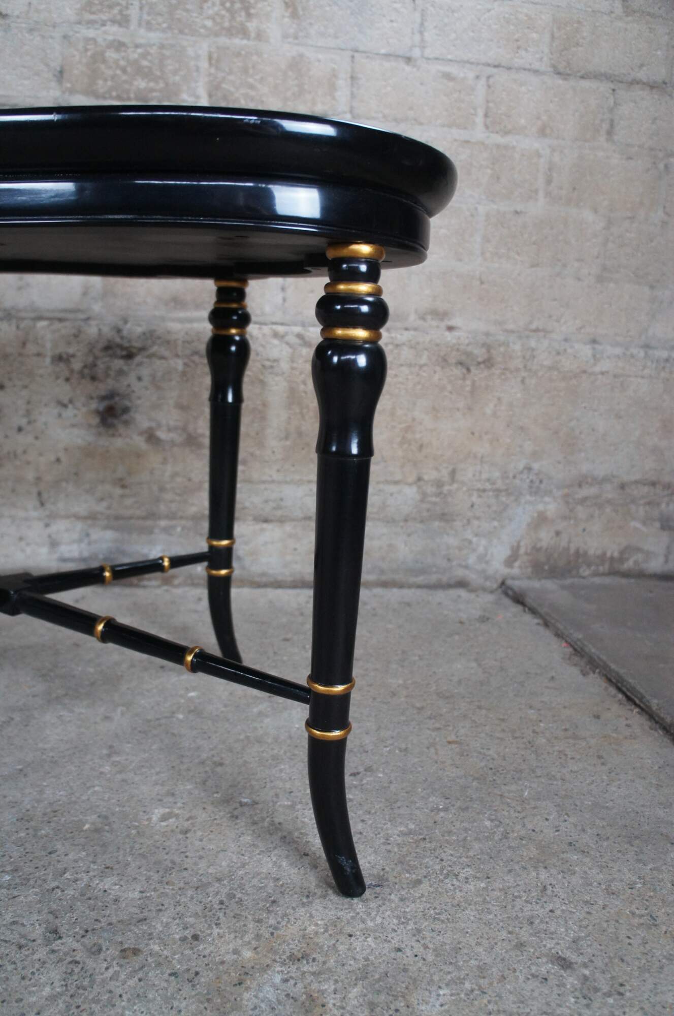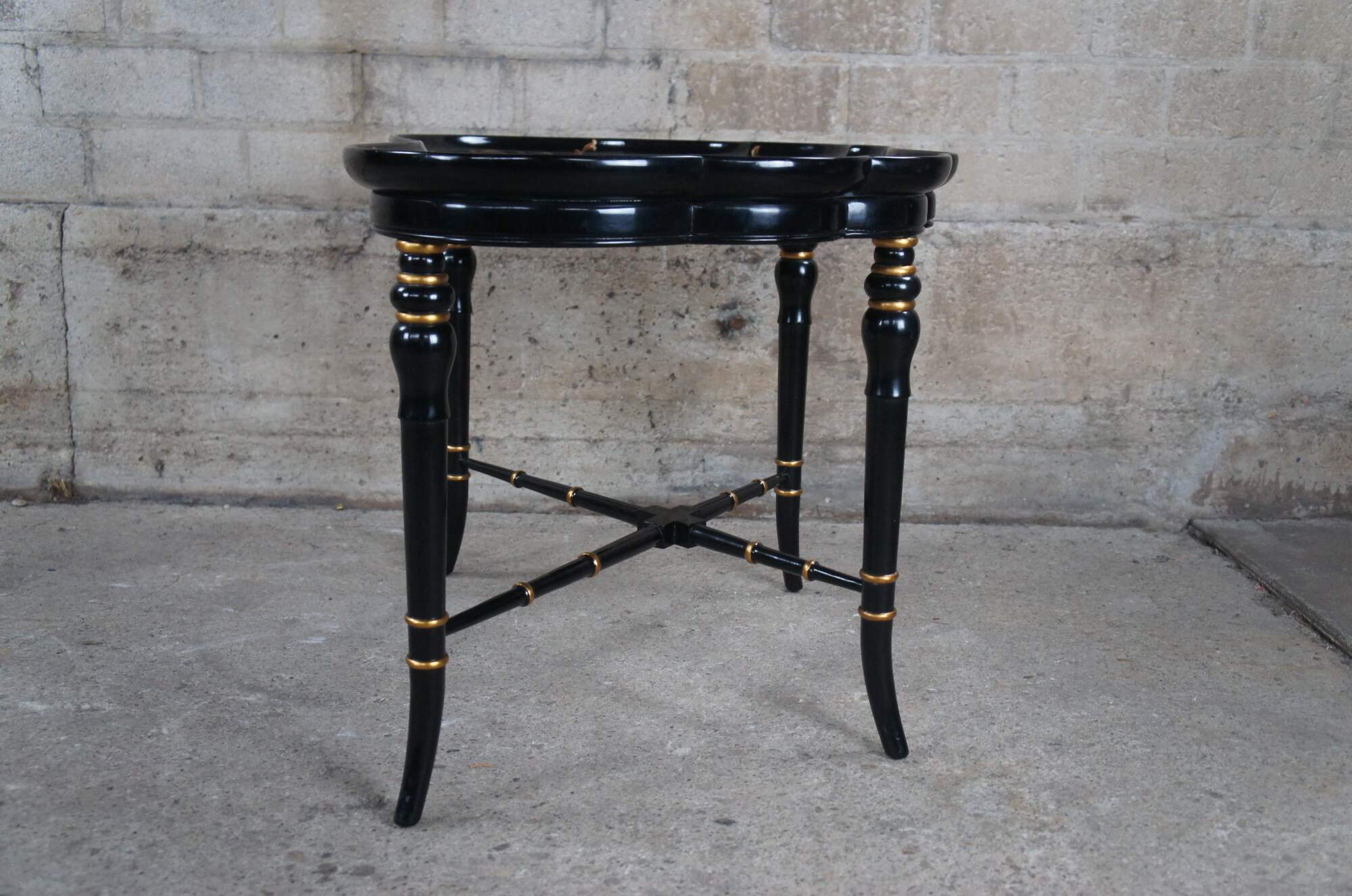 Two vintage English Regency style tray tables by Karges Furniture. Featuring black lacquered finish with a butterfly shaped top with gallery that surrounds a scene of two gamecocks and a old Bonsai tree. Supported by faux bamboo legs with gold accents connected by an X stretcher.