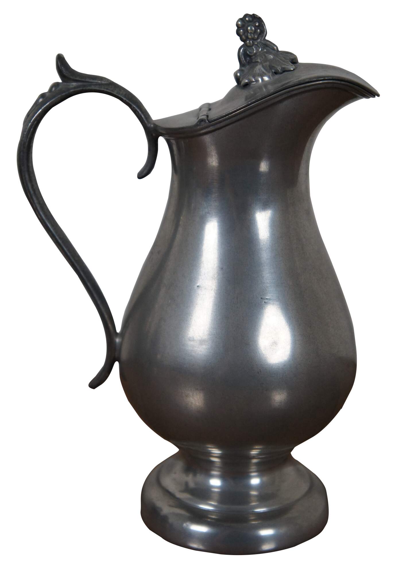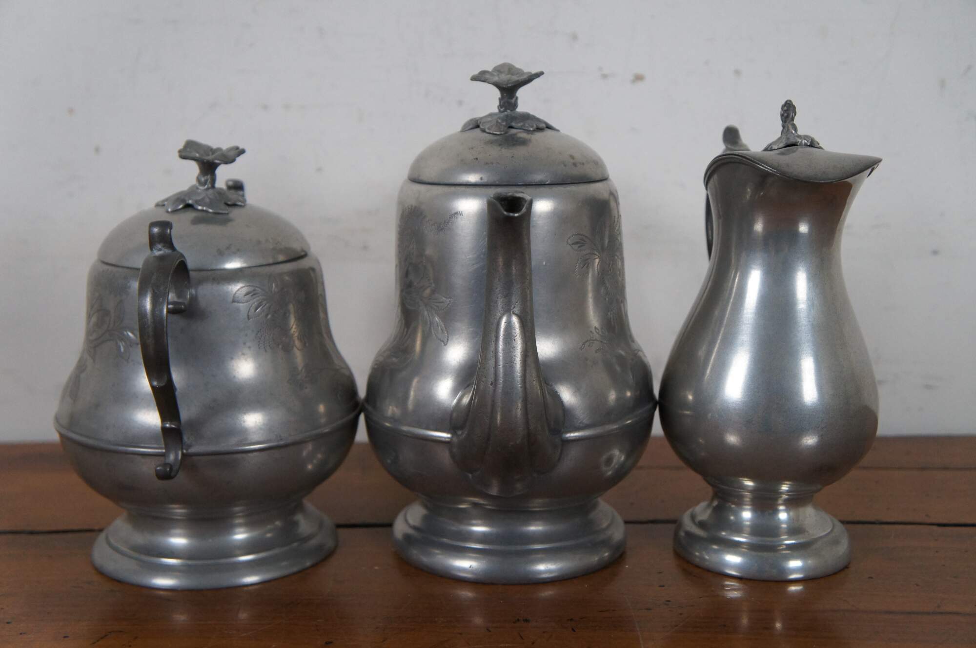 Set of three antique pewter pieces circa late 19th century - 1880’s to early 1890’s – the set includes a teapot and lidded sugar bowl with etched flowers and floral finial, and plain creamer with floral finial. Pieces are marked Homan & Co Cincinnati 3, H. Homan IX, and Homan & Co Cincinnati IX.