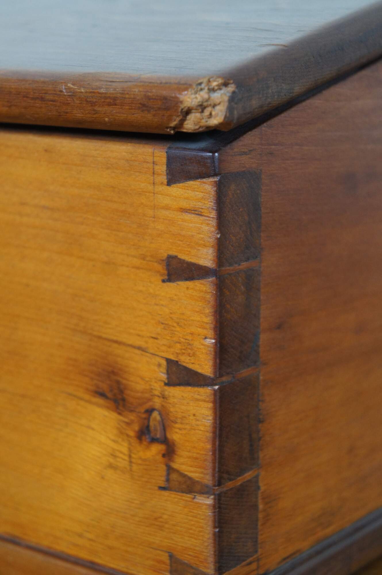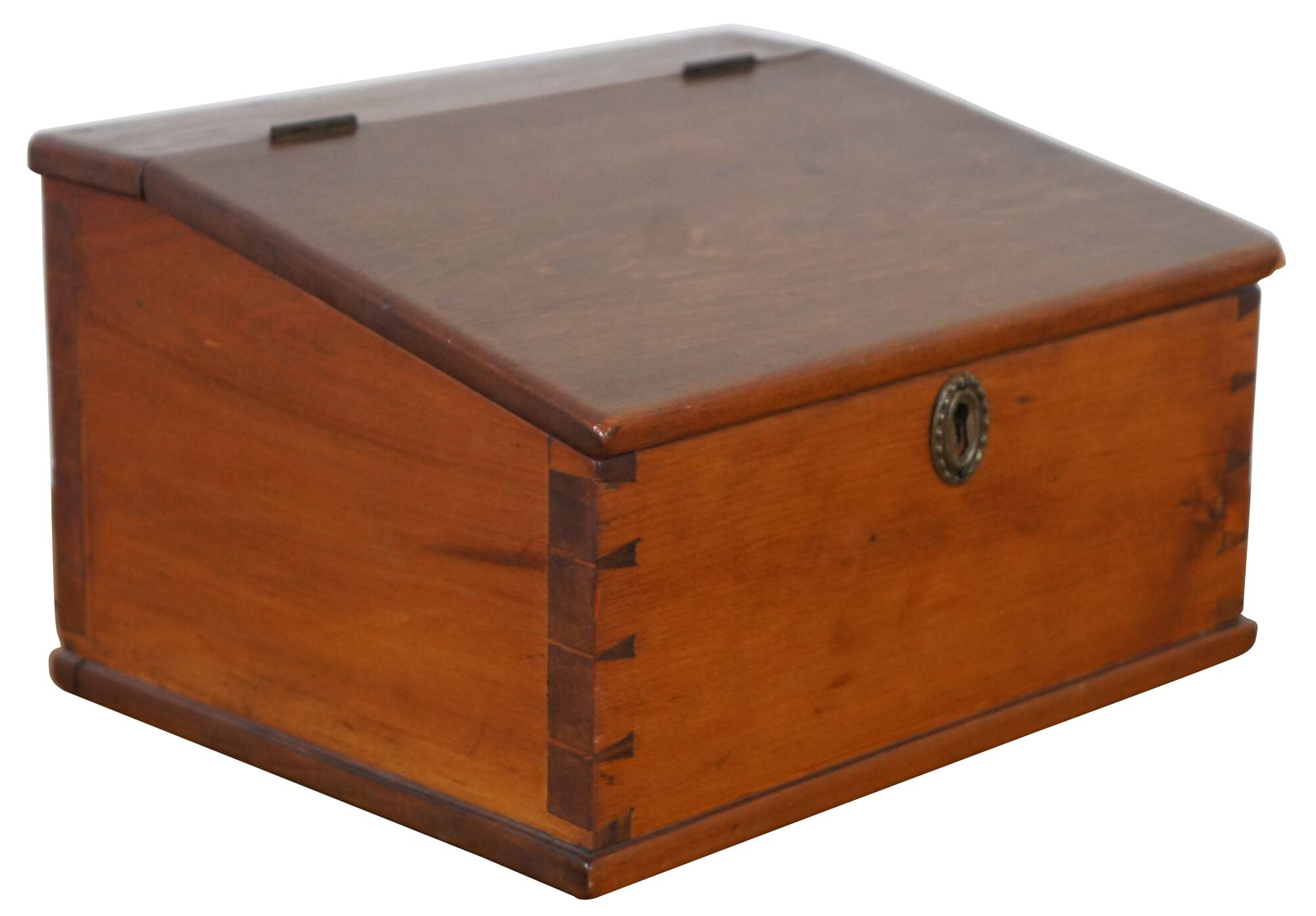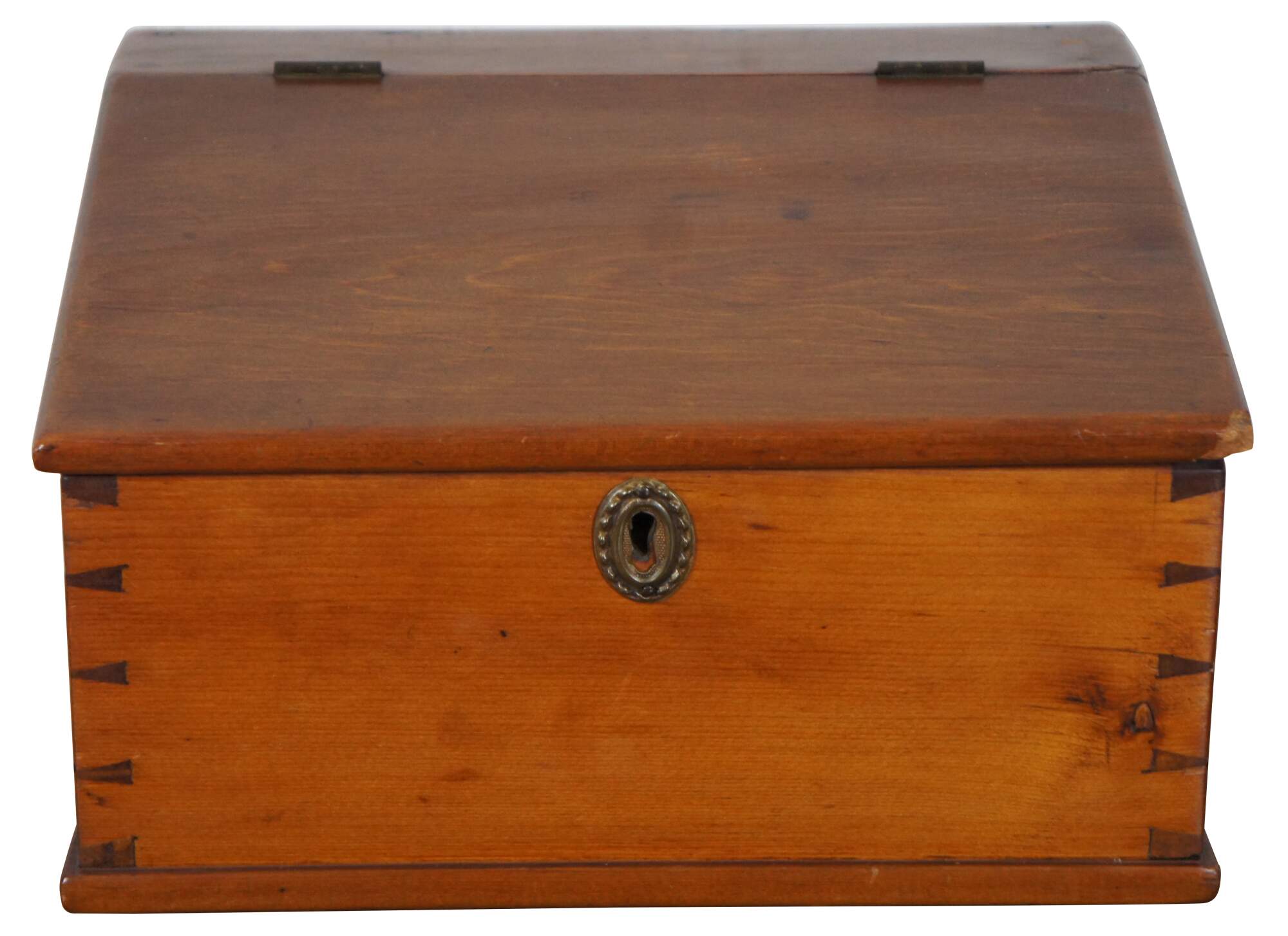 Antique pine letter box, handcrafted with dovetailed joints, sloped lid, and brass lock. Purchased many years ago at Garths in Cincinnati Ohio.