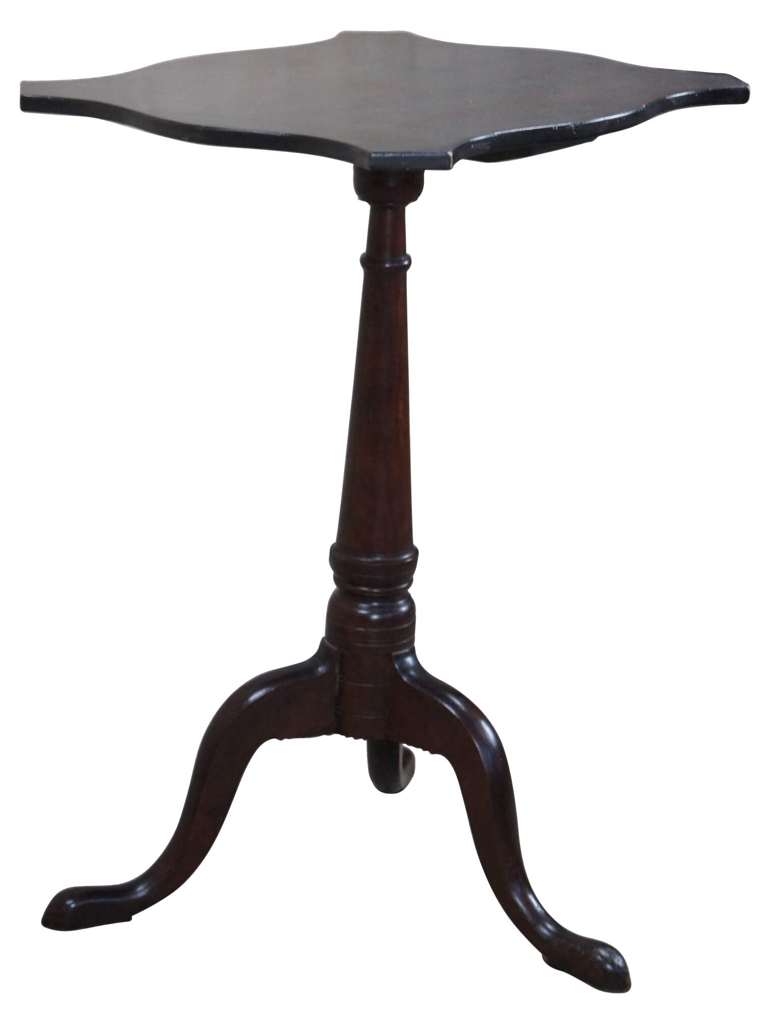 A beautiful 18th Century colonial mahogany Newport, Rhode Island candlestand. Features a serpentine turtle top over a conical shaft leading to a tripod base with notched and shaped returns on cabriole legs and slipper feet. The conical shaft relates to the nautical aspect of the area and is very popular amongst period pieces. This candlestand in particular has a very pronounced conical shaft which distinguishes it from many others.