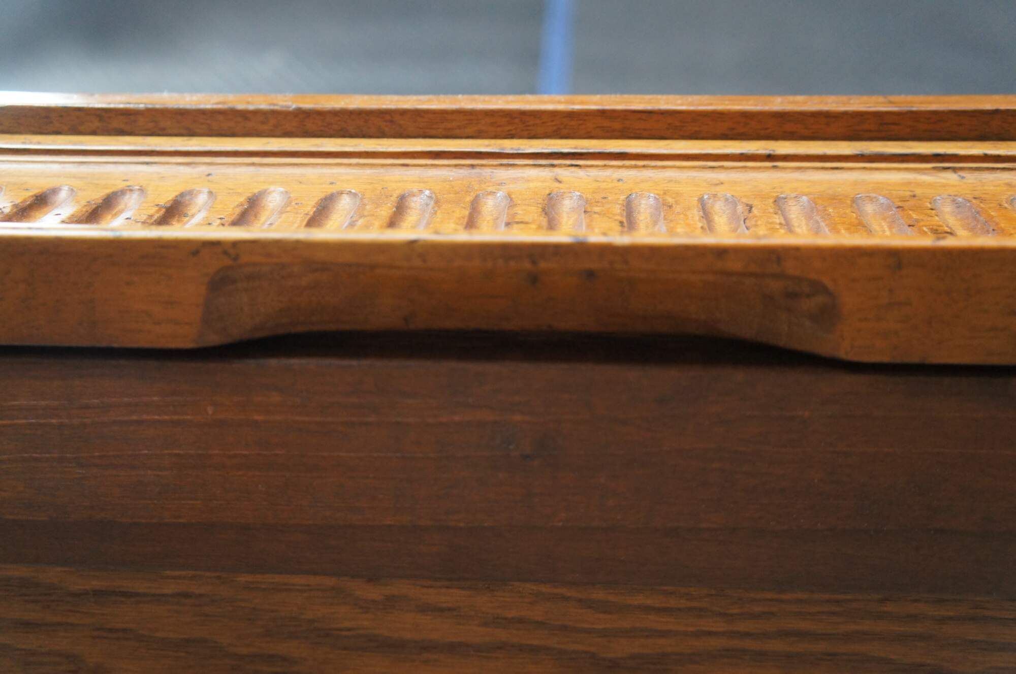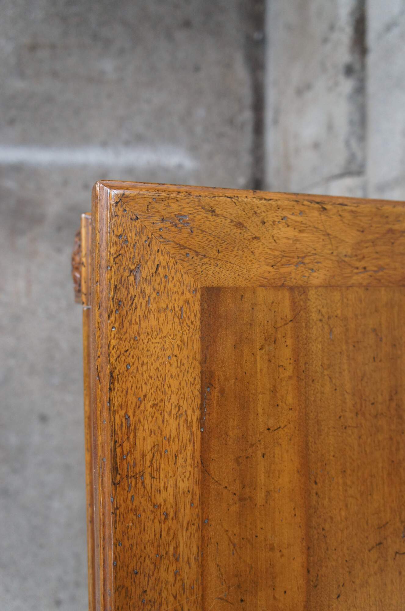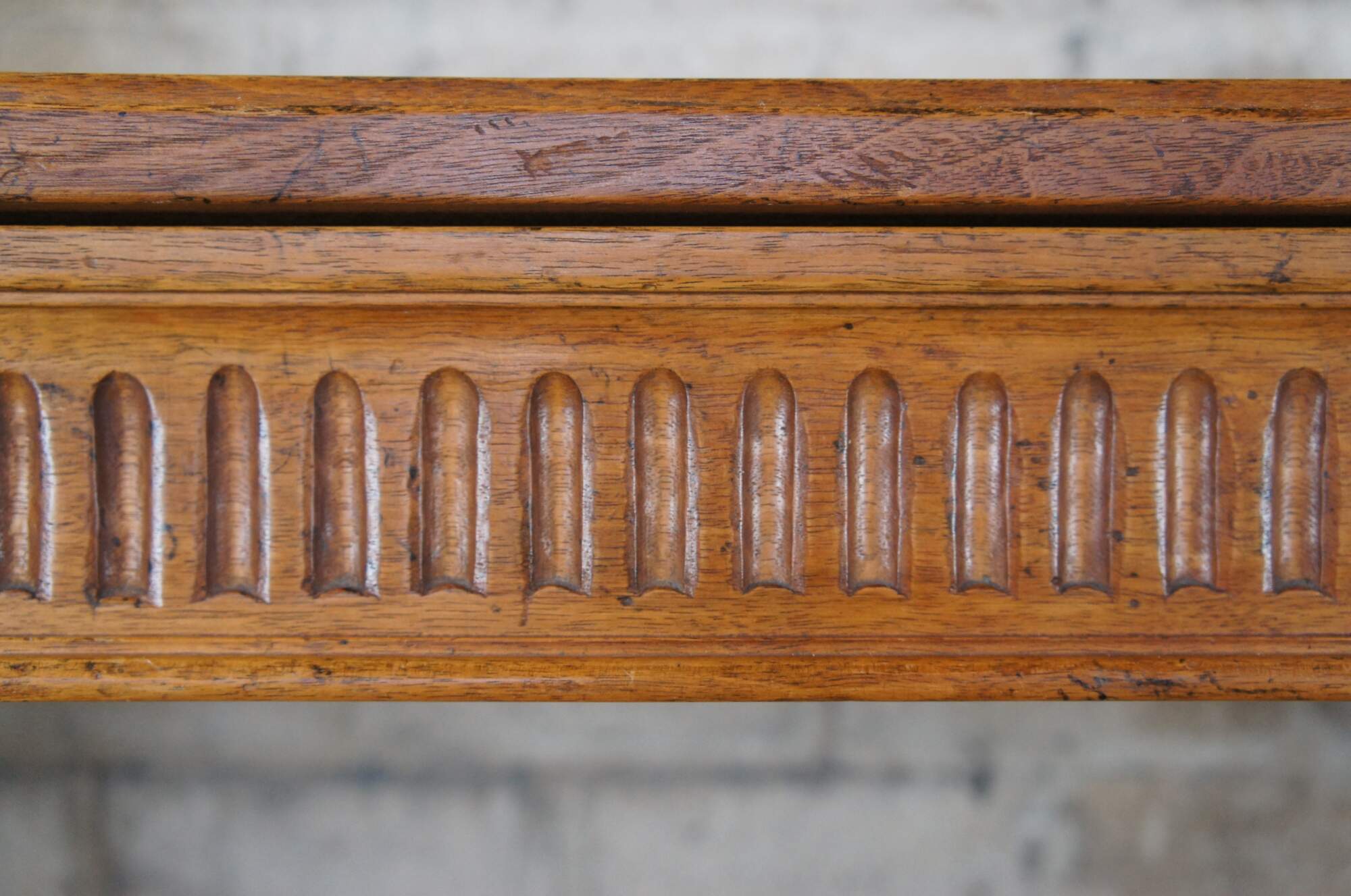 A beautiful Italian walnut wall mount console table. A rectangular form made from walnut with a fluted frieze, having a hidden drawer over shaped legs carved with medallions and Greek key accents leading to scrolled feet. The dovetailed drawer is made from solid oak with a pin striped interior and opens via grooves along the underside. Could be used as a dining server or drybar. Attributed to Don Ruseau.