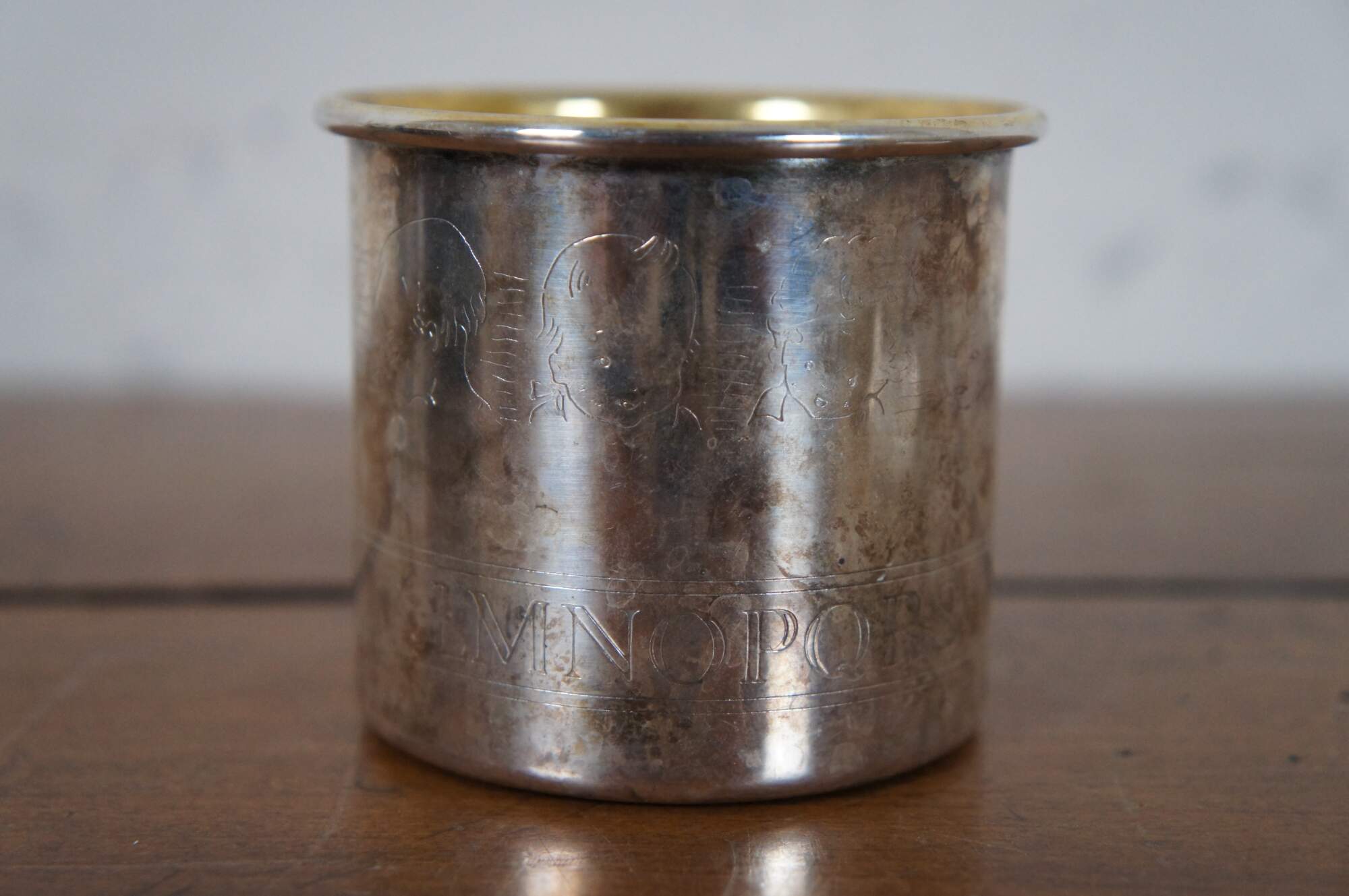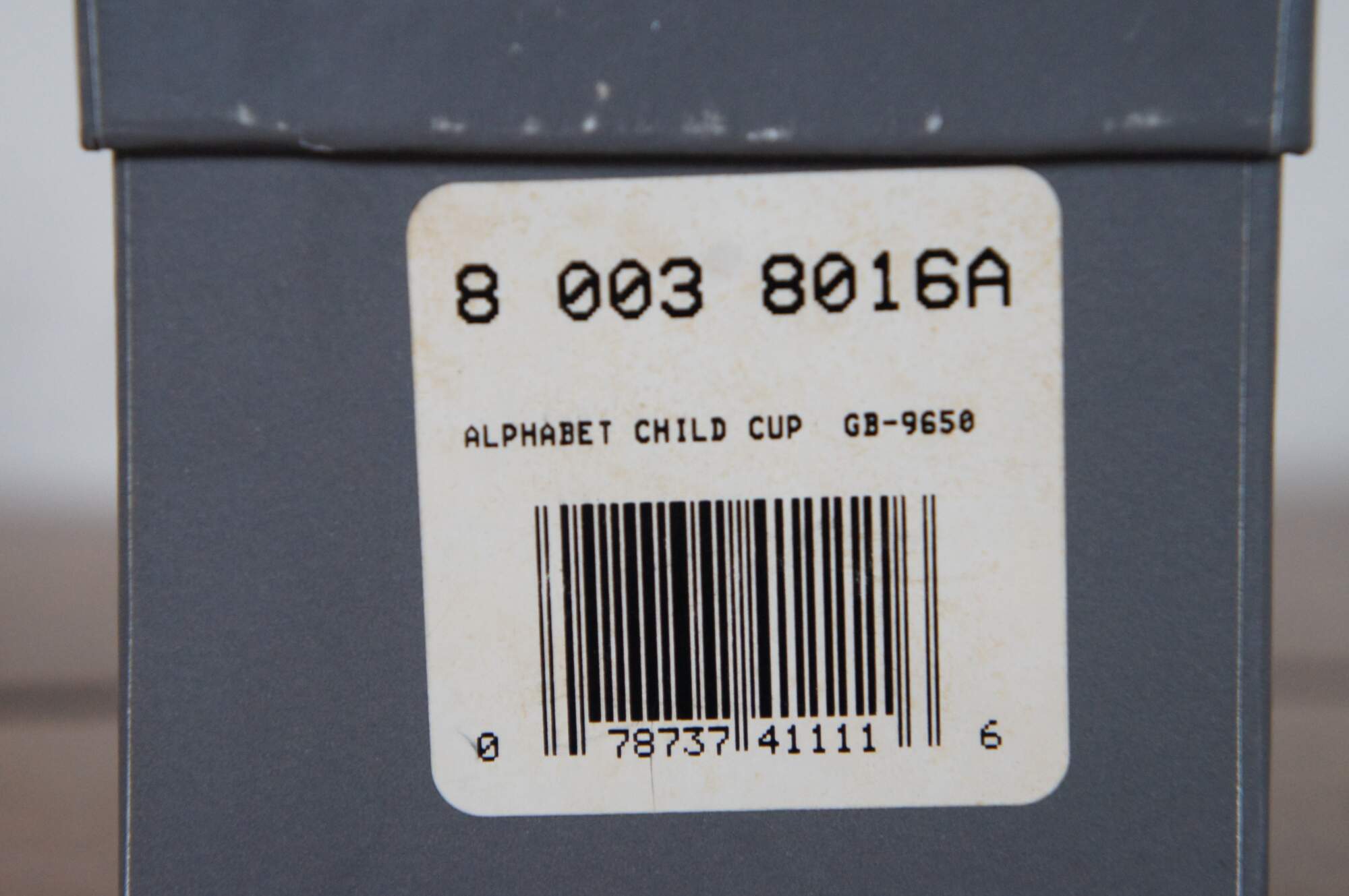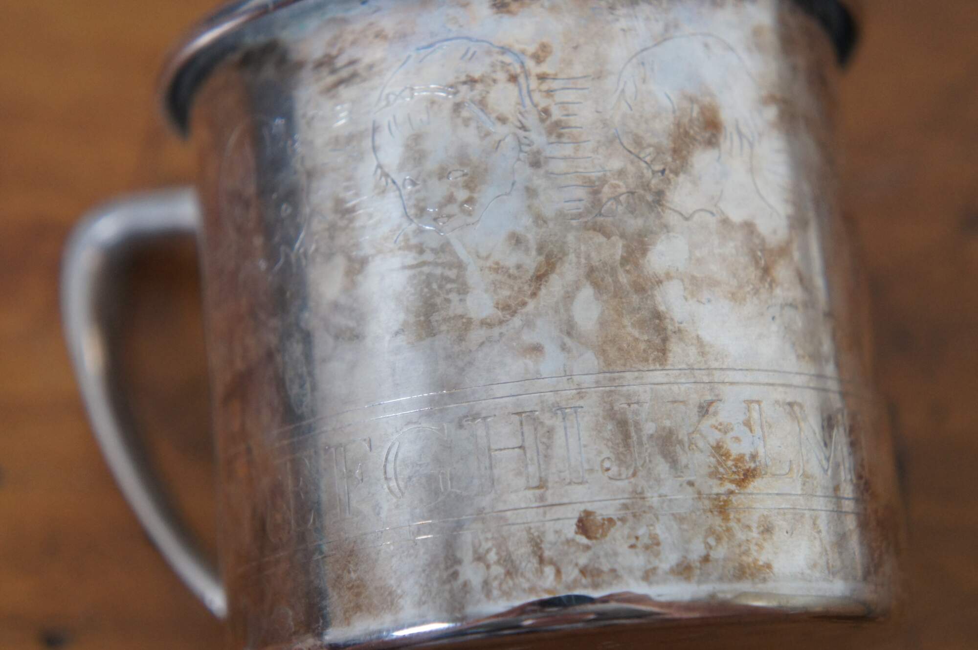 Vintage Oneida Silversmiths silver plate Alphabet Child Cup number BG-9650. Etched with the alphabet and baby faces. Includes plastic “sippy” top and original box.