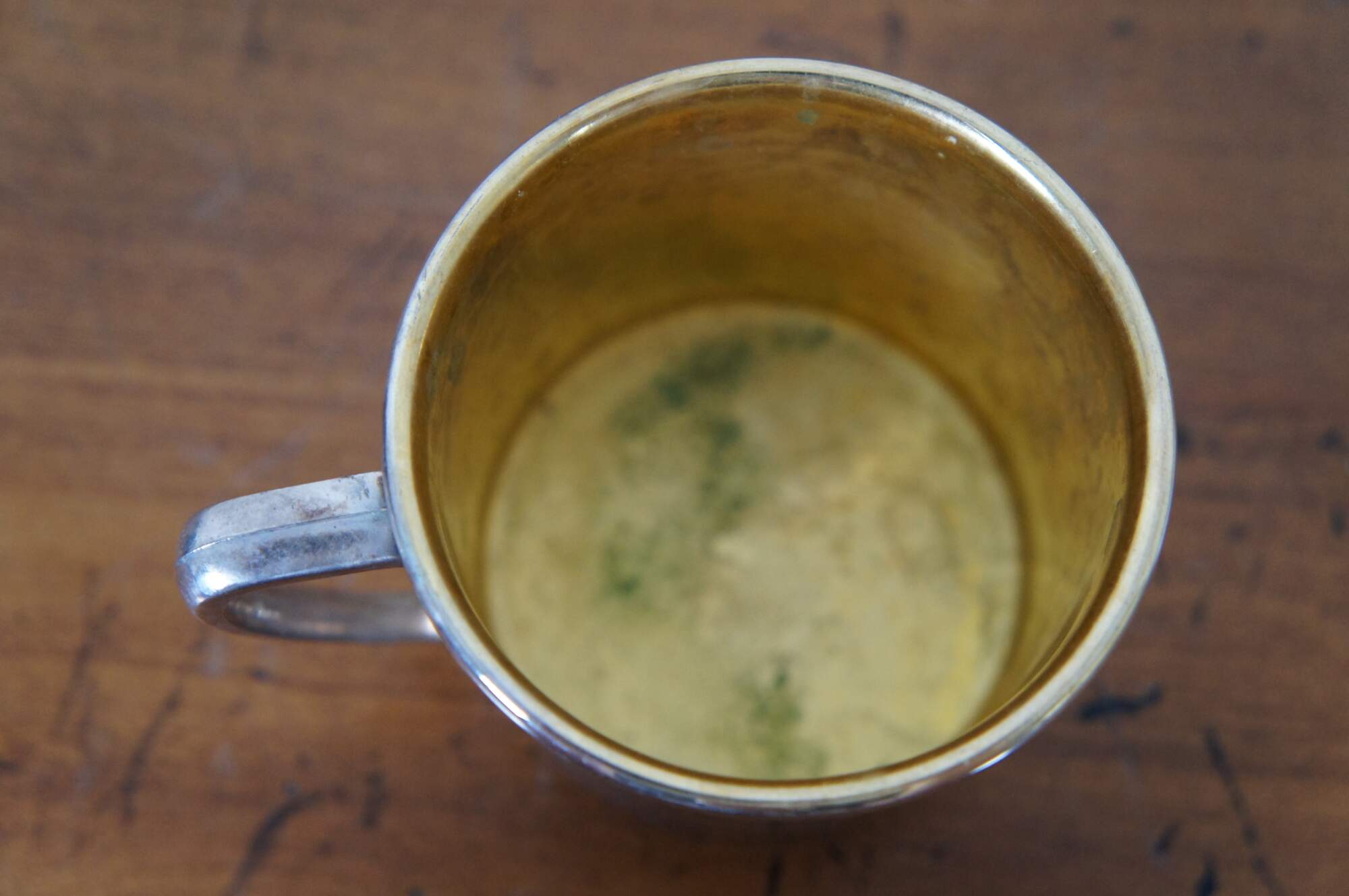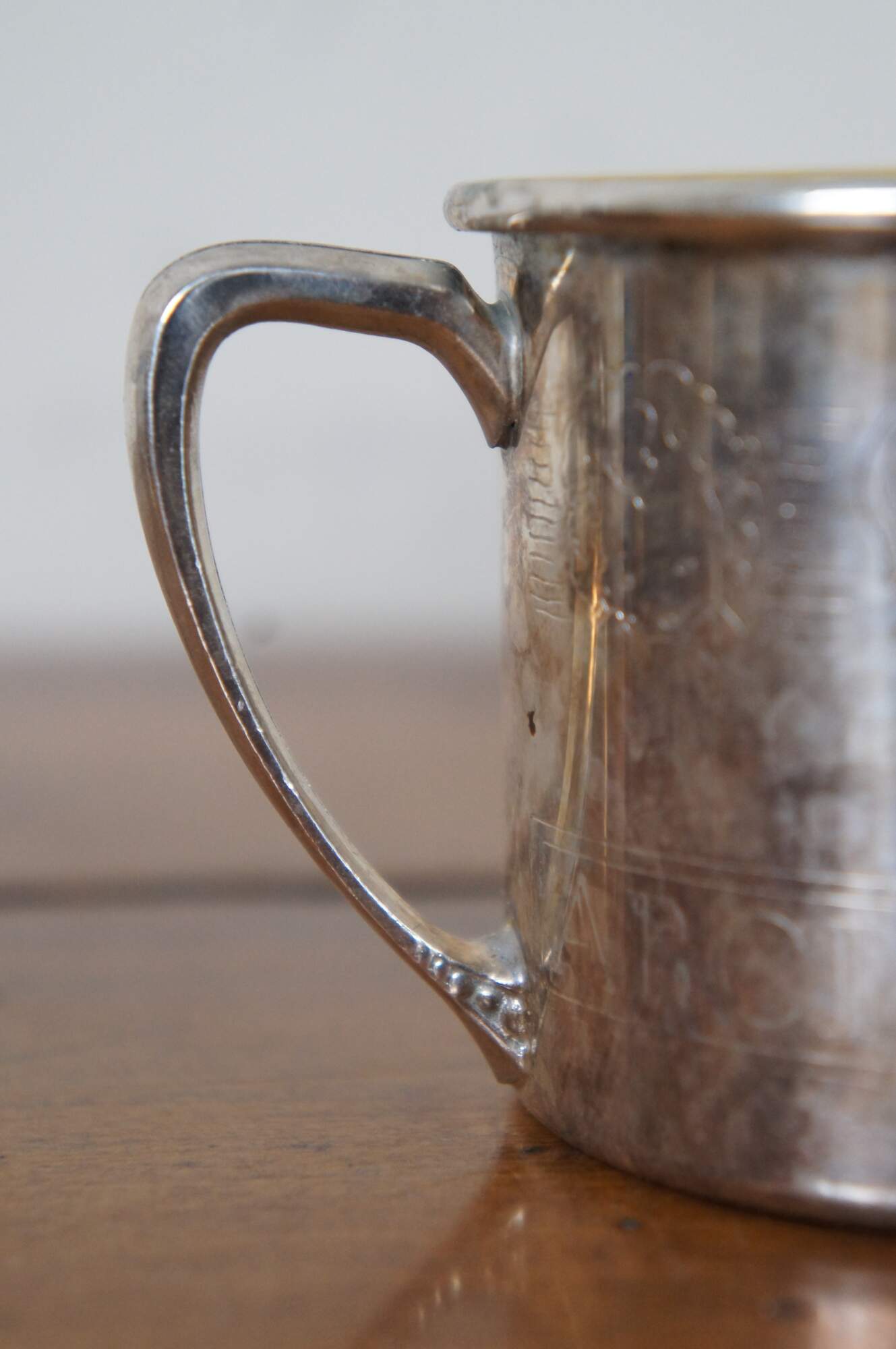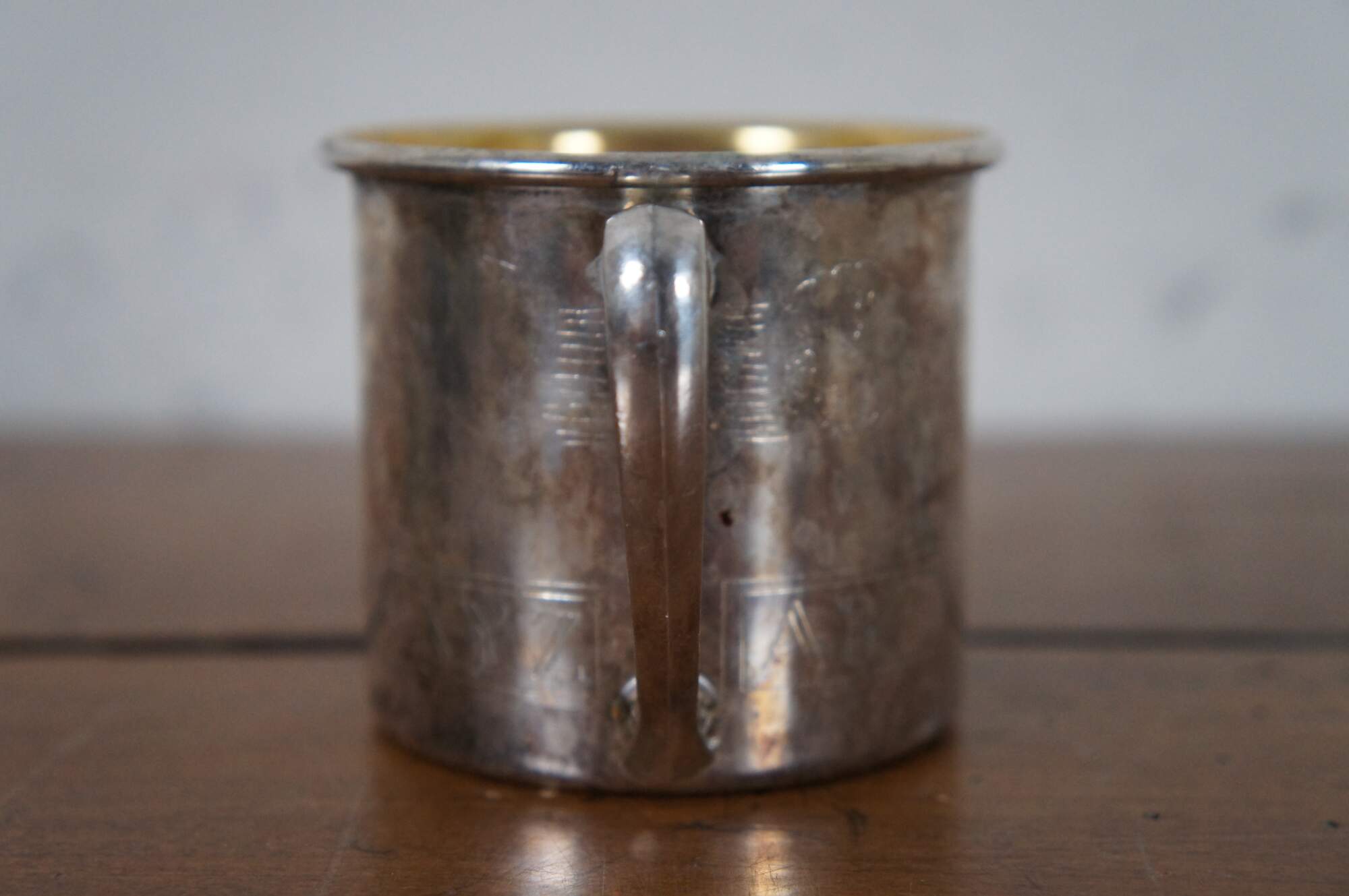 Vintage Oneida Silversmiths silver plate Alphabet Child Cup number BG-9650. Etched with the alphabet and baby faces. Includes plastic “sippy” top and original box.