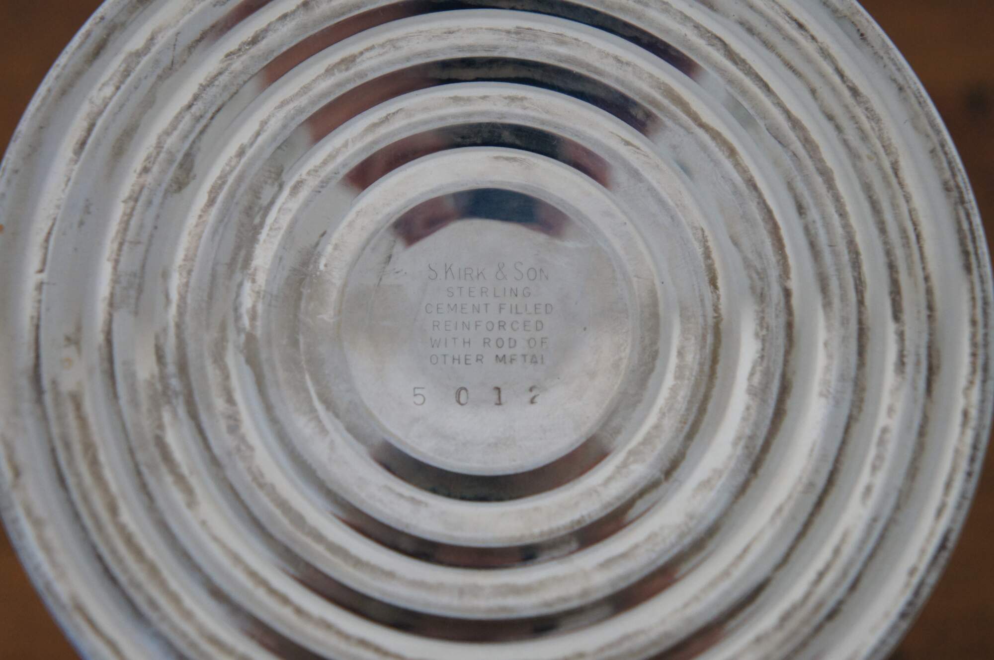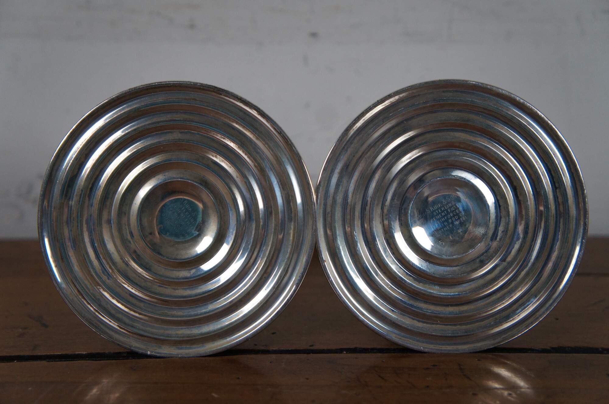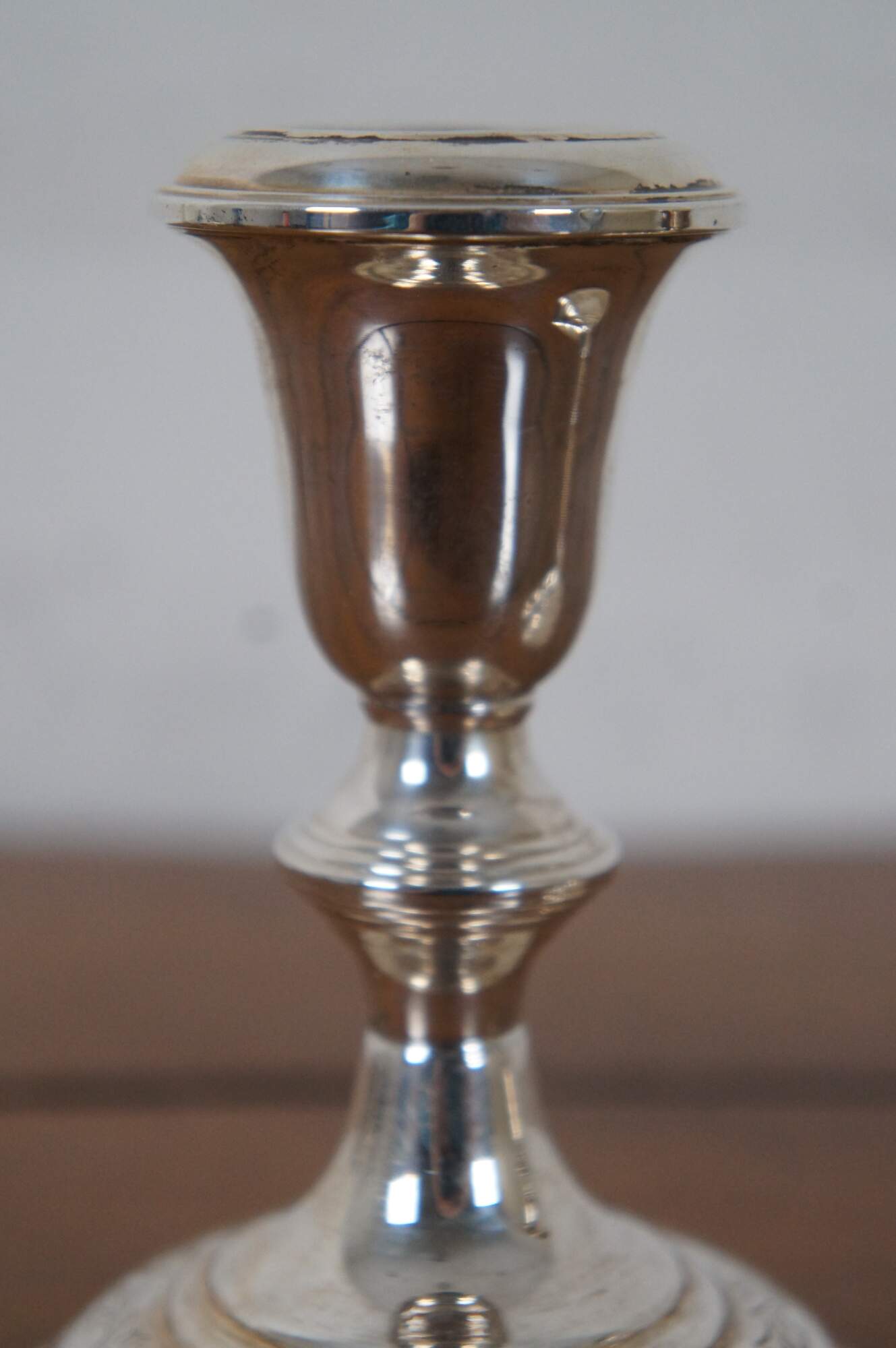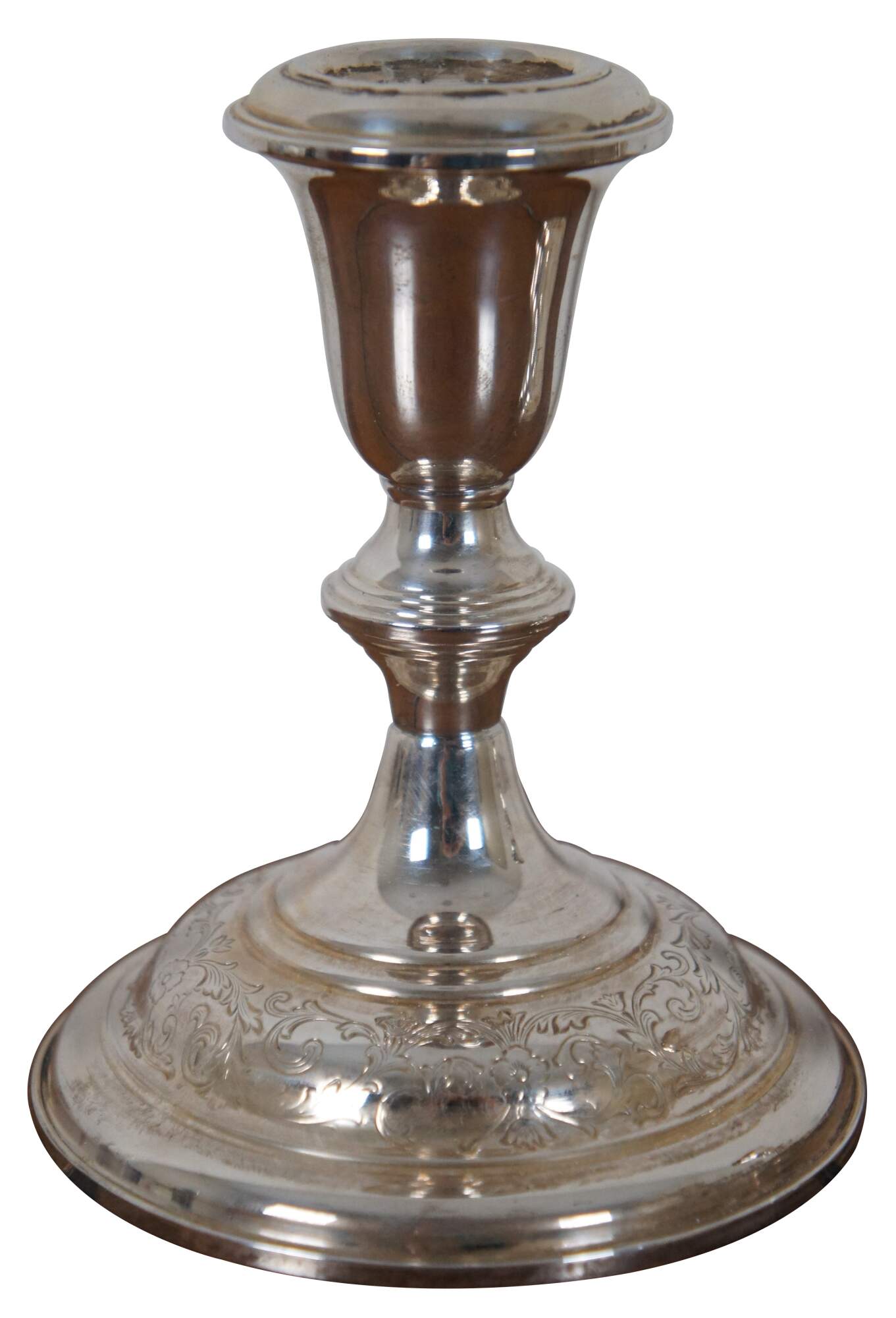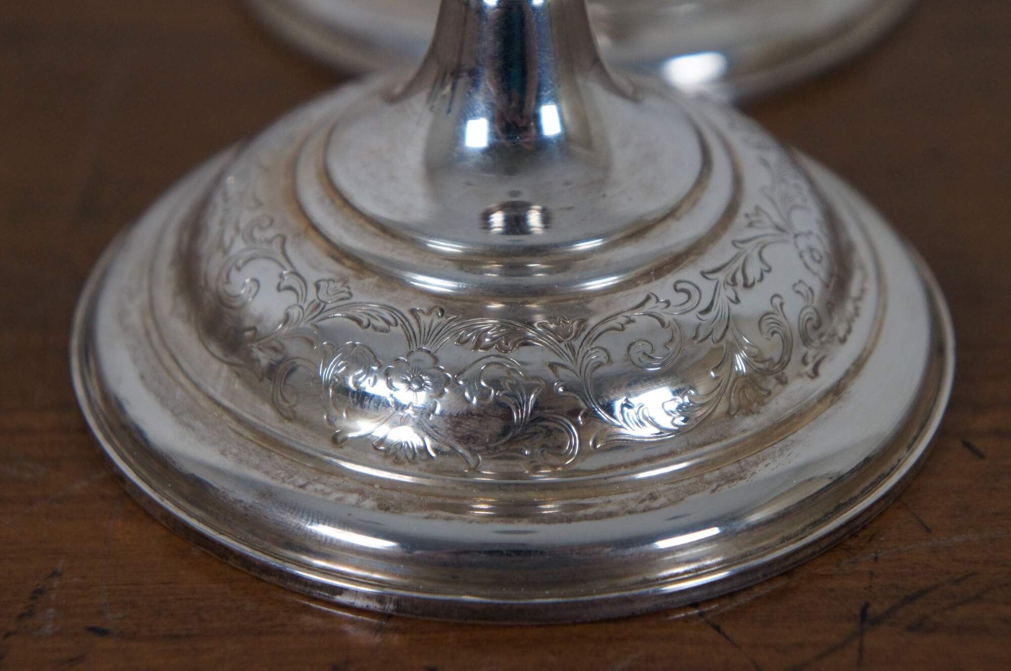 Pair of mid century S. Kirk & Son number 5012 reinforced sterling silver taper candlestick holders with etched floral pattern around the base.
