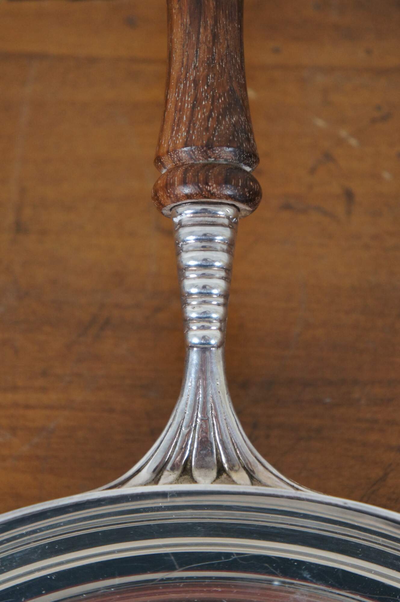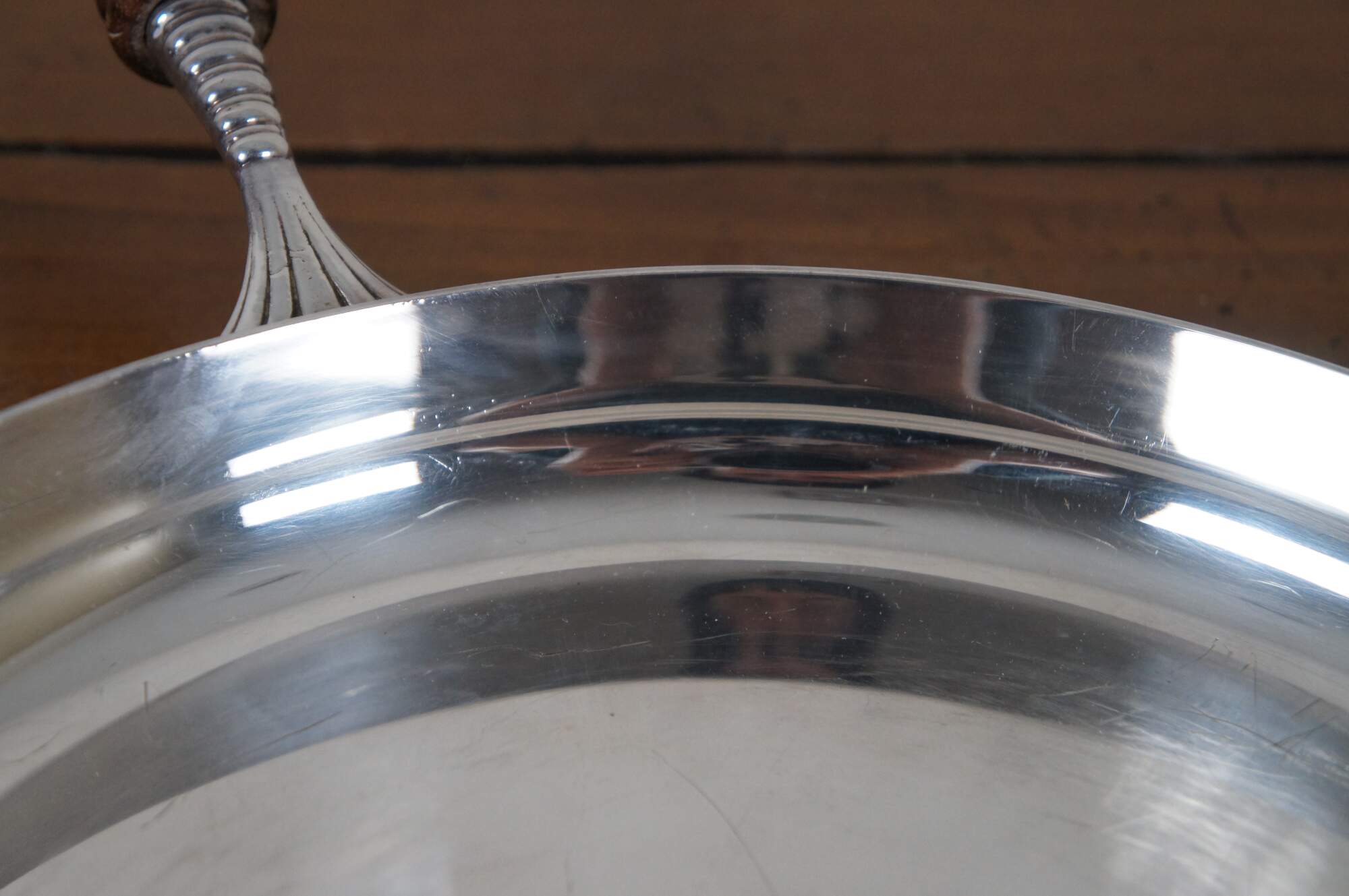 Vintage Italian silver plate frying pan or skillet with wooden handle and hanging ring. Marked Italy with a logo that appears to be a P above and M.