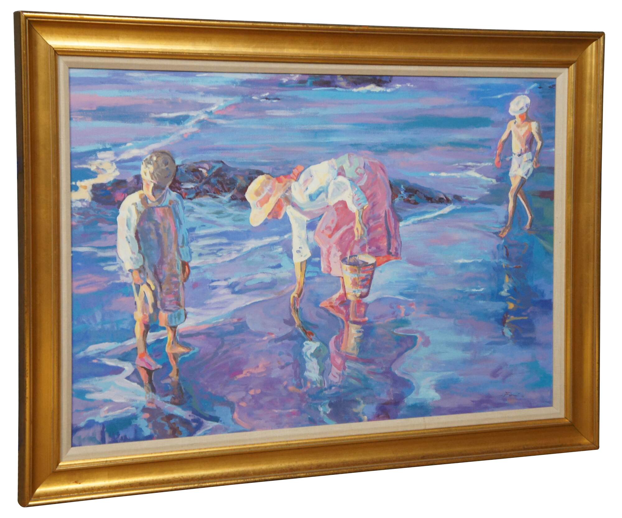 Vintage reproduction oil painting on canvas featuring a beach landscape scene showing three figures collecting shells. Signed lower left, circa 1991. After Donald Eric Hatfields "Shimmering Sand".