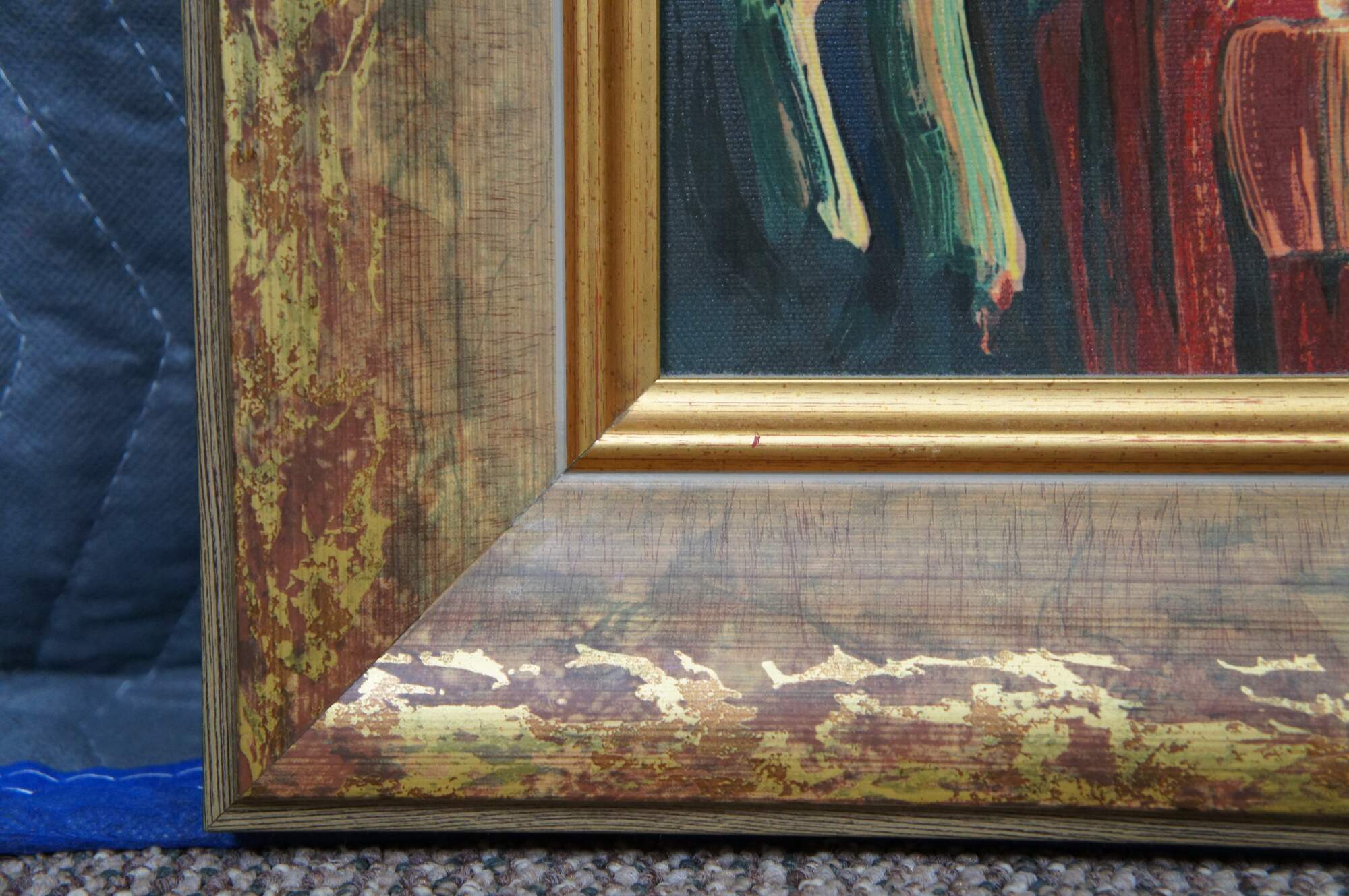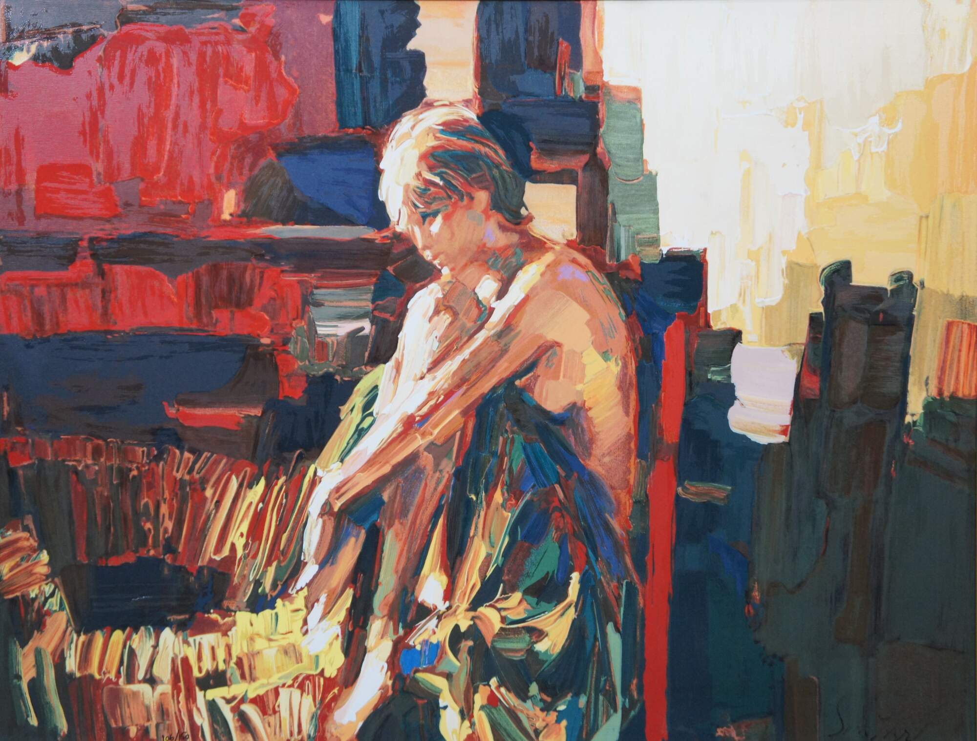 Vintage framed giclee on canvas showing a seated topless figure in an abstract room of red, blue, and green, by Nicola Simbari. Titled “Apres le Bain” (After Bath), hand signed and numbered 106/150, published by Vendome Editions, circa 2002. Includes COA.
