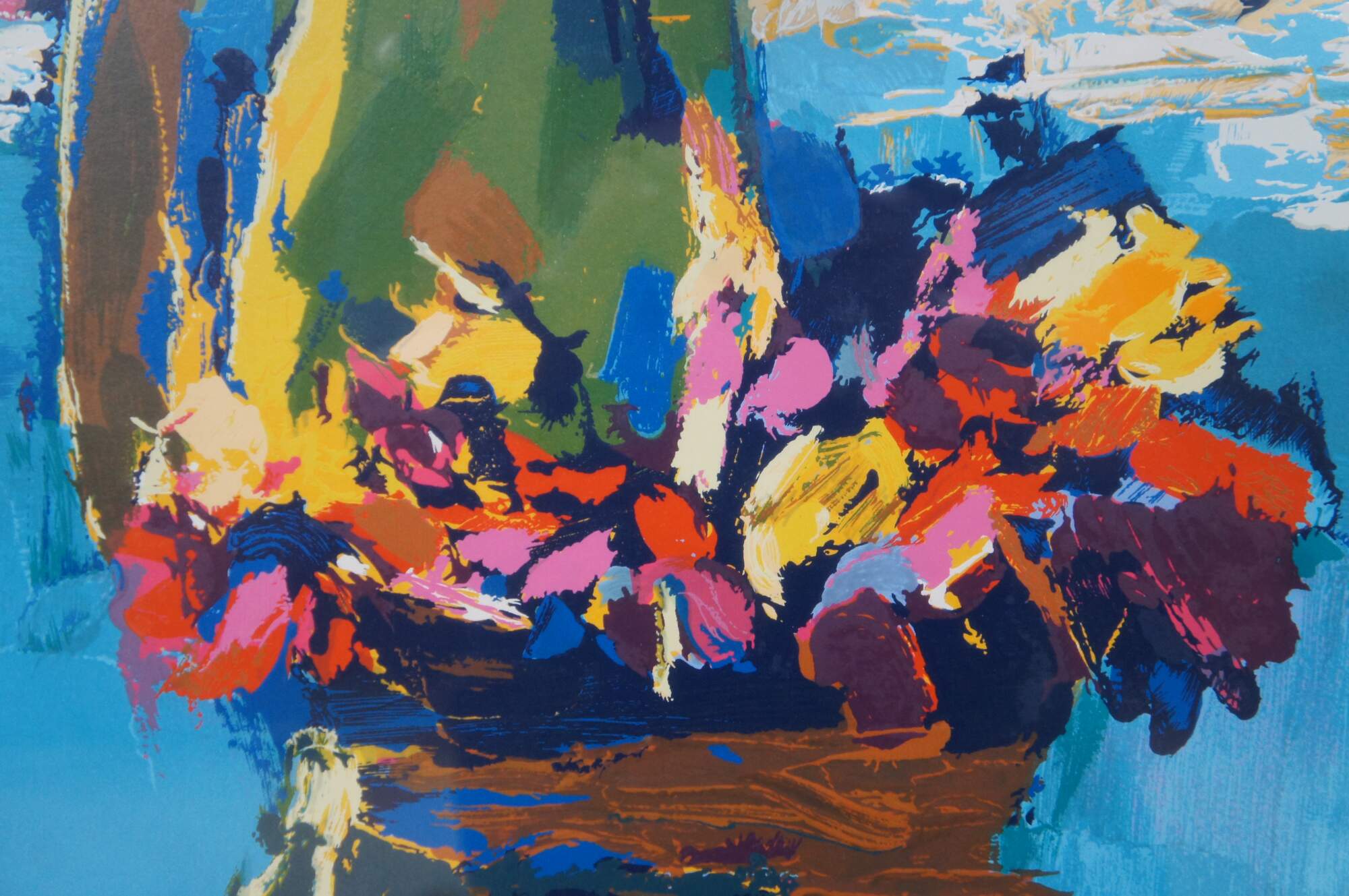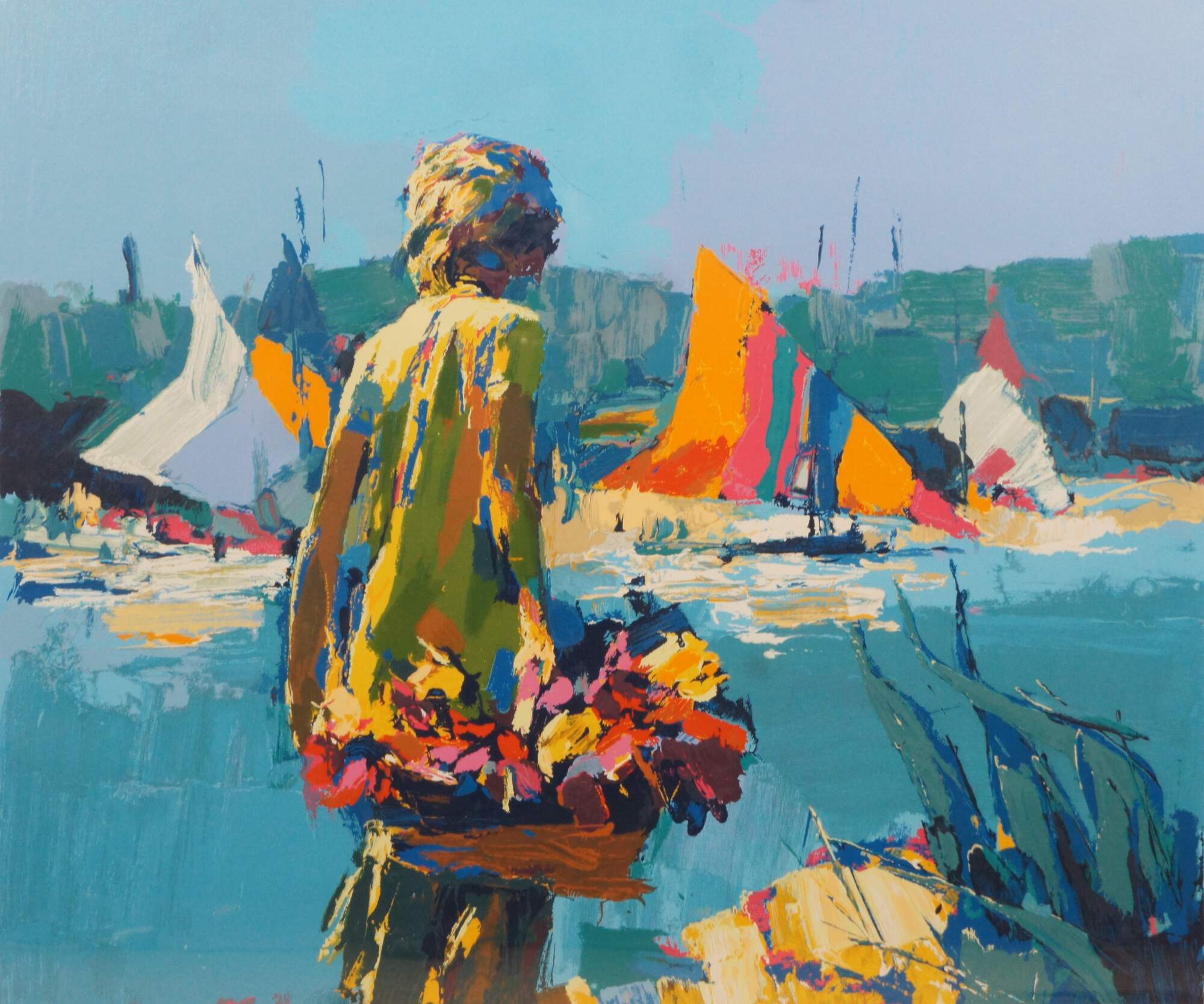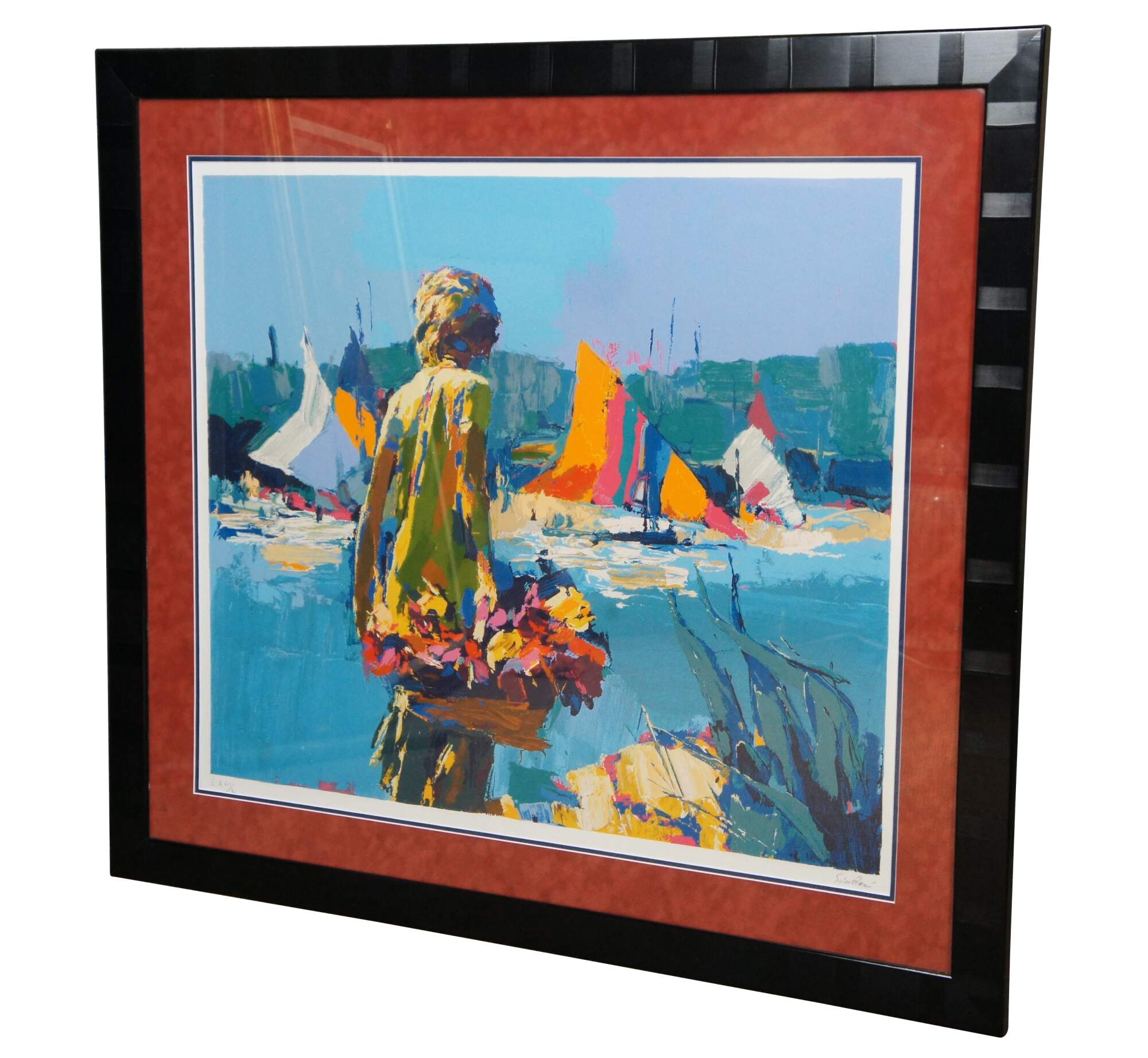 Vintage framed serigraph on paper showing a figure carrying a basket of flowers in front of a nautical / maritime water scene with brightly colored sail boats by Nicola Simbari. Titled “Summertime,” pencil signed and numbered EA VIII/L. Circa 1980.