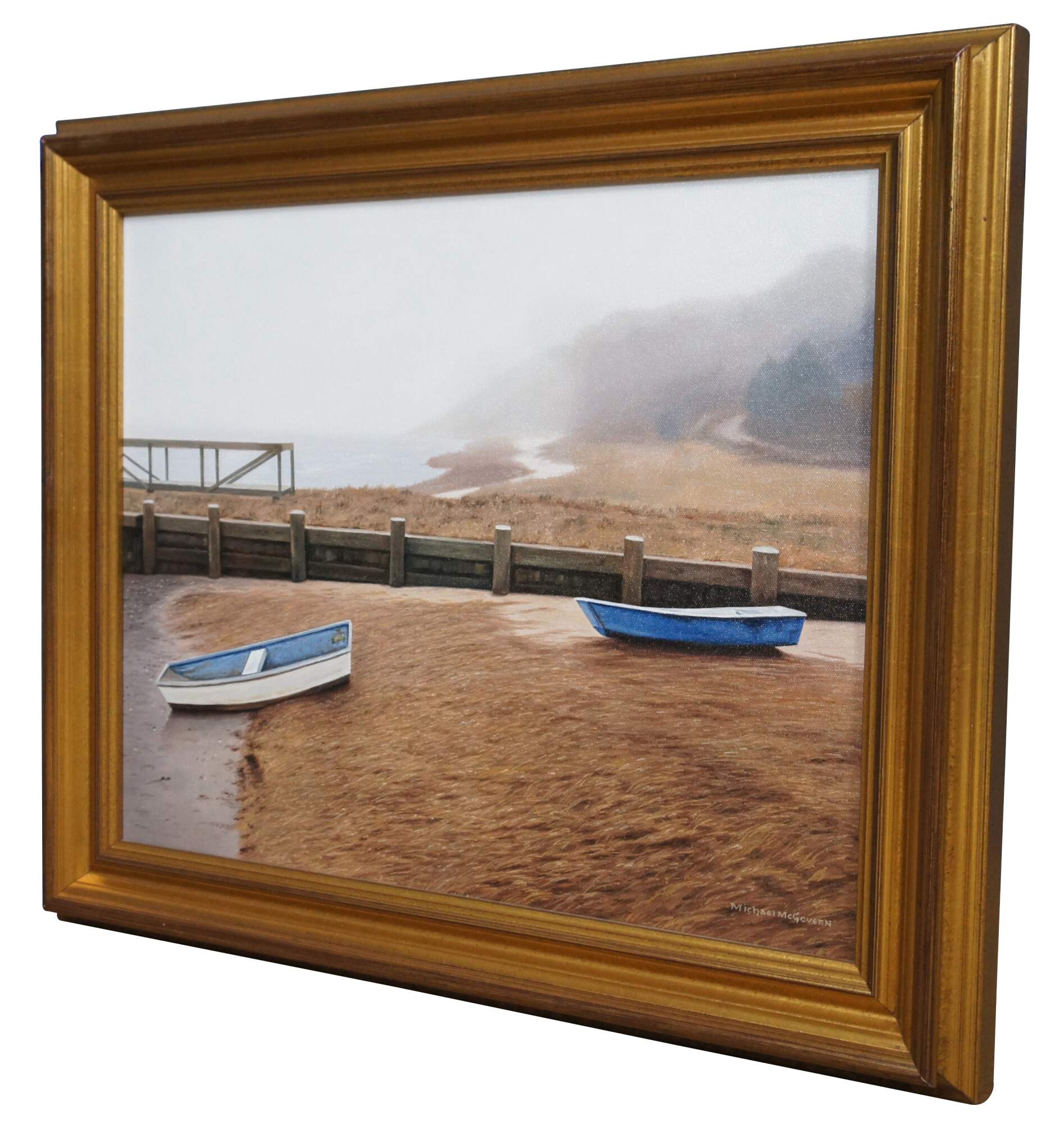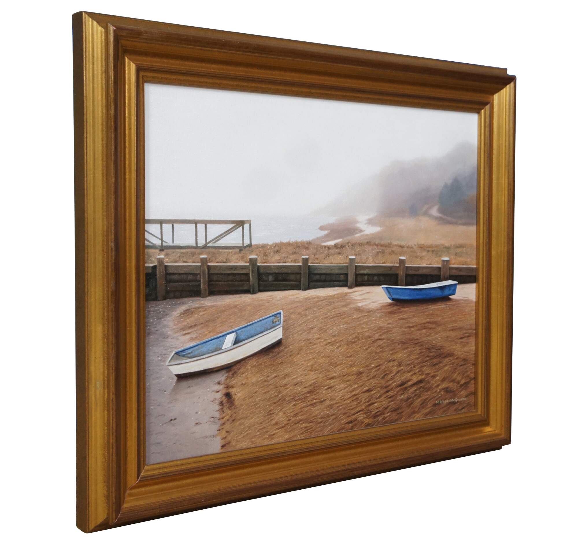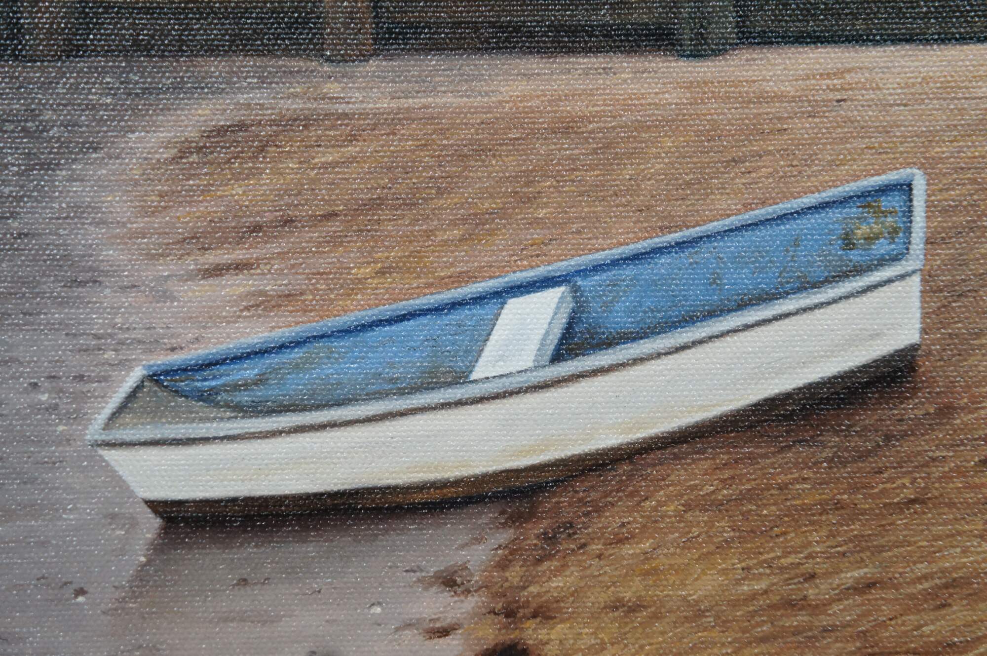 Vintage beach seascape oil painting on canvas featuring a coastal landscape with a pair of row boats pulled onto the shore near a dock. Signed in lower left. Titled “Grounded” Attributed to Nantucket.