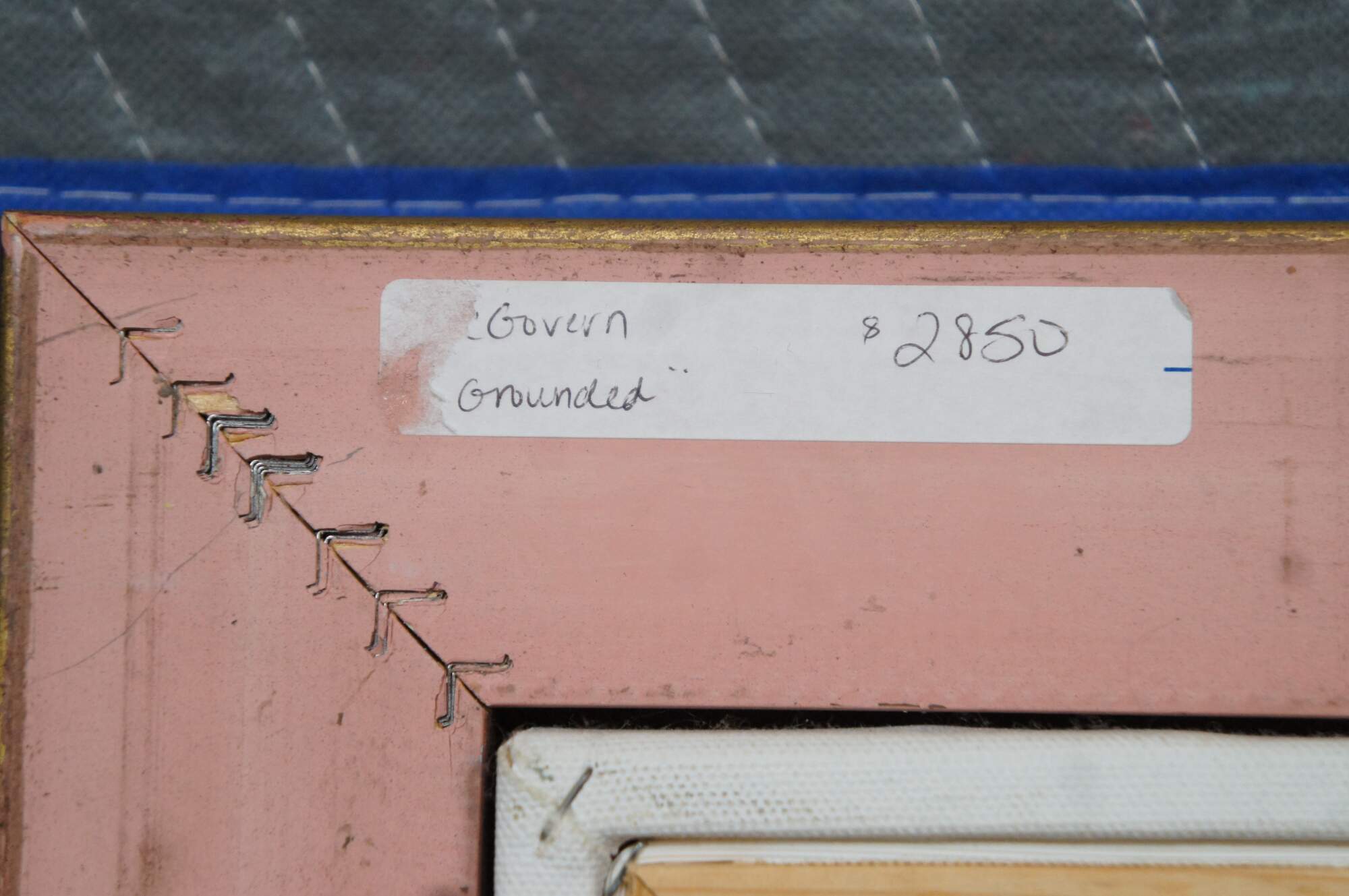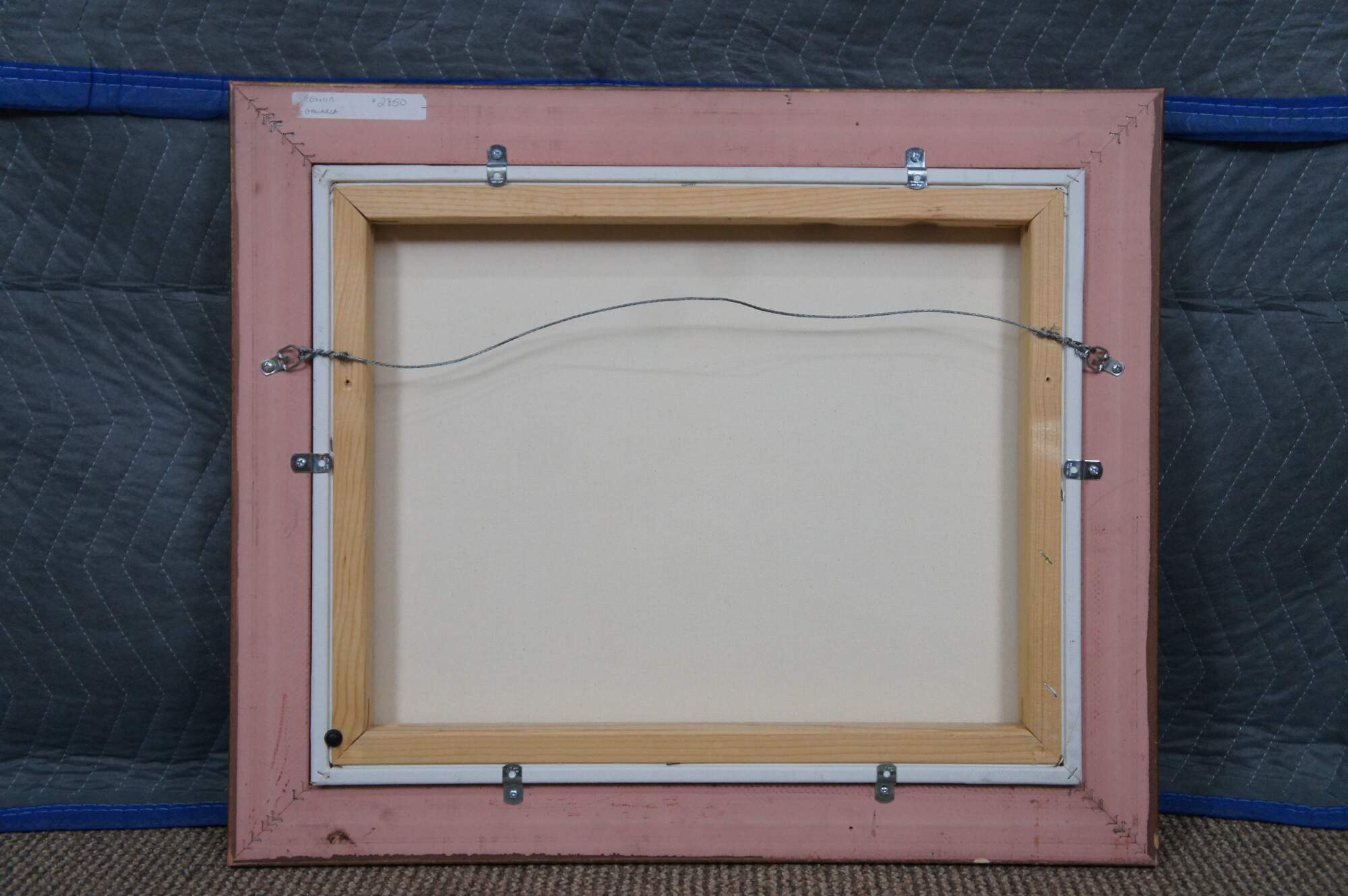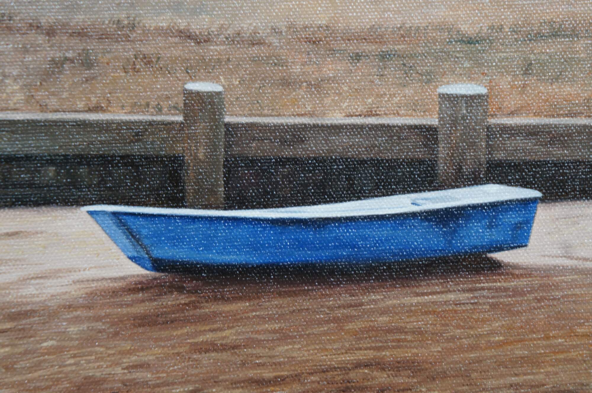 Vintage beach seascape oil painting on canvas featuring a coastal landscape with a pair of row boats pulled onto the shore near a dock. Signed in lower left. Titled “Grounded” Attributed to Nantucket.