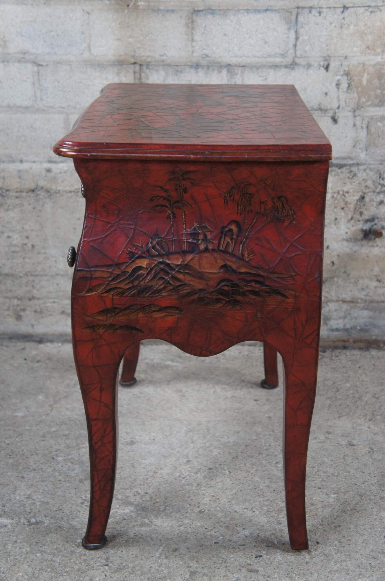 2 Chinese nightstands or side tables, circa 1990s. A french inspired bombe form finished in red with a crackle finish and painted chinoiserie motif. Features two drawers and silver gadrooning drawer pulls.