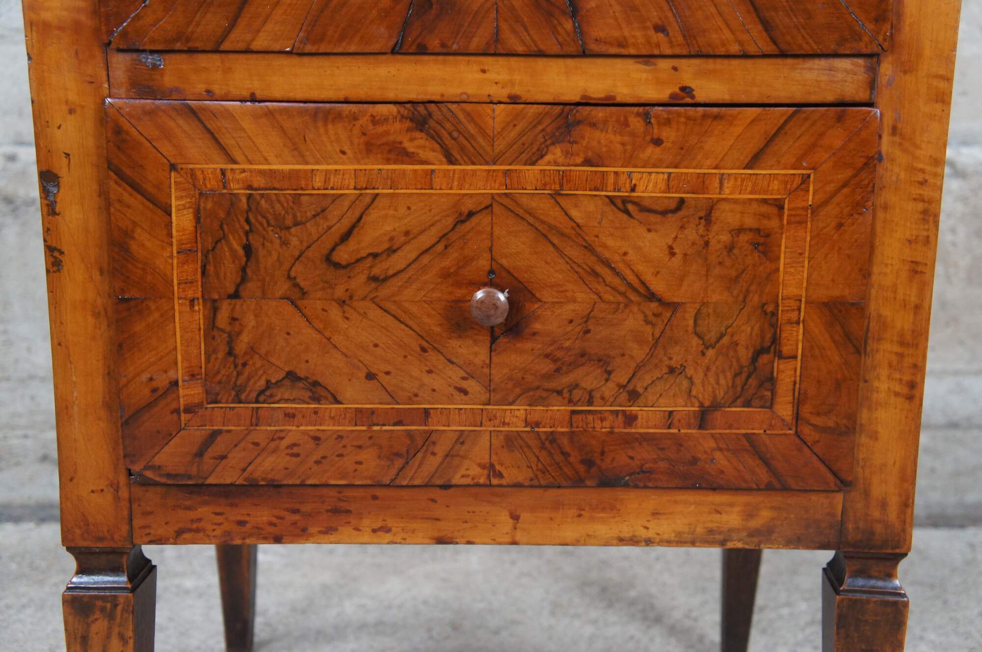 Italian Neoclassical commode or bedside chest, circa first half 19th century. Made from walnut and fruitwood with 2 hand dovetailed drawers of pine construction. The table top and drawer fronts feature a beautiful matchbook veneer with banding and inlay. The table is raised over four square tapered legs. A warming addition to any space.