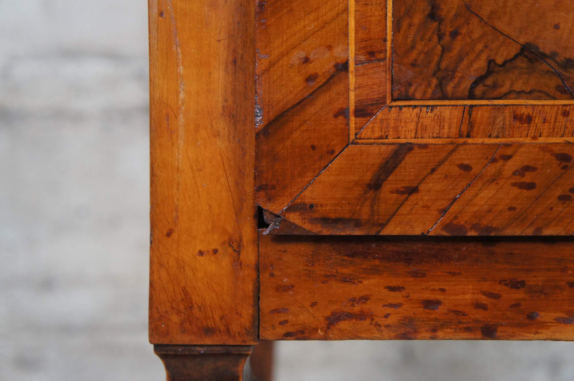 Good antique condition with wear and distressing commensurate with age. Some staining/finish wear to the top. splitting the veneer as wess as a chip to the lower left edge of drawer.