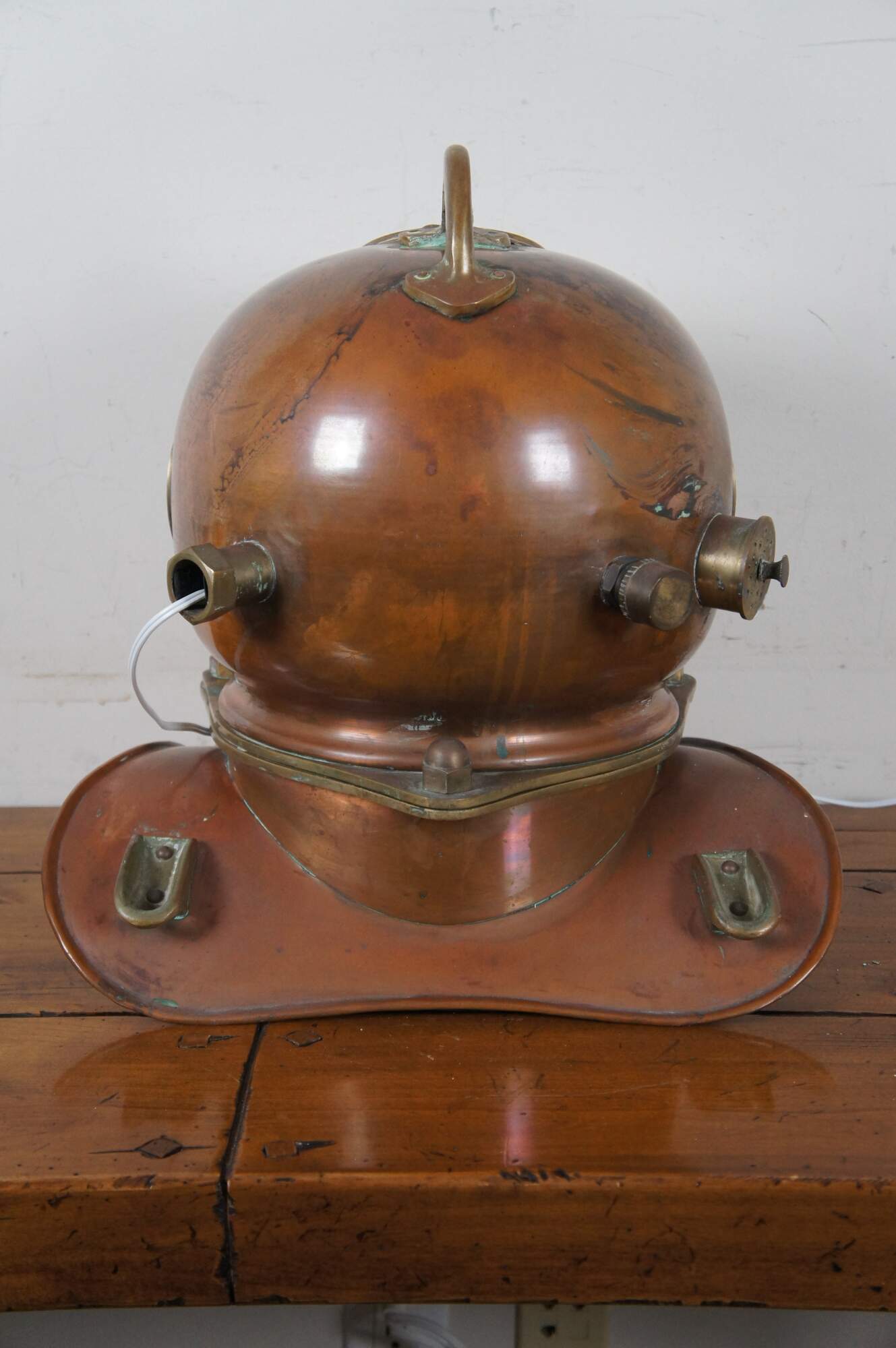 Vintage full size reproduction copper and brass deep sea diver’s helmet, converted to a night light or lamp.