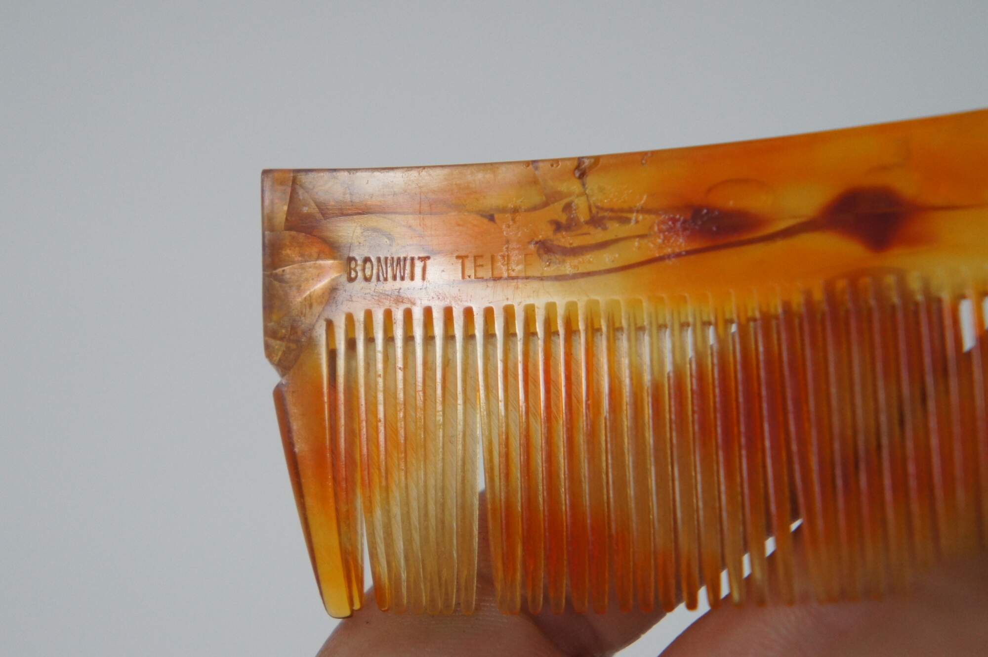 Set of five vintage and antique celluloid combs including one Ivry Pyralin, one matching but unmarked, one green and black with hand painted flowers, one transparent Gemlite with floral brass handle, and one Bonwit Teller faux tortoiseshell with the pieces of the original case decorated with bees.