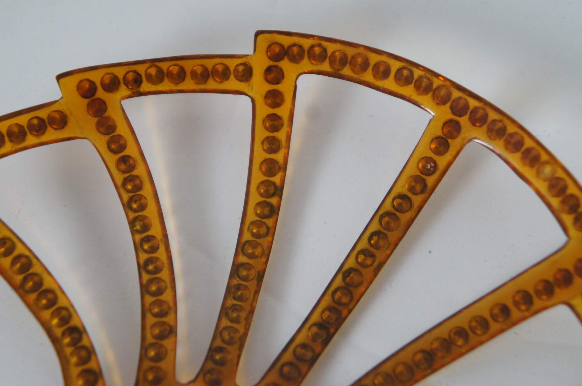 Antique art deco amber celluloid decorative hair comb with pierced fan shape decorated with amber rhinestones.