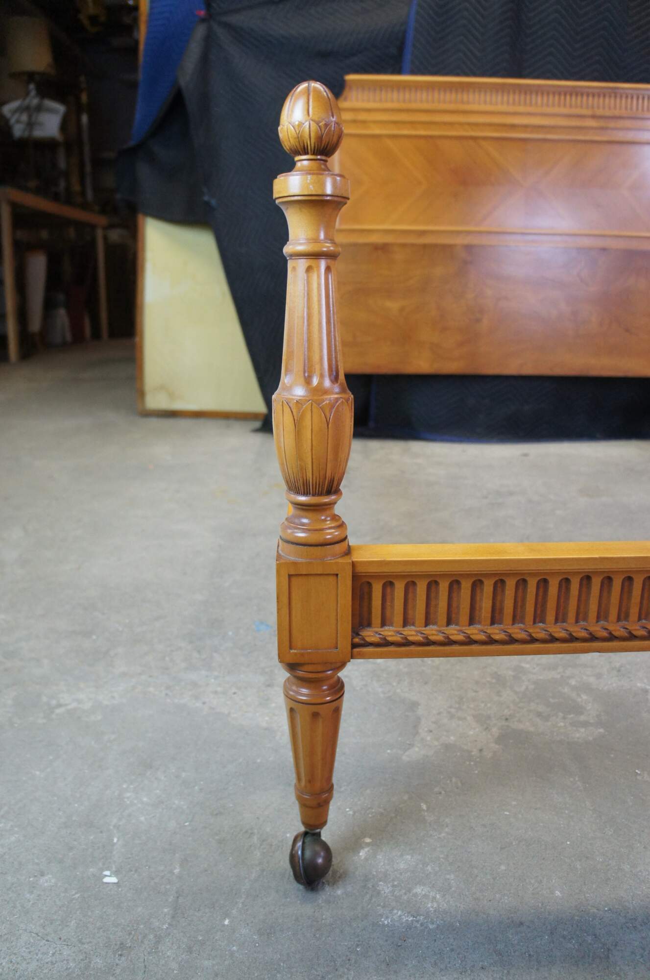 An exquisite antique French Louis XVI Neoclassical bed frame by Robert W. Irwin Furniture Company. Circa 1928-1940. Crafted from satinwood featuring turned and fluted columns, artichoke finials, fluted head and footboard and turned tapered feet leading to (removable) casters. The headboard has an eye catching matchbook veneer design fitted with rectangular molding.