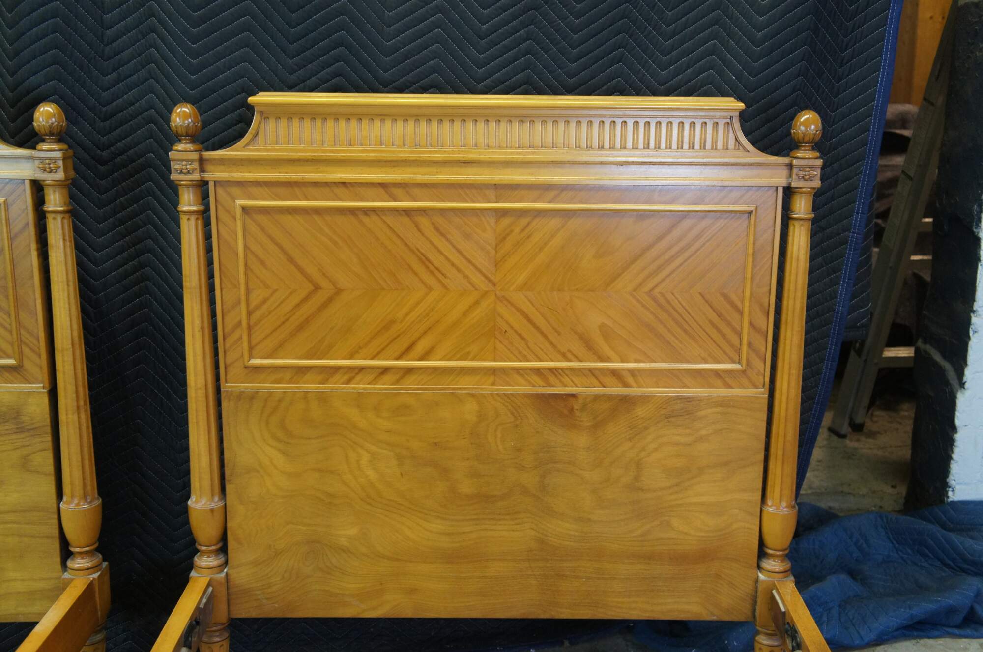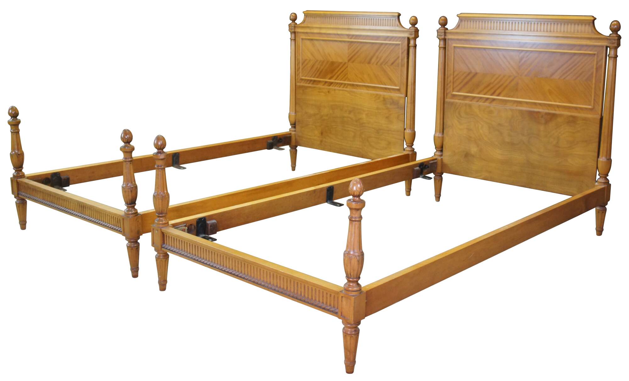 An exquisite pair of antique French Louis XVI Neoclassical bed frames by Robert W. Irwin Furniture Company, Circa 1928-1940. Crafted from satinwood featuring turned and fluted columns, artichoke finials, fluted head and footboard and turned tapered feet. The headboards have an eye catching matchbook veneer design fitted with a rectangular molding.