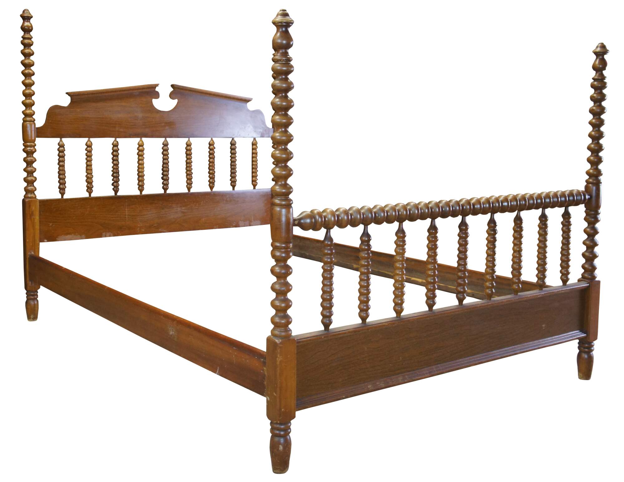 Vintage Jenny Lind style full size spindle bed. Made from oak with an open pediment and bobbin turned posts.
