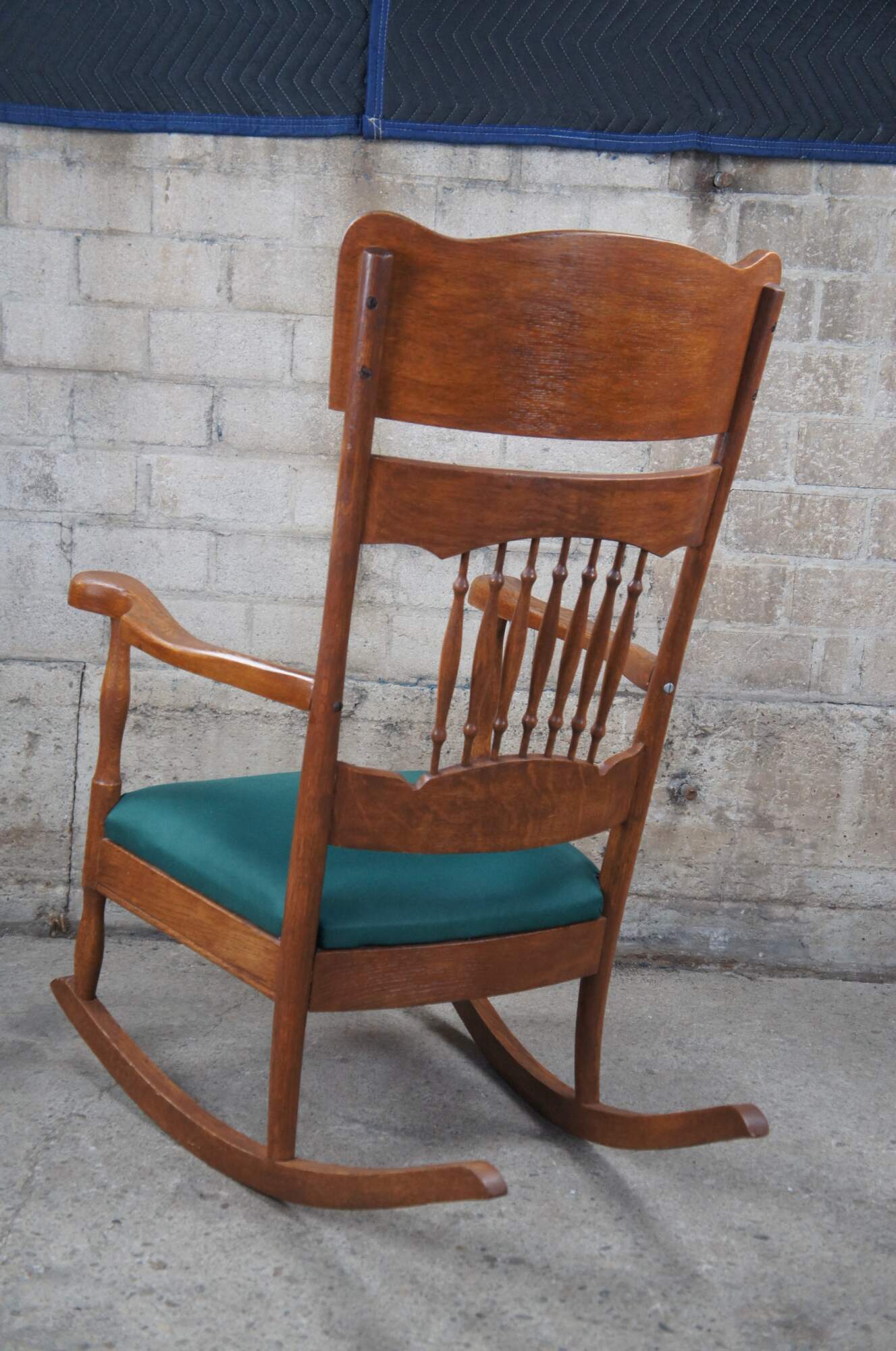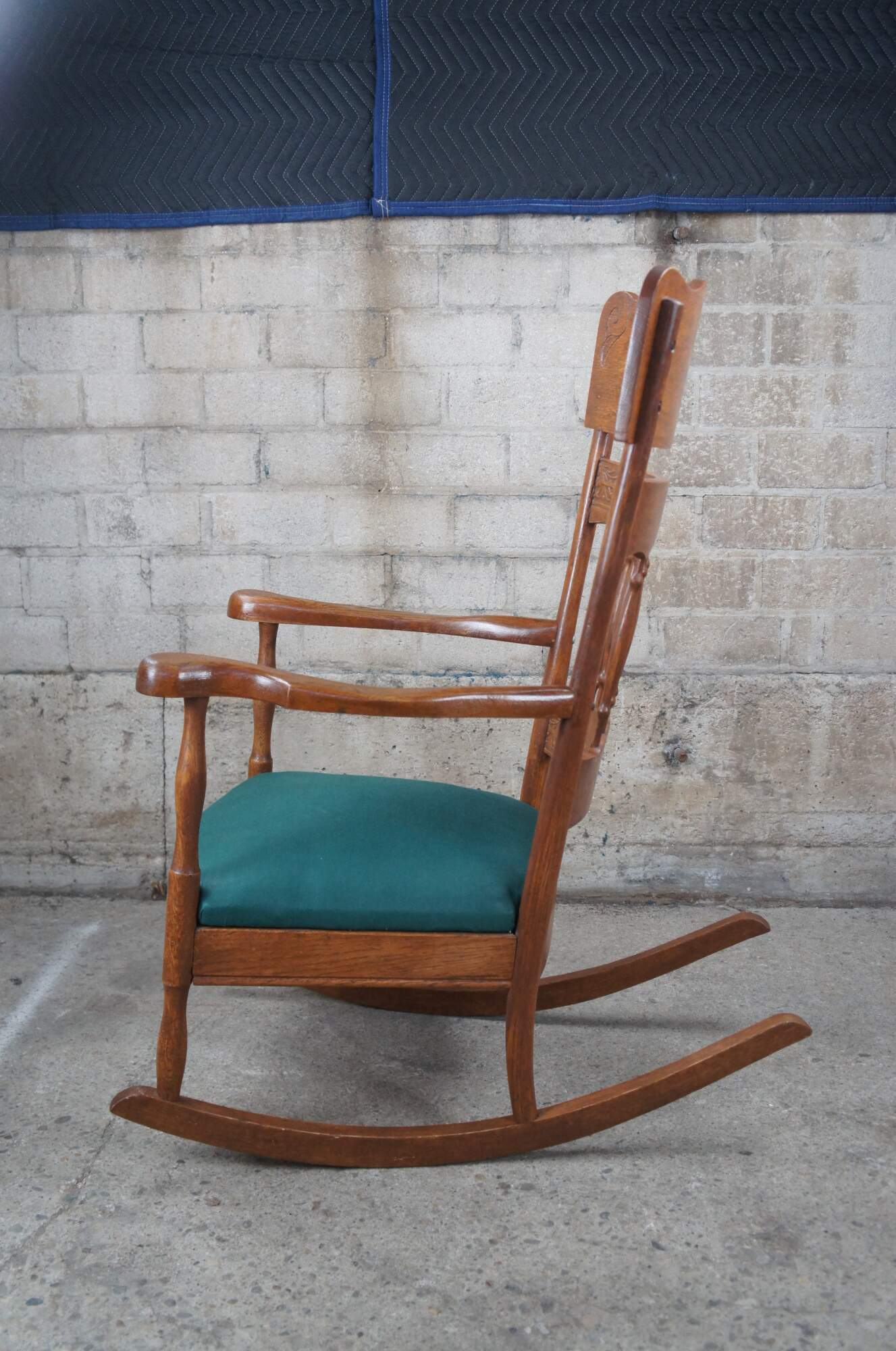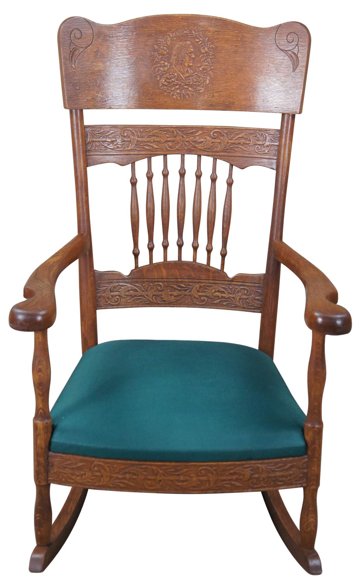 Antique late Victorian pressback rocking chair. A beautiful design featuring a serpentine crest rail with a laurel wreath wrapped cameo at the center featuring a distinguished gentleman. The cameo is flanked by decorative engravings along the shoulders of the back and perfectly placed over an elegant serpentine cut stretcher of filigree foliate. The back of the chair is centered by seven turned spindles leading to a matched stretcher towards the lumbar area of the back. The chair features contoured arms and an upholstered seat. The front apron shows a matched design to the back and is placed between turned posts leading down to a long rocker base.