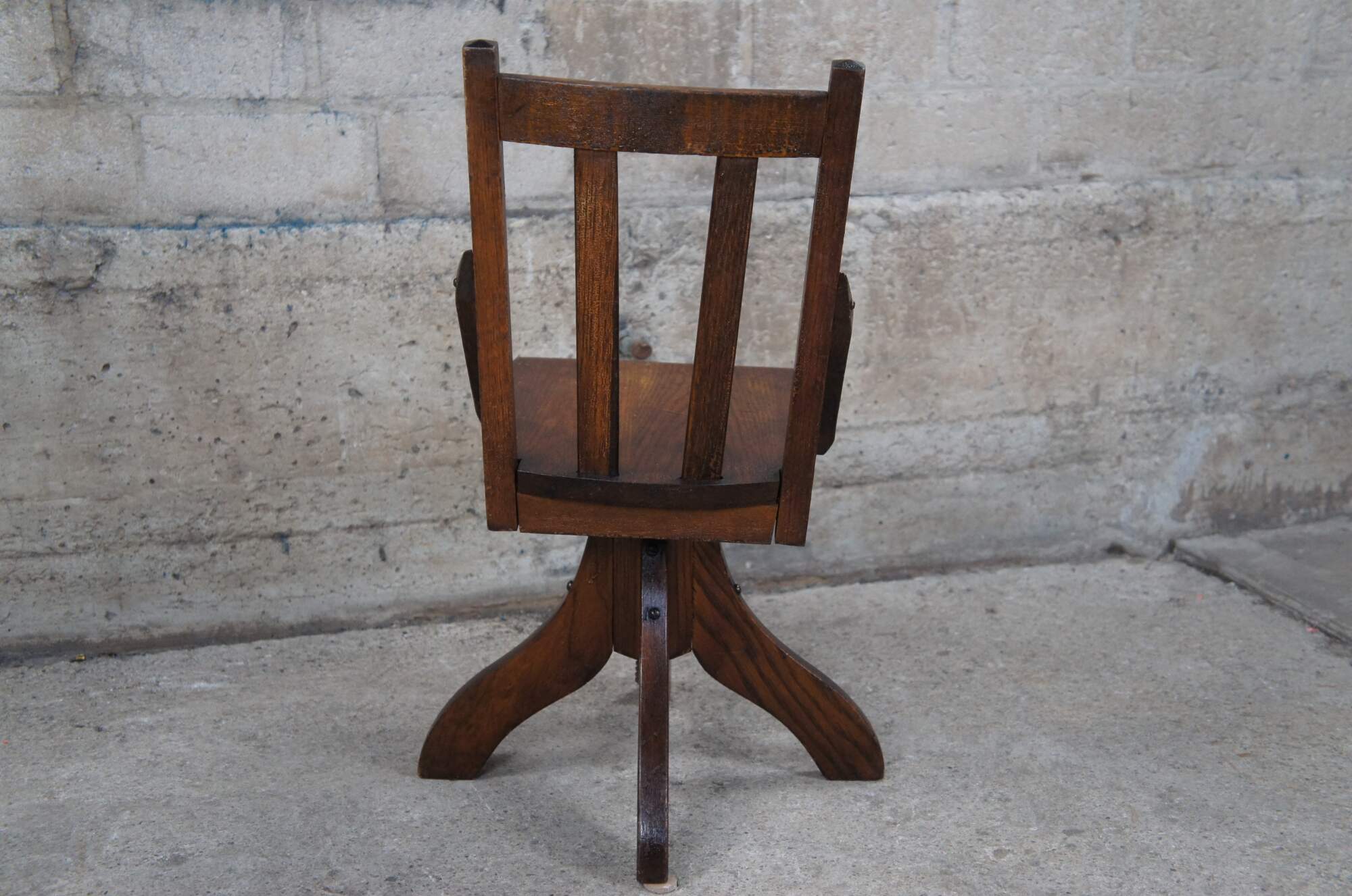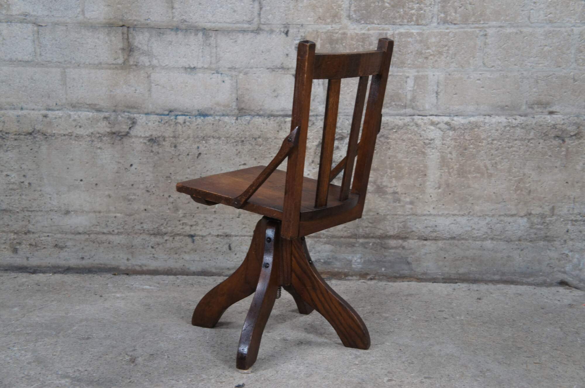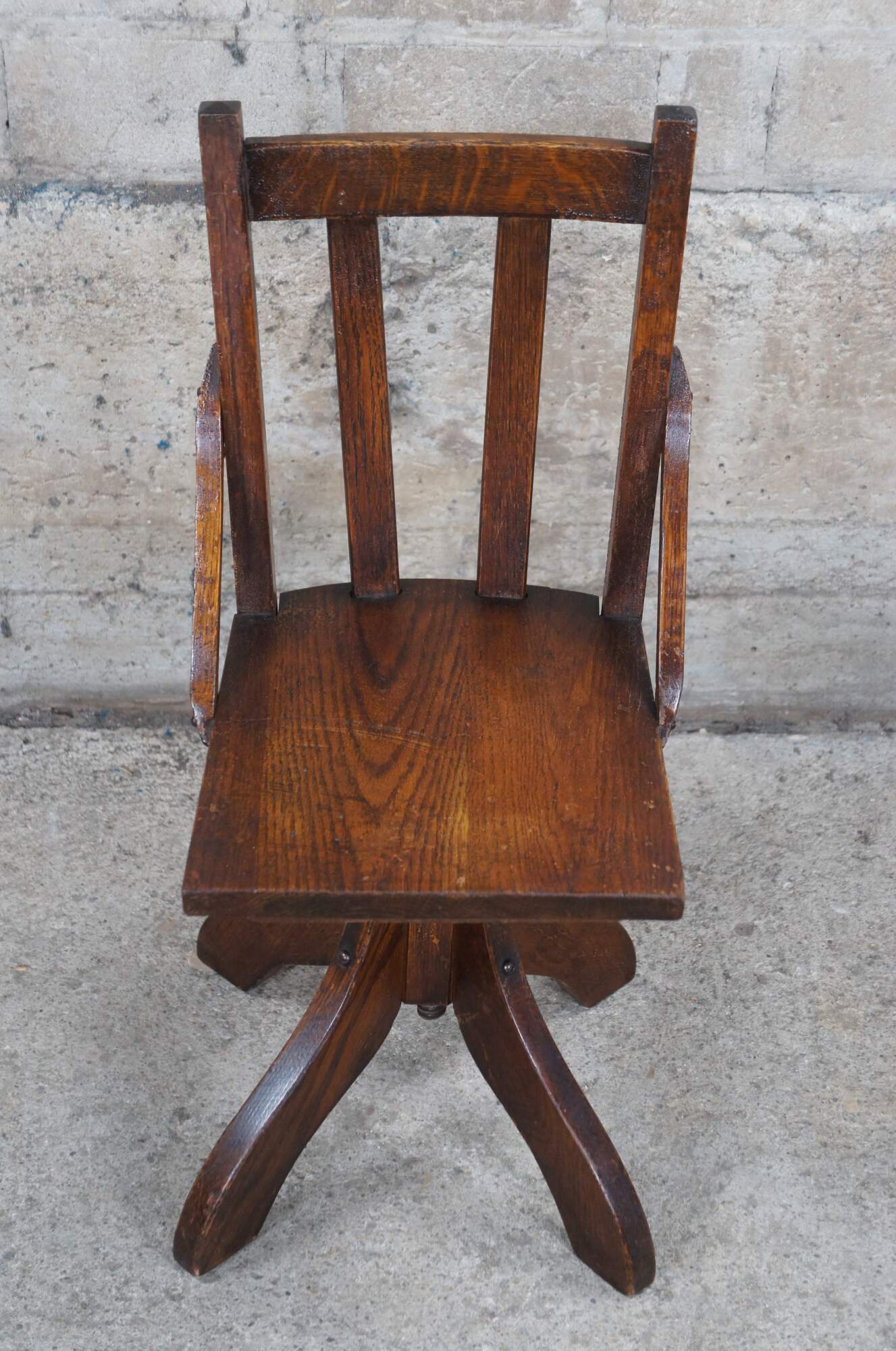 Late Victorian oak childs chair. A braced slat back over 4 legged adjustable swiveling base. A fun addition to any space.