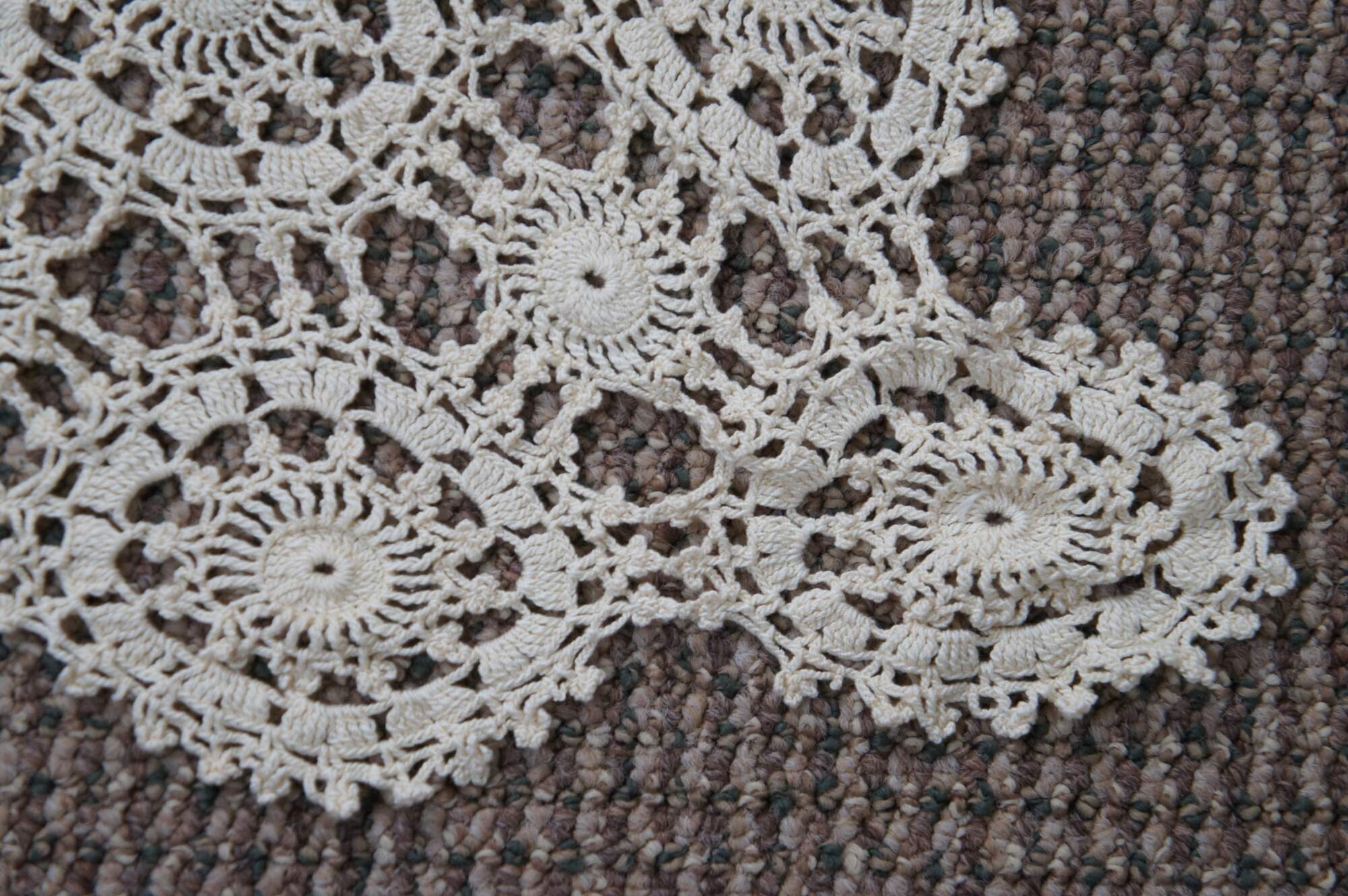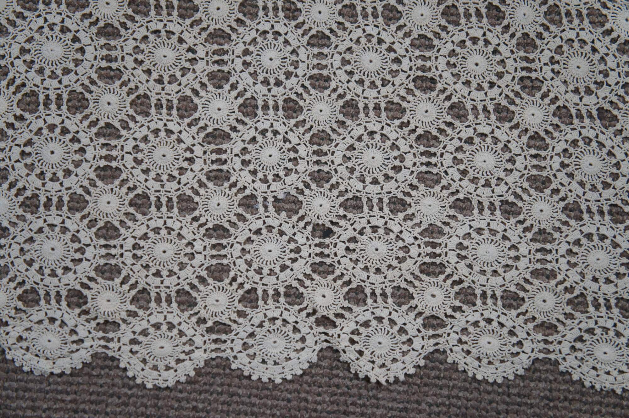 Vintage off-white handmade crochet tablecloth or coverlet, 72” square with scalloped edges featuring a pattern of geometric floral medallions.
