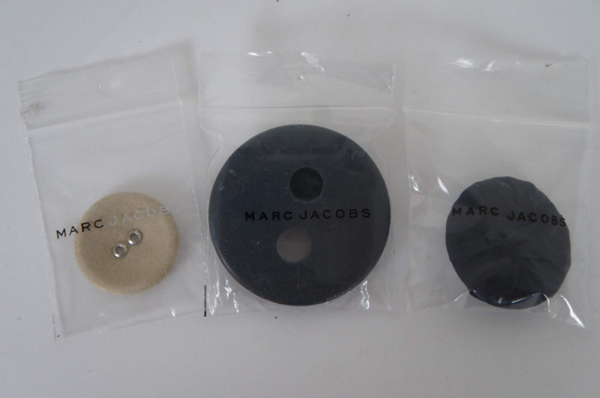 Lot of 33 set of assorted 100% Authentic packs of spare buttons, fabric swatches / patches, thread and shoe heels from a variety of designer clothing items. 4 Prada, 14 Chanel, 1 un-marked, 1 Zara, 1 Dolce & Gabbana, 1 See by Chloe, 1 Gucci, 2 Burberry, 1 Grace Sun, 7 Marc Jacobs.