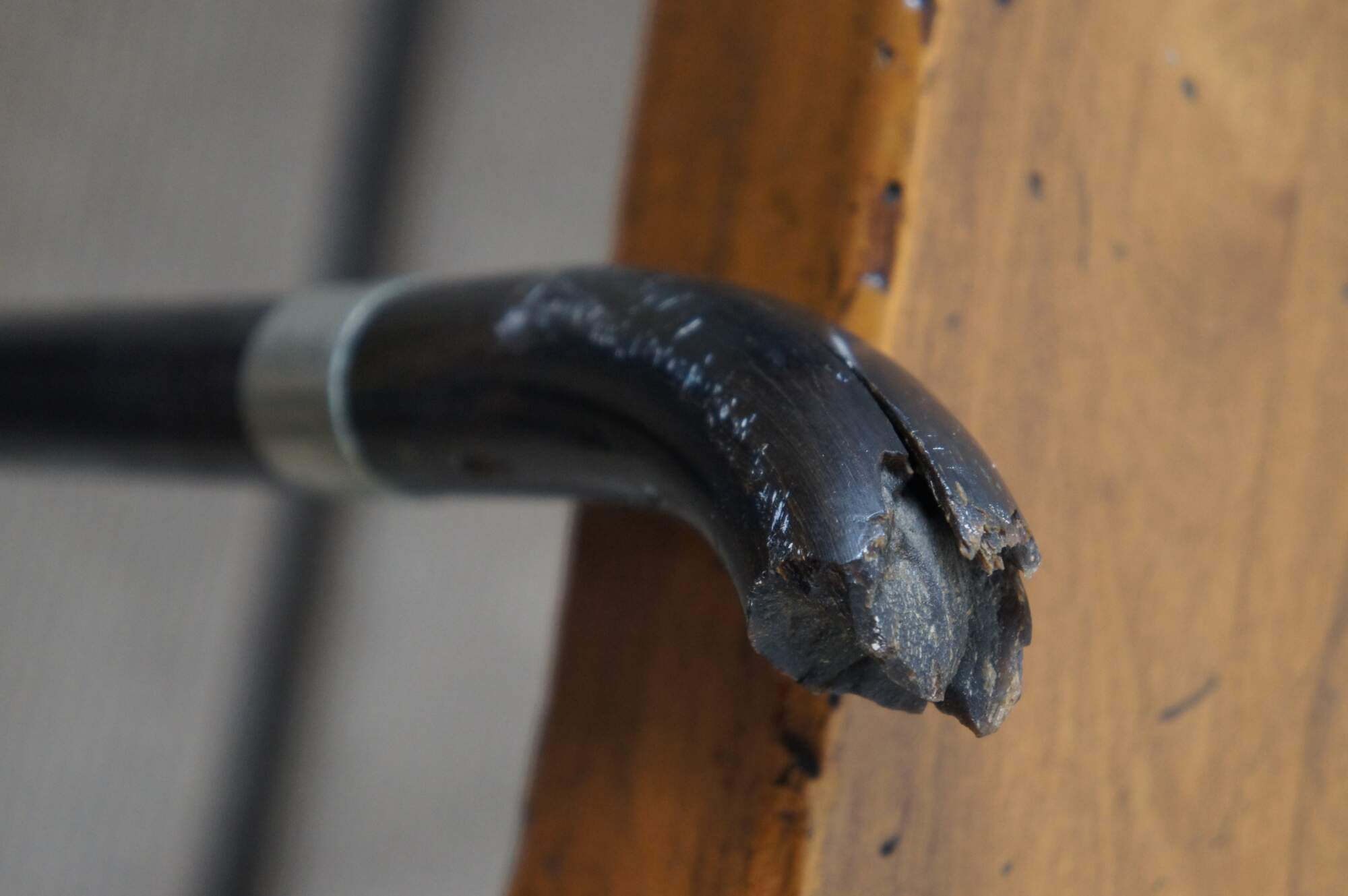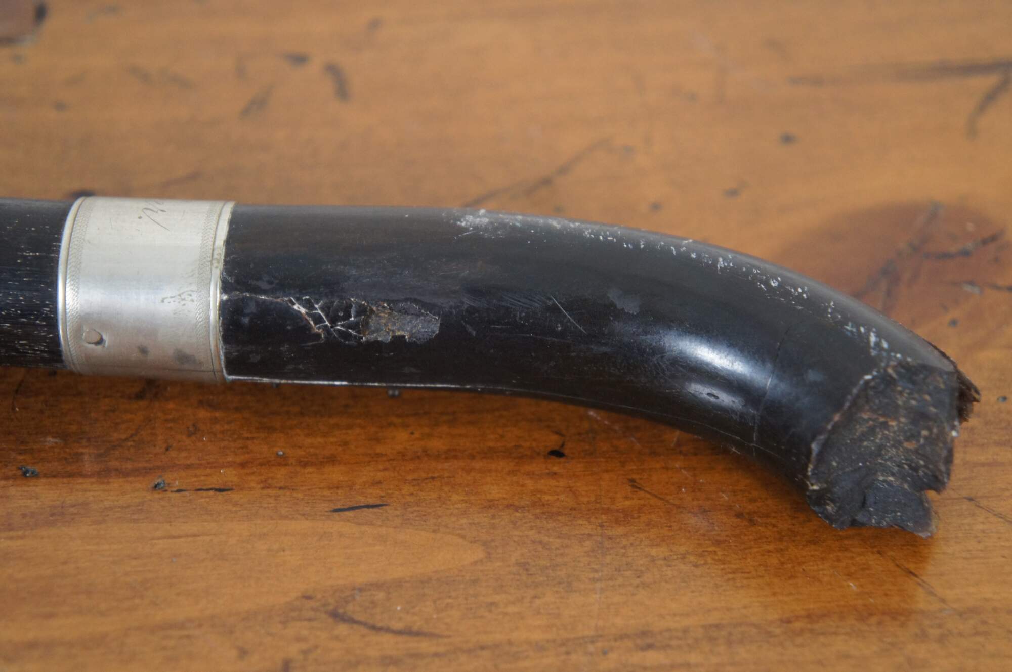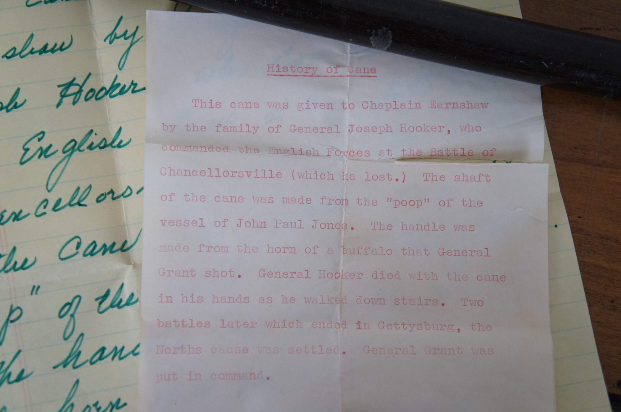 A history of the cane is included which reads: “This cane was given to Chaplain Earnshaw by the family of General Joseph Hooker, who commanded the English Forces at the Battle of Chancellorsville (which he lost.) The shaft of the cane was made from the “poop” of the vessel of John Paul Jones. The handle was made from the horn of a buffalo that General Grant shot. General Hooker died with the cane in his hands as he walked down stairs. Two battles later which ended in Gettysburg, the Norths cause was settled. General grant was put in command.”