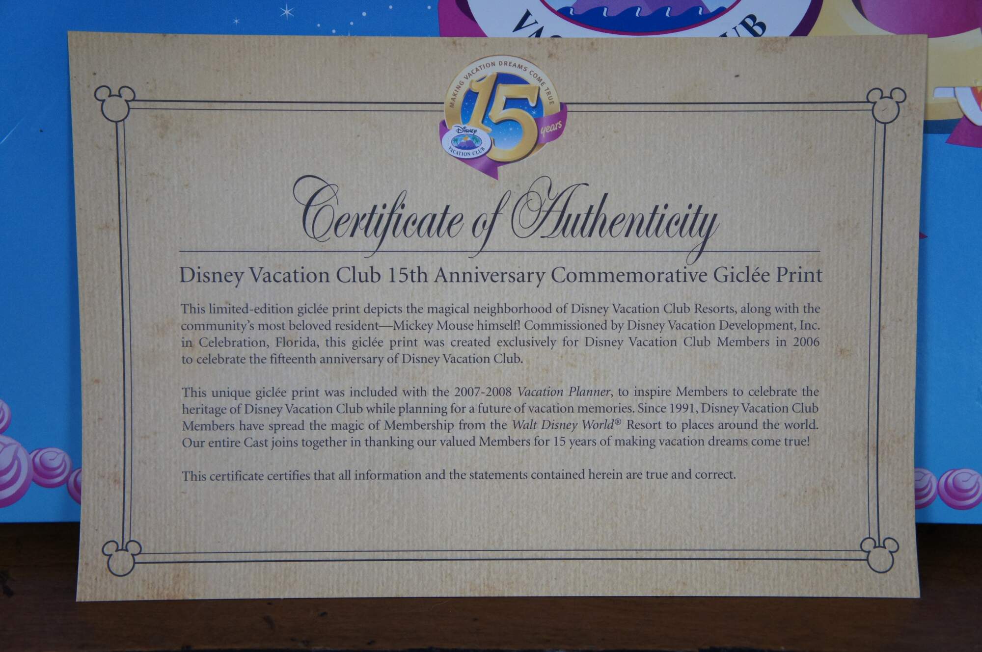 Vintage Disney Vacation Club 15th Anniversary Commemorative Mickey mouse giclee print on canvas with original box and Certificate of Authenticity. Circa 2007-2008
