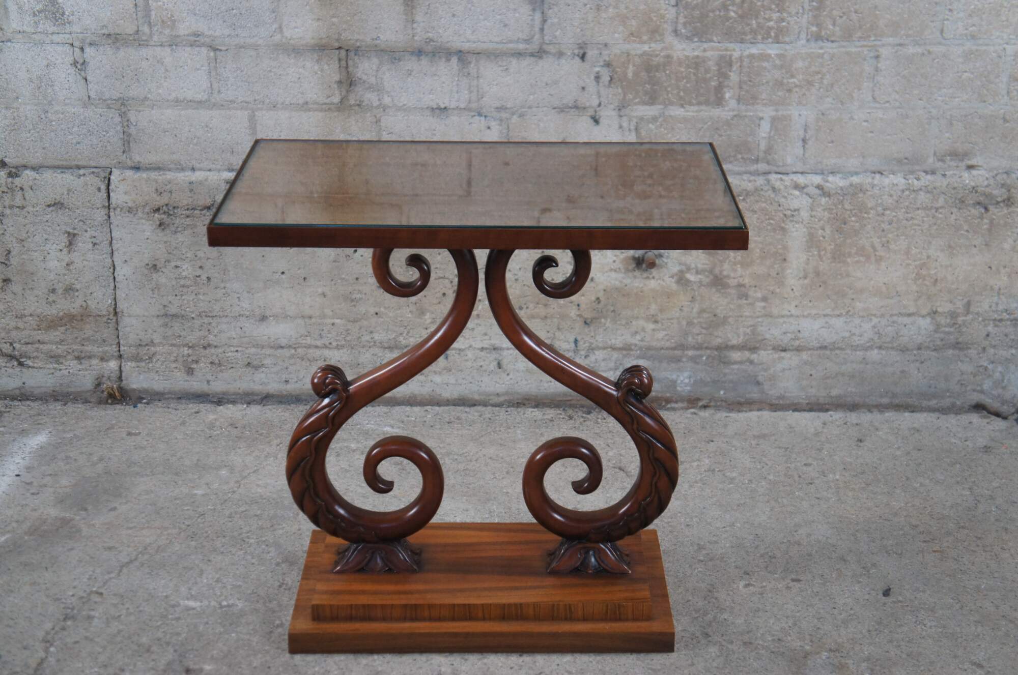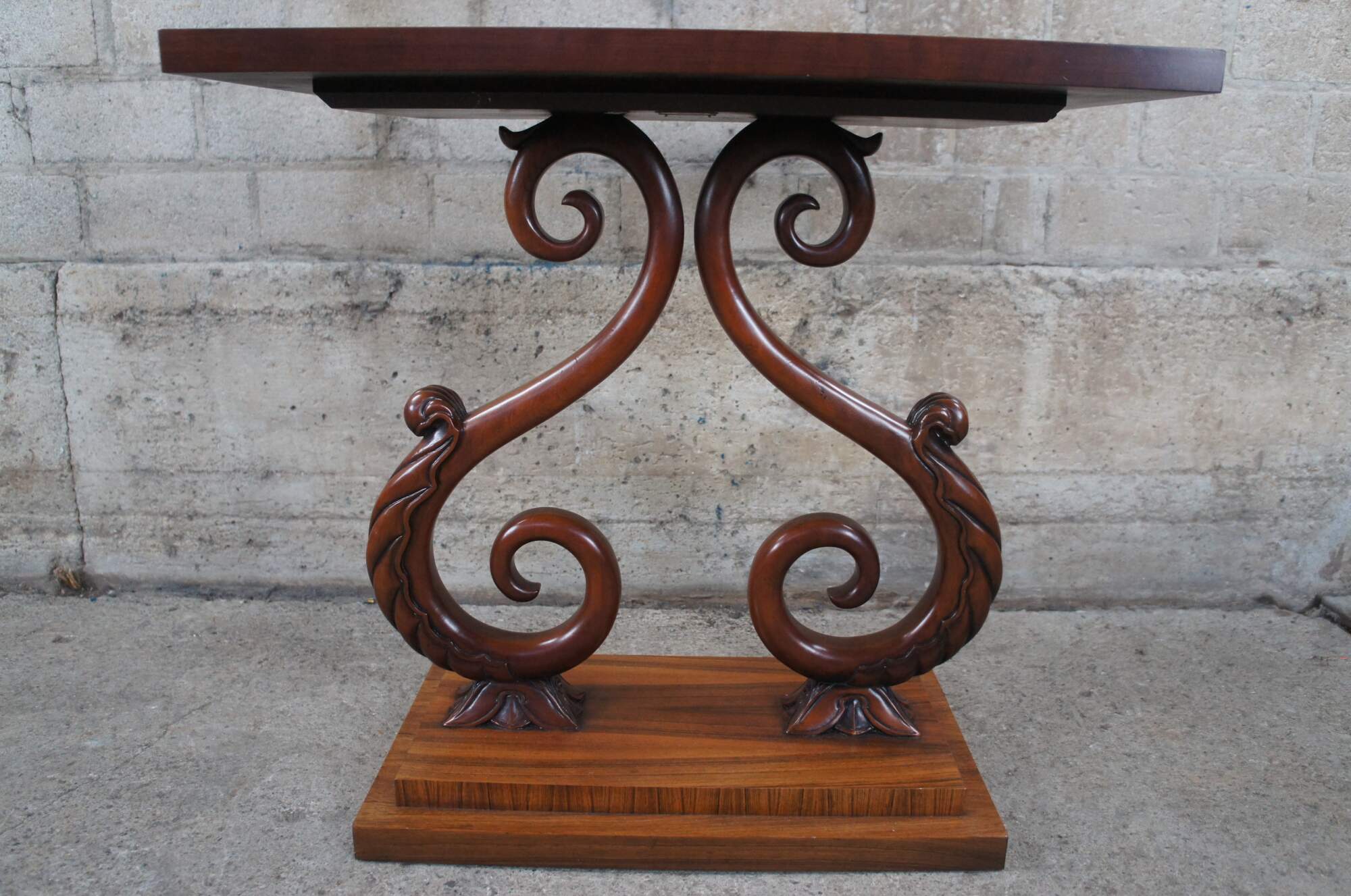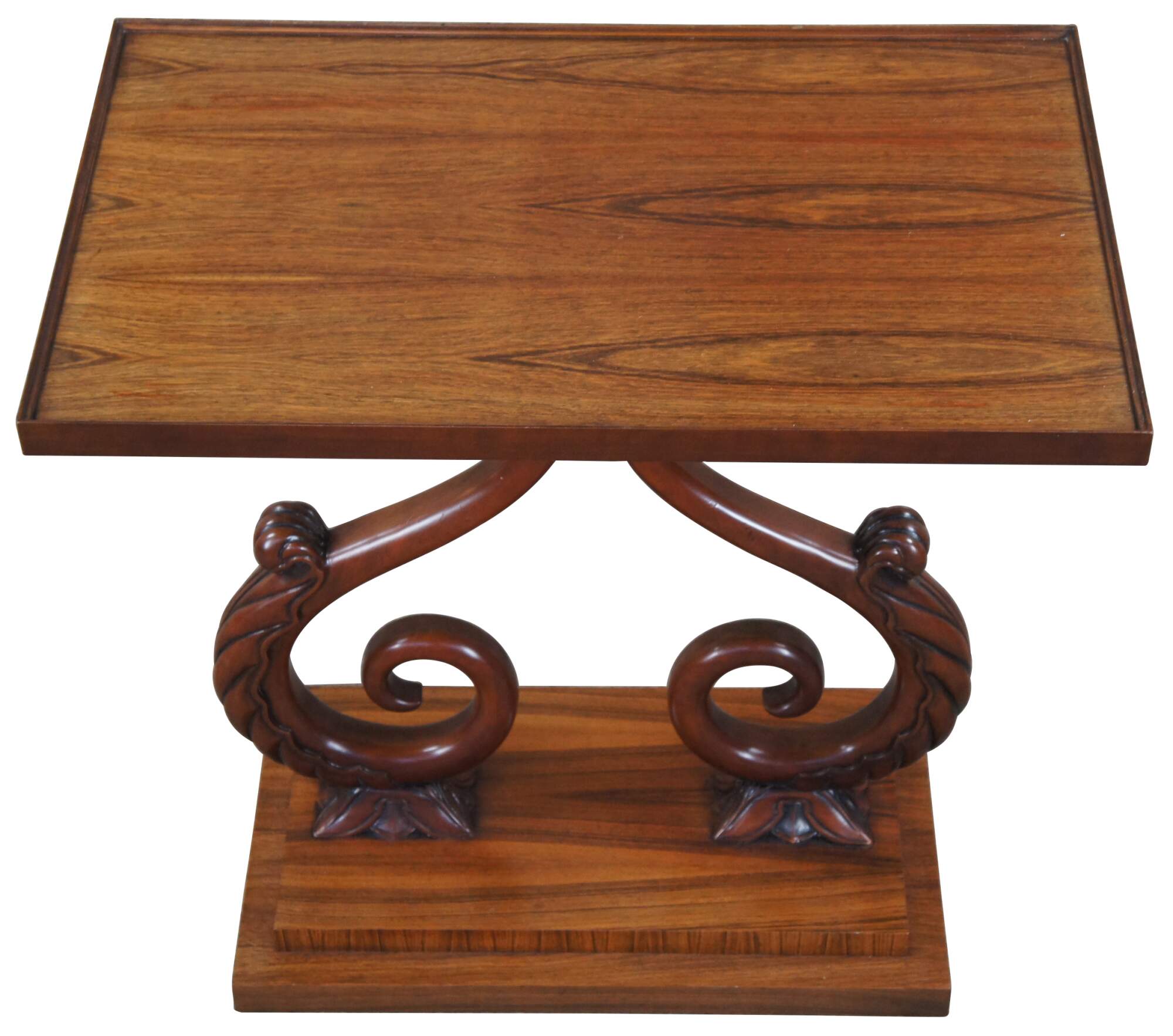 A rare and impressive rosewood table from the McMillen Collection by Baker Furniture. Features a rectangular inset glass top over beautiful "S" scrolled acanthus leaf accented center supports on a raised plinth base. Circa last quarter 20th century. These tables were made in a very few number and are increasingle hard to find.