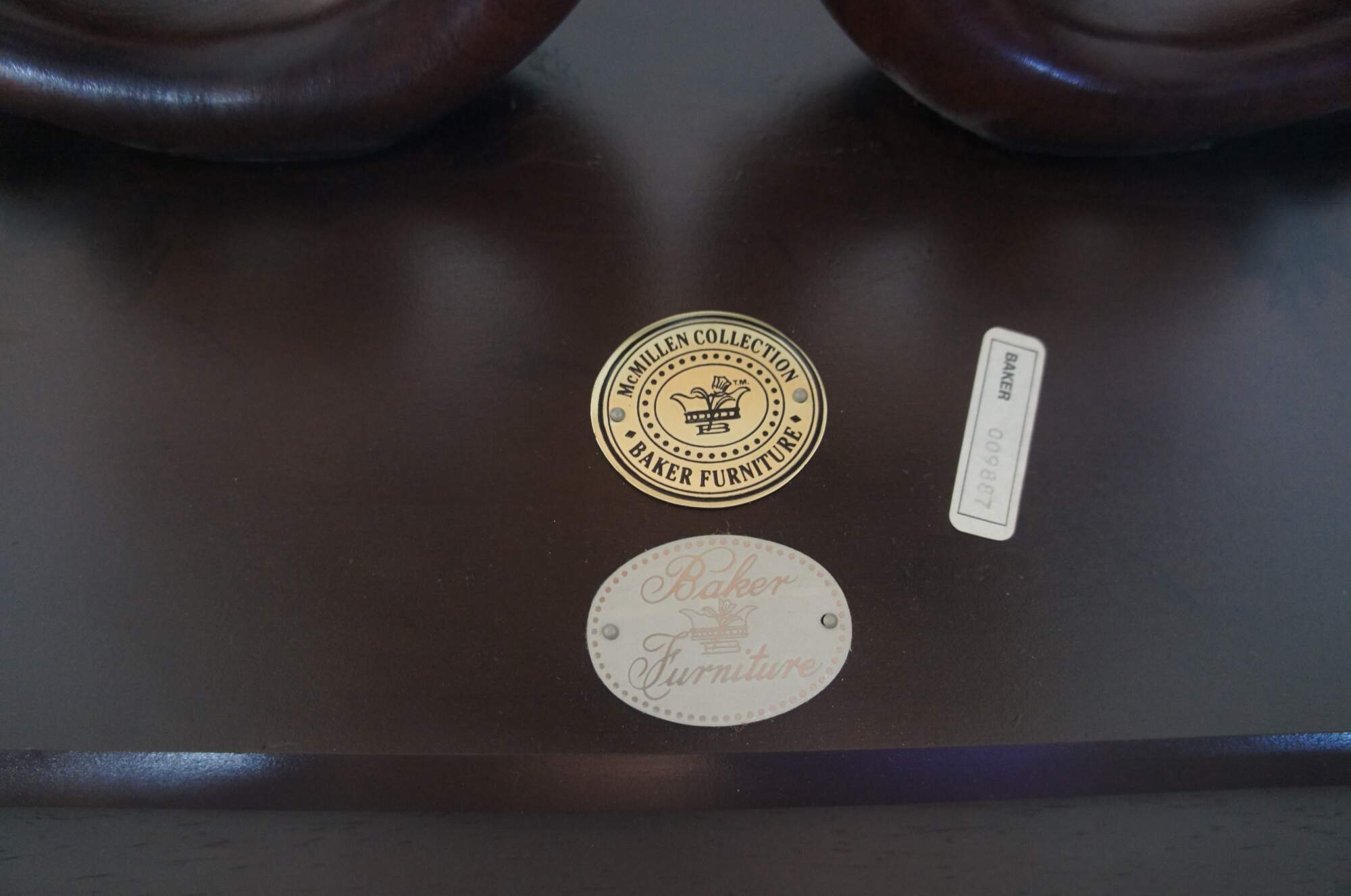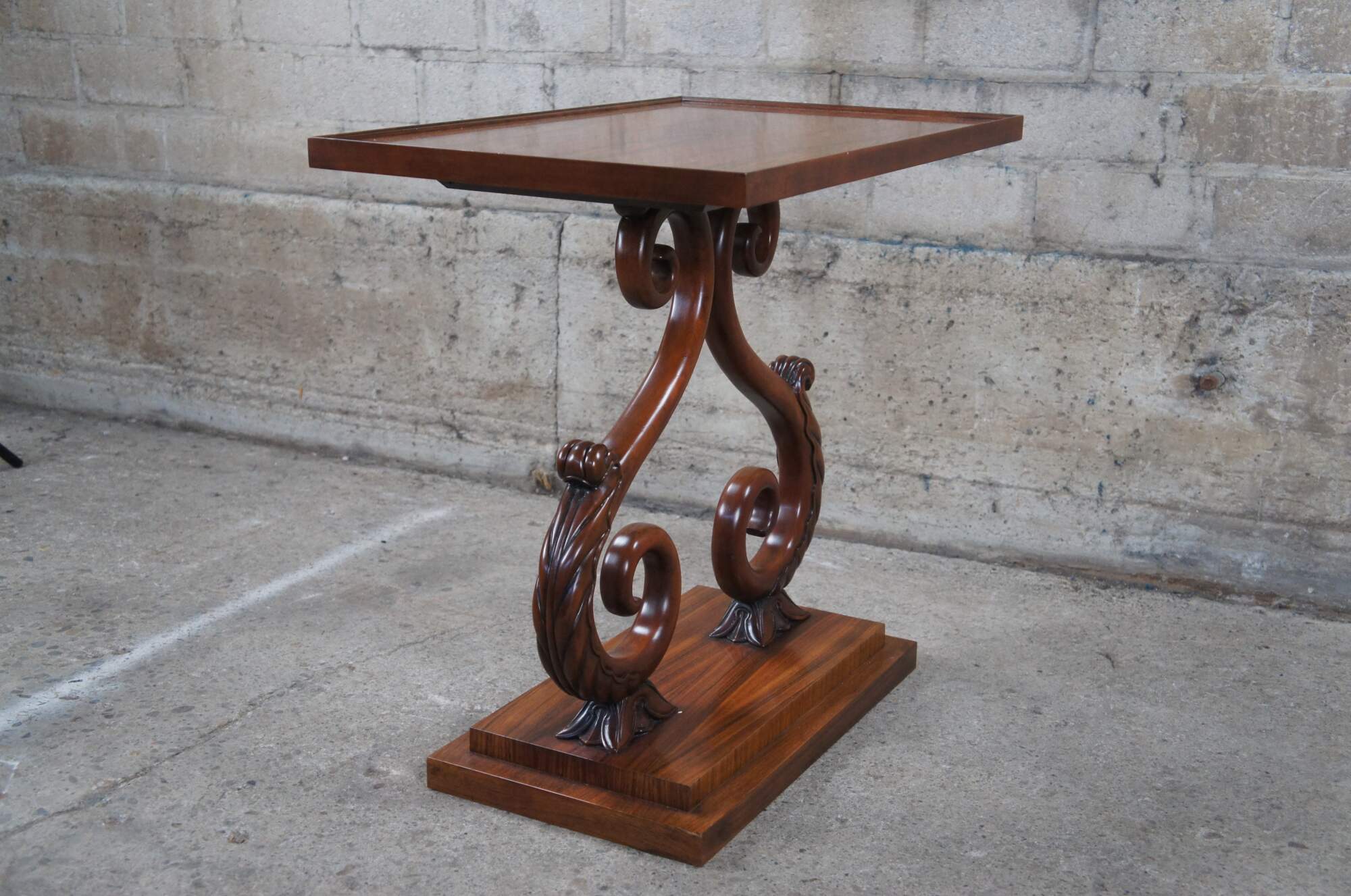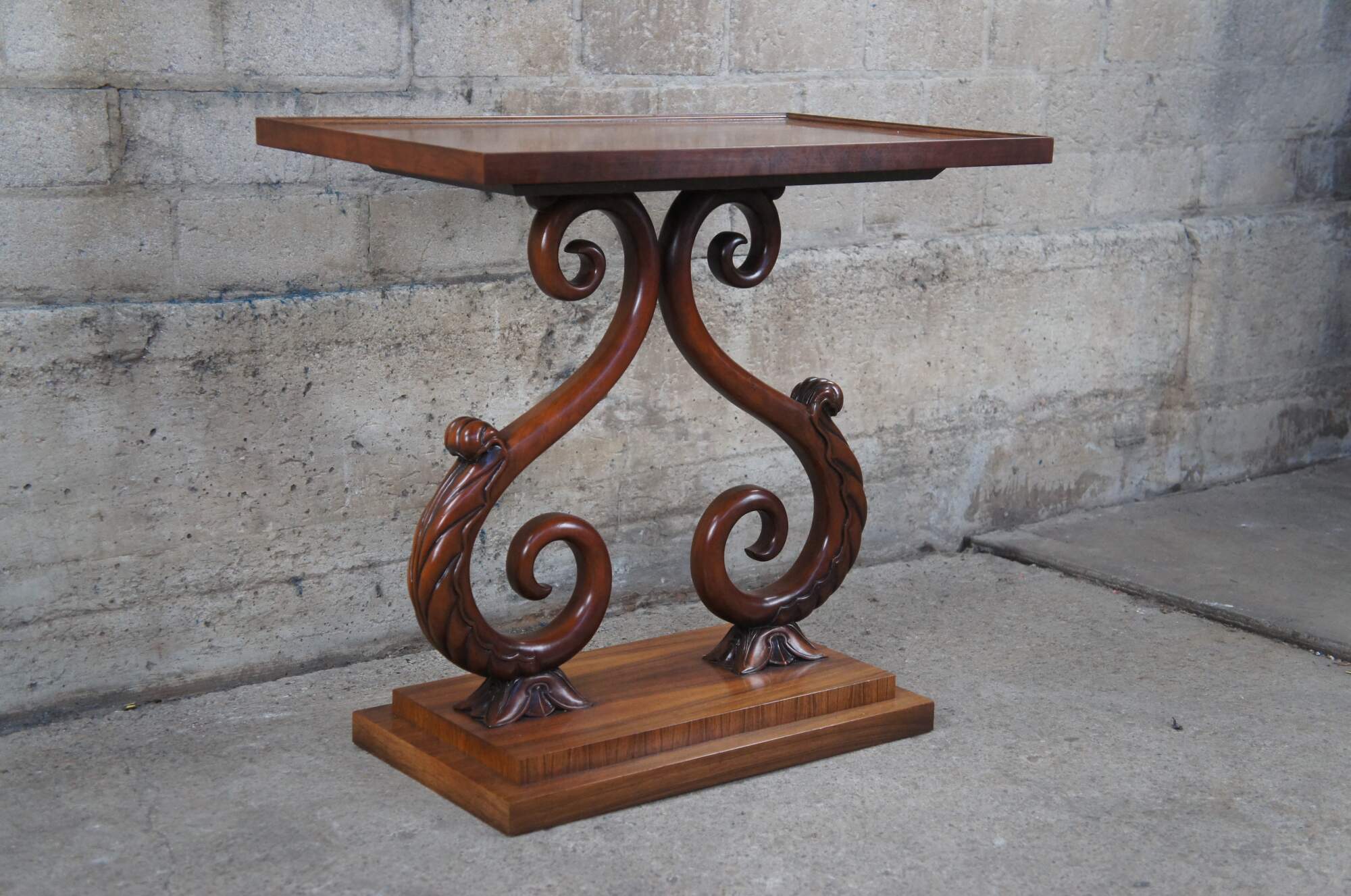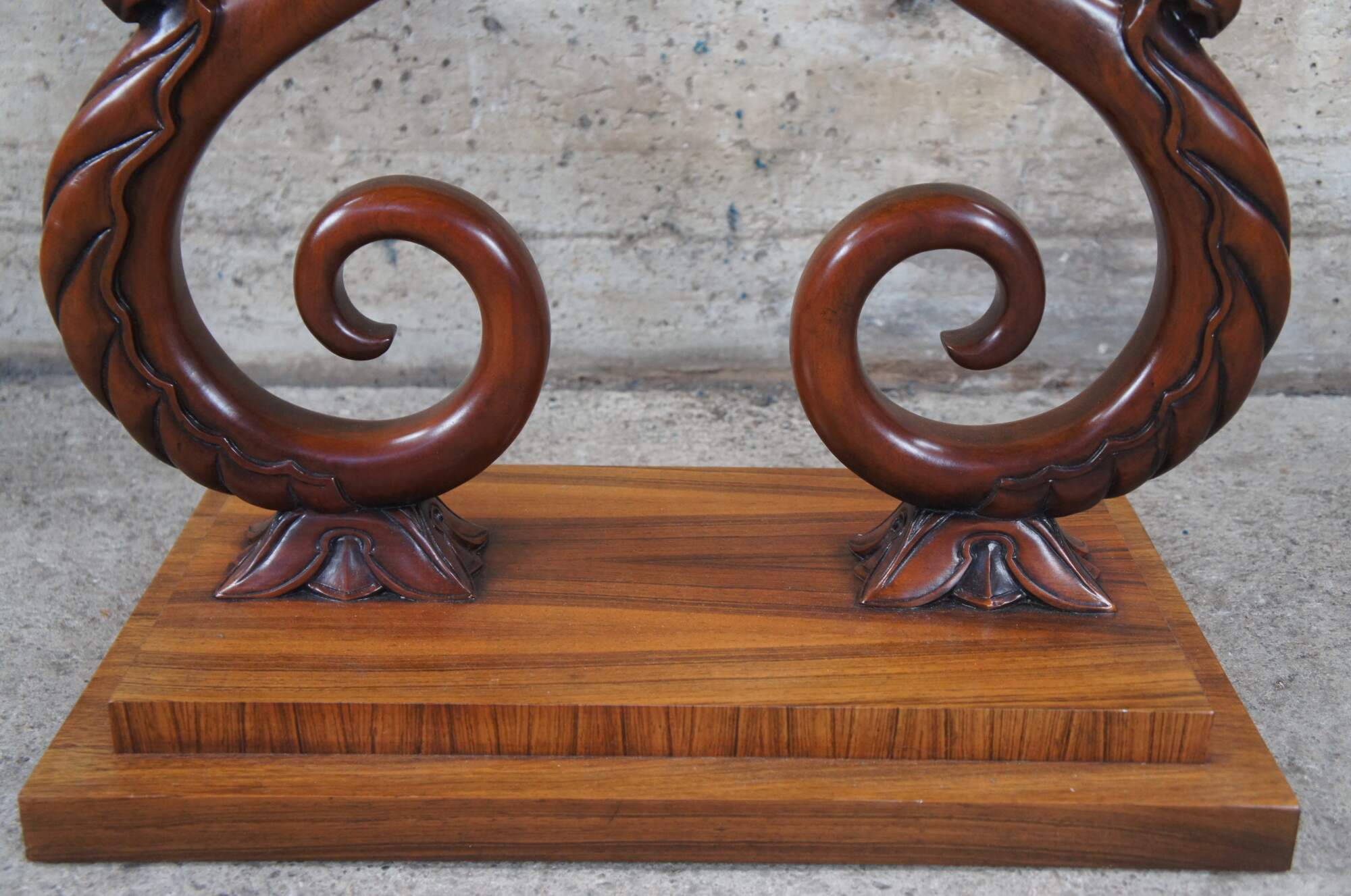 A rare and impressive rosewood table from the McMillen Collection by Baker Furniture. Features a rectangular inset glass top over beautiful "S" scrolled acanthus leaf accented center supports on a raised plinth base. Circa last quarter 20th century. These tables were made in a very few number and are increasingle hard to find.