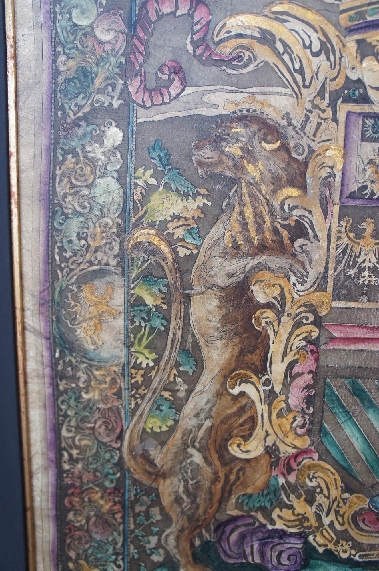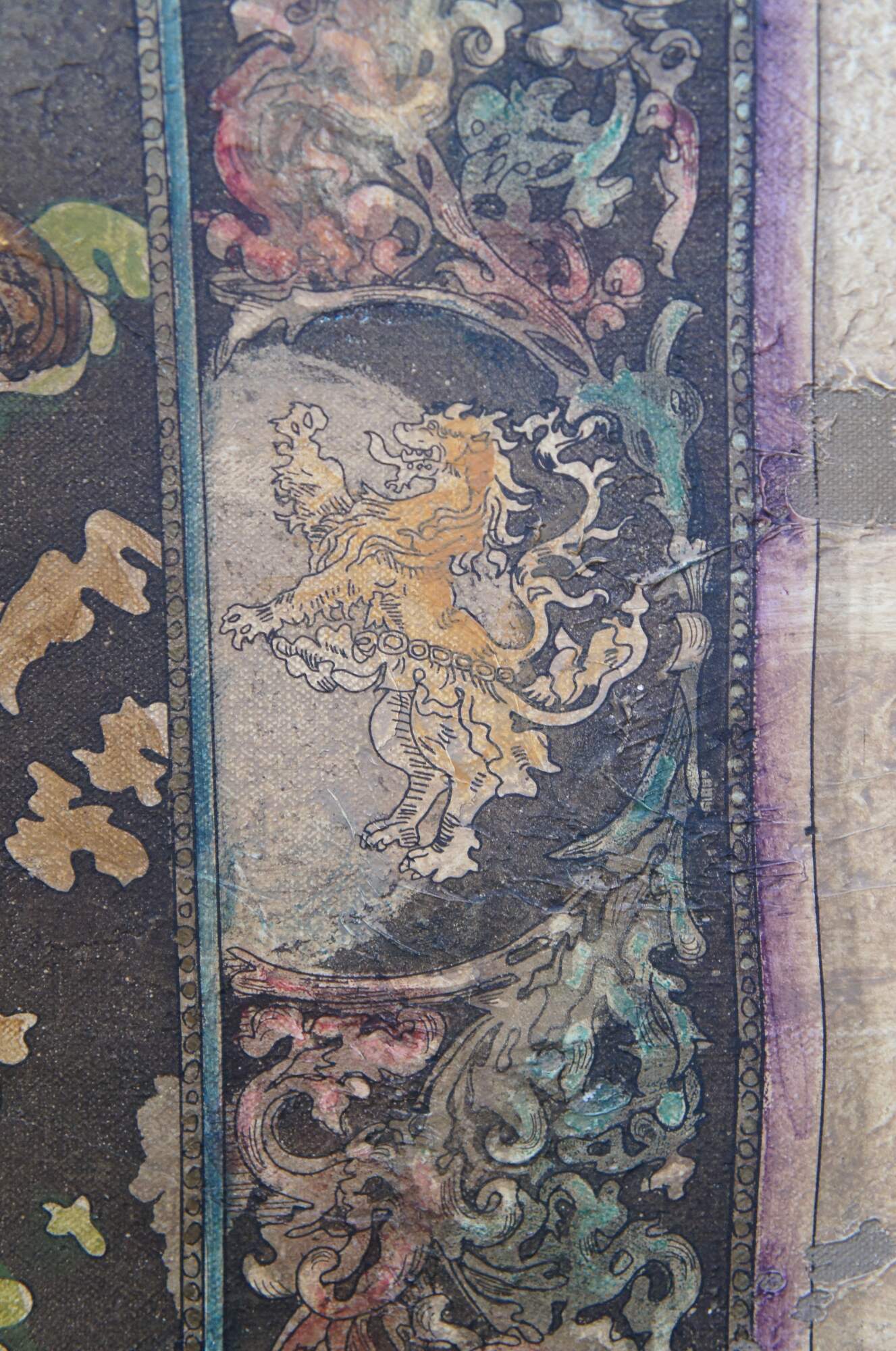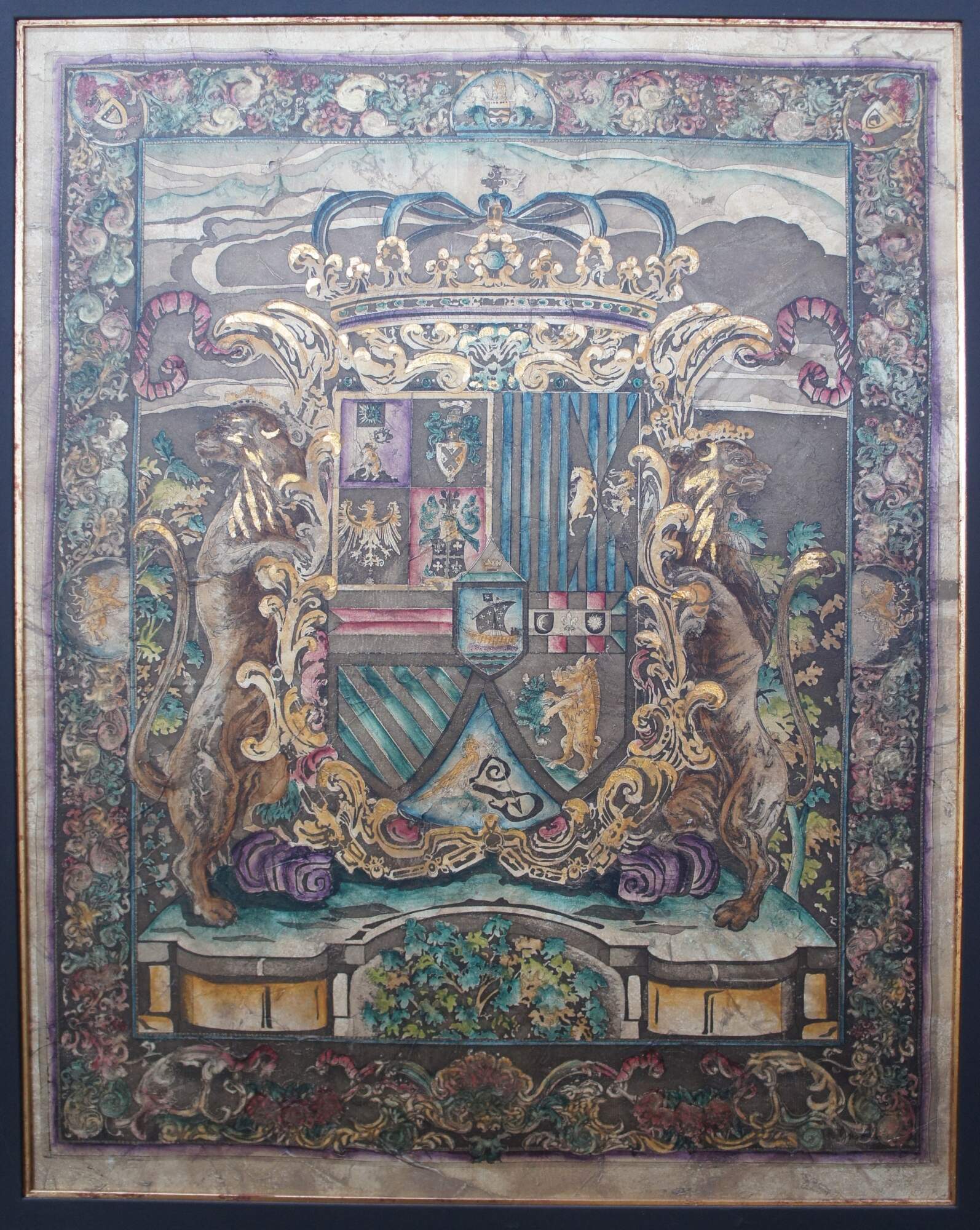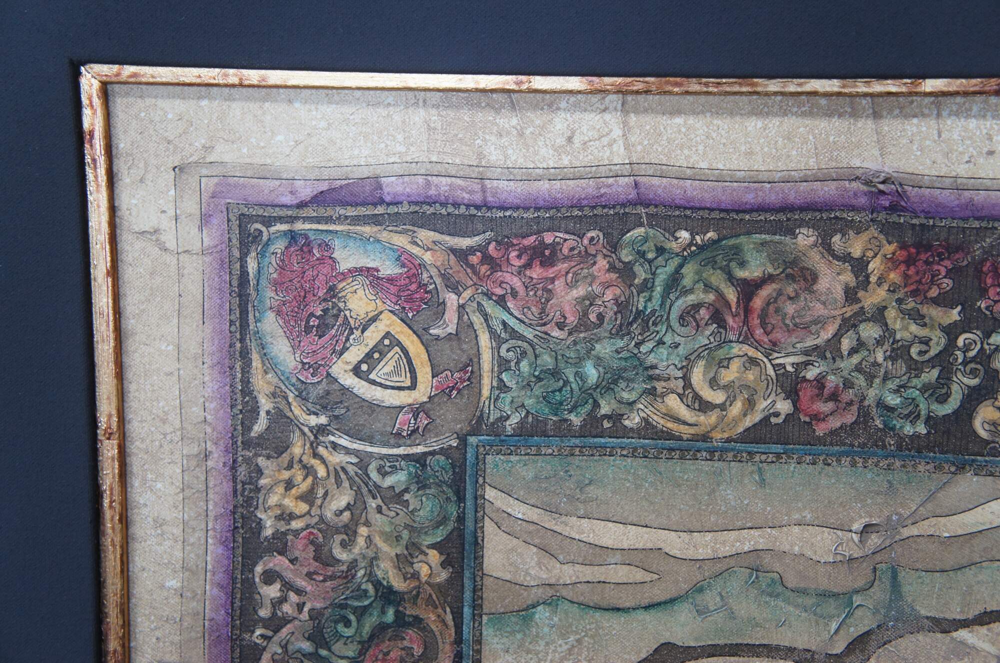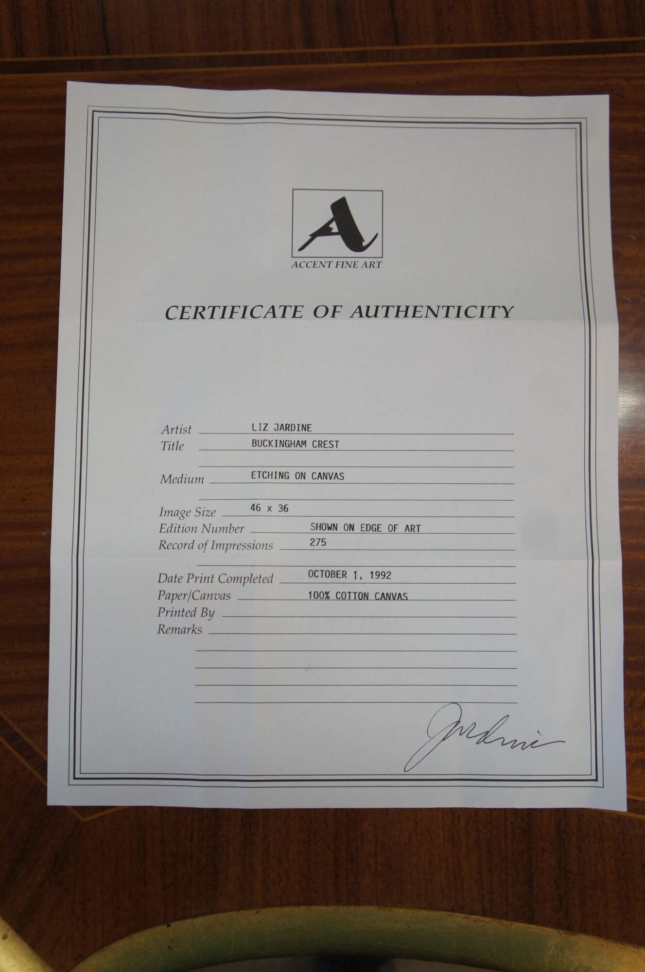 Buckingham Crest Etching on Canvas by Liz Jardine, circa 1992. A large format art with an amazing frame. Features a heraldic crest or shield at the center surrounded by lions with crowns. The crest has various crests within it and includes a phoenix, dragon, boar, boat, goat and bird. Etching on cotton canvas, includes COA.