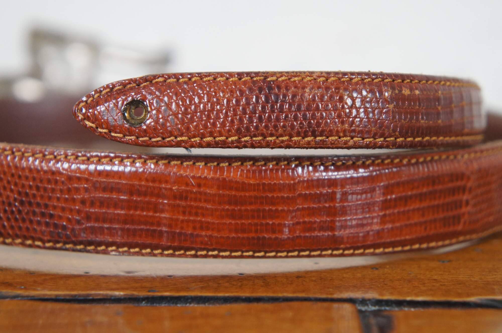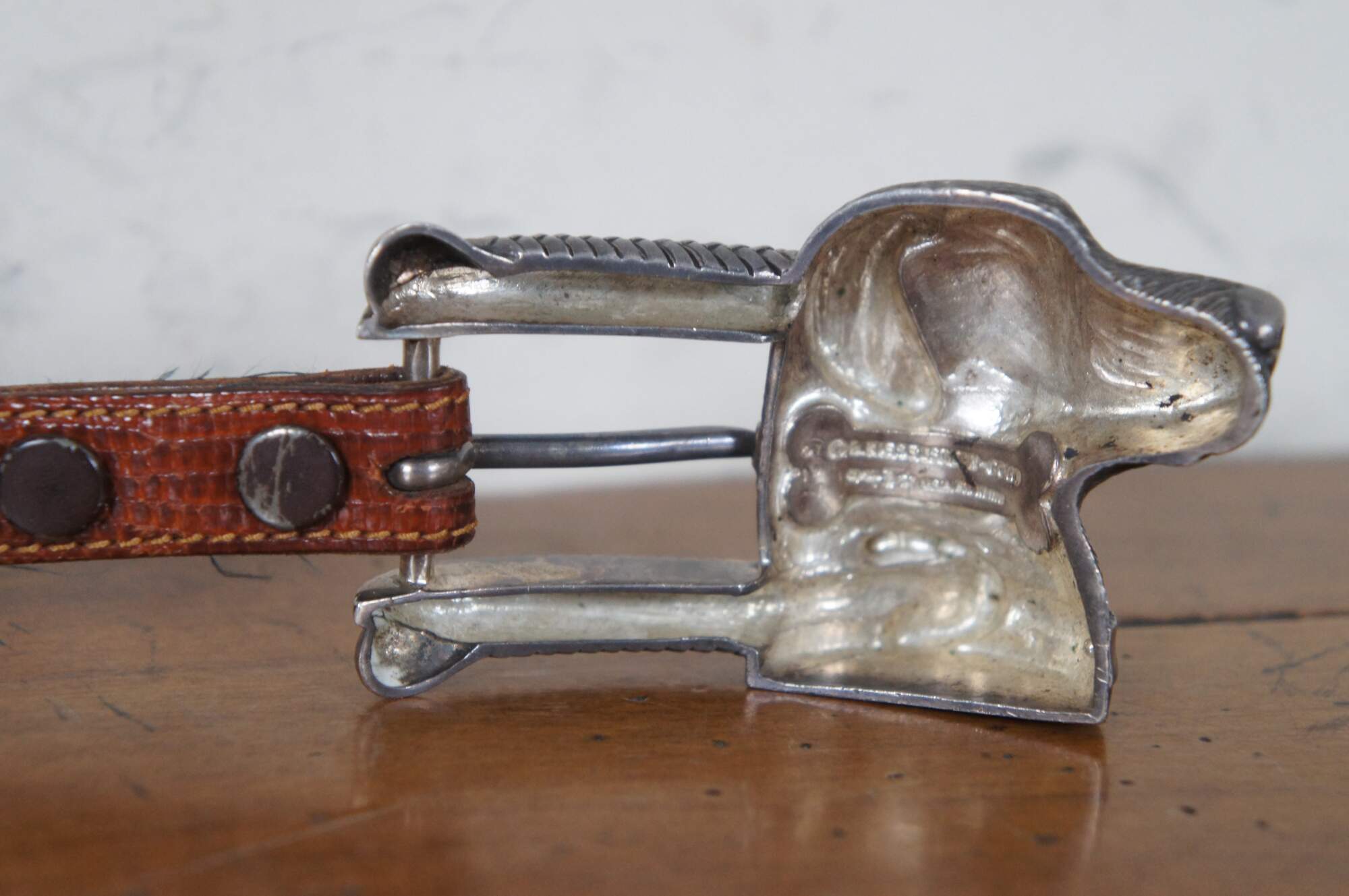 Vintage Barry Kieselstein-Cord brown geuine lizard skin belt with sterling silver buckle in the shape of the head of a labrador wearing a collar decorated with a Man in the Moon, number 327, circa 1989.