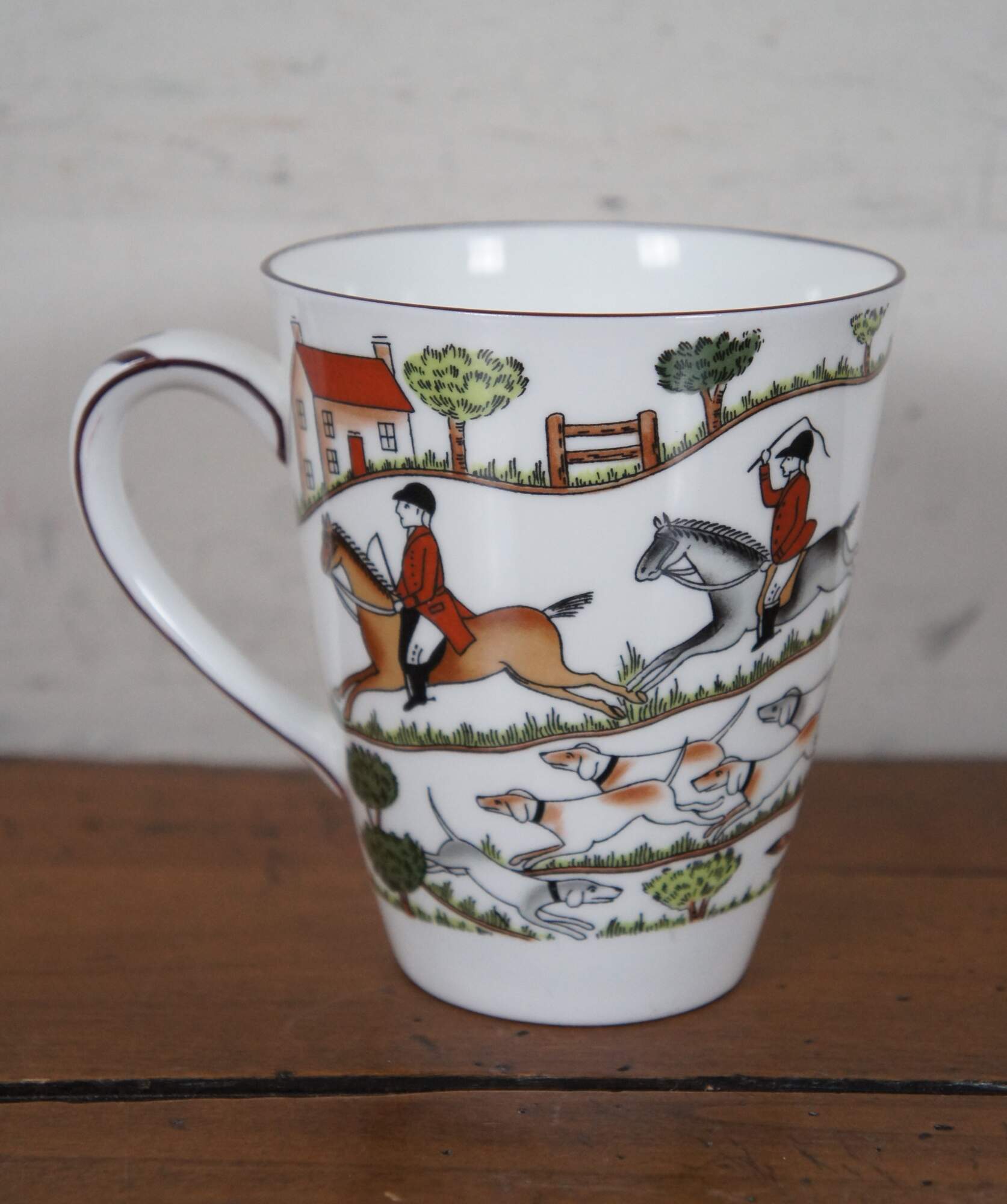Vintage six piece assorted lot of Crown Staffordshire porcelain featuring a spiraling landscape scene of a fox hunt with dogs, horses and equestrian figures. Lot includes one coffee mug, one tea cup and saucer, one demitasse and saucer, and a British bone china (not Crown Staffordshire) round trinket box.