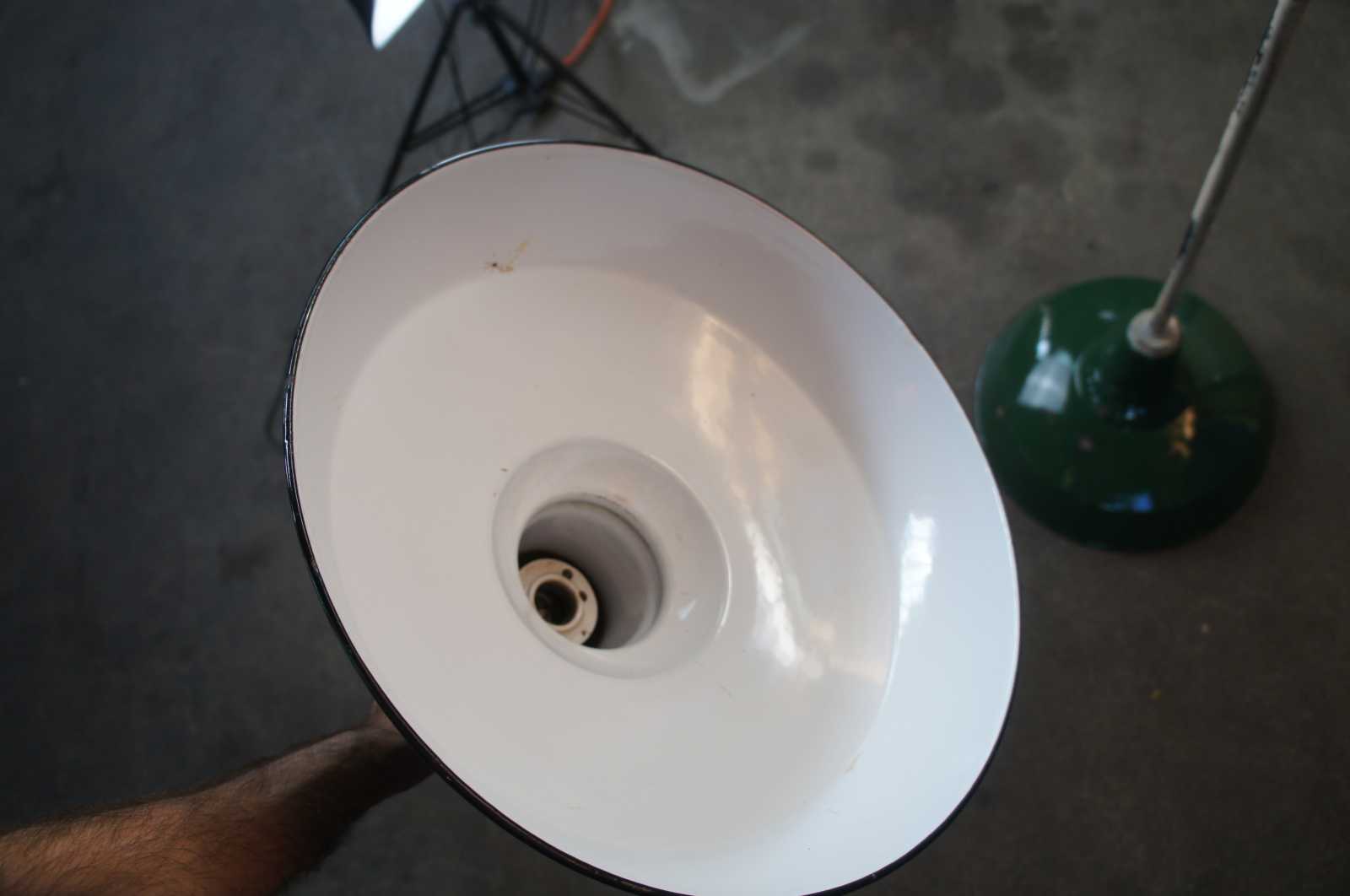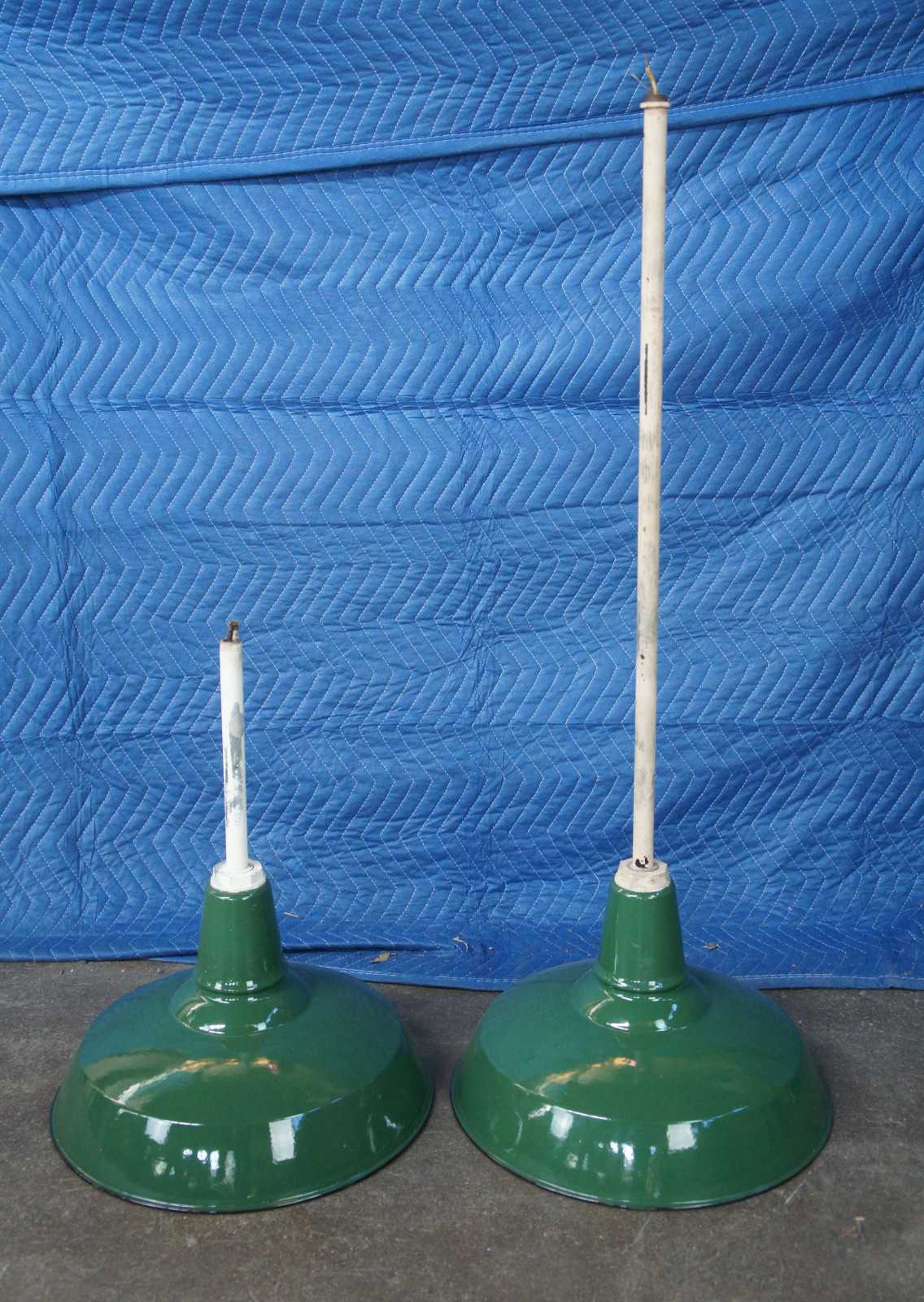 Circa 1930s Benjamin Electric Manufacturing Company Industrial 16"" Factory or Barn Lighting. Classic styling with green enameled and flared shade featuring a black rim and metal pole. 7 Available, 3 short and 4 Long.