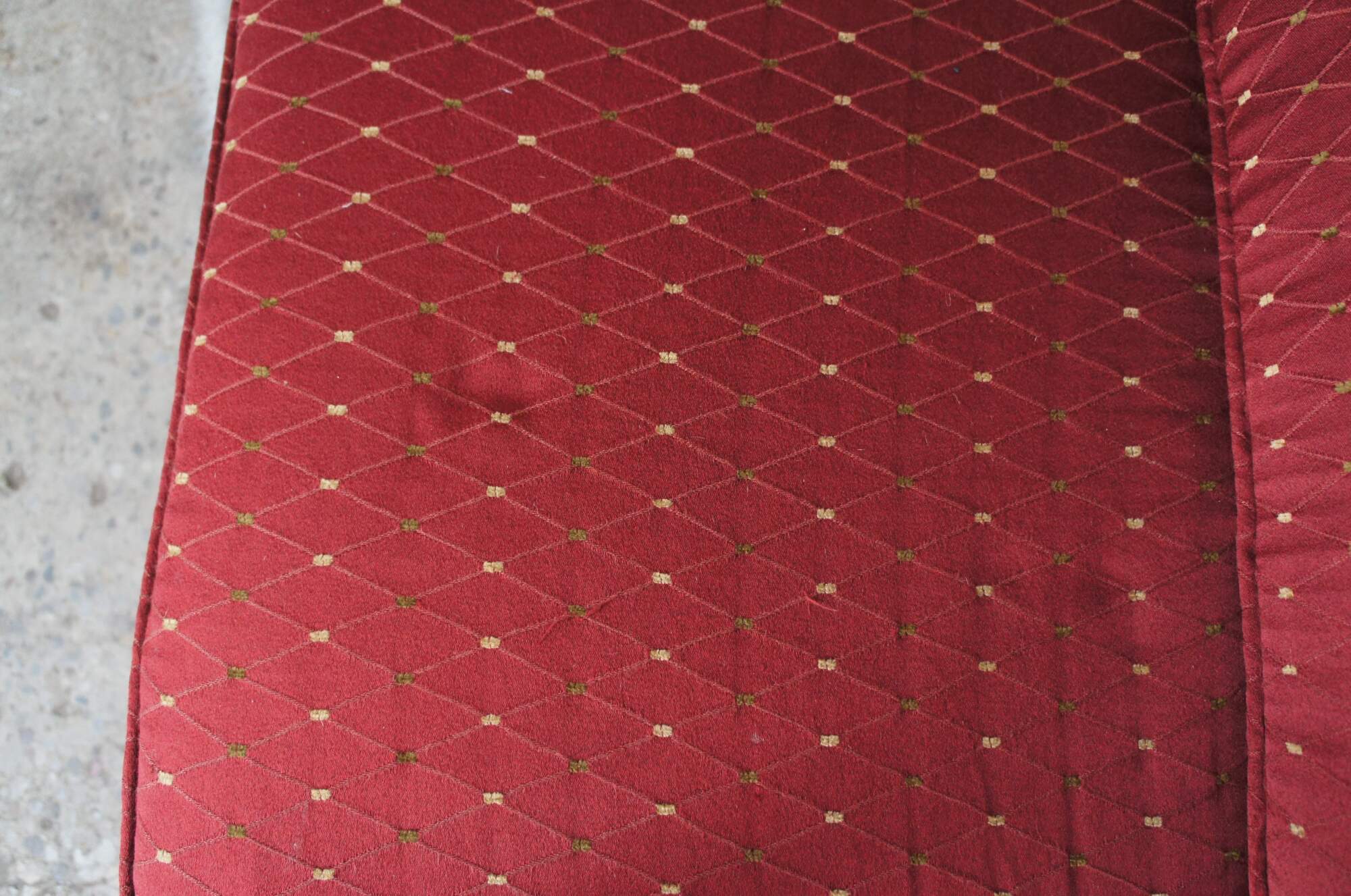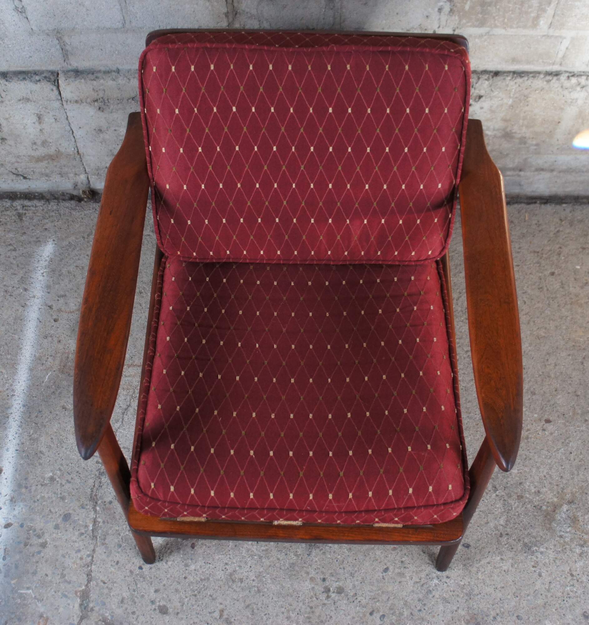 A stunning Mid Century Scandanavian lounge chair. Finished in walnut with a spindle back and removable red diamond pattern upholstered cushions.