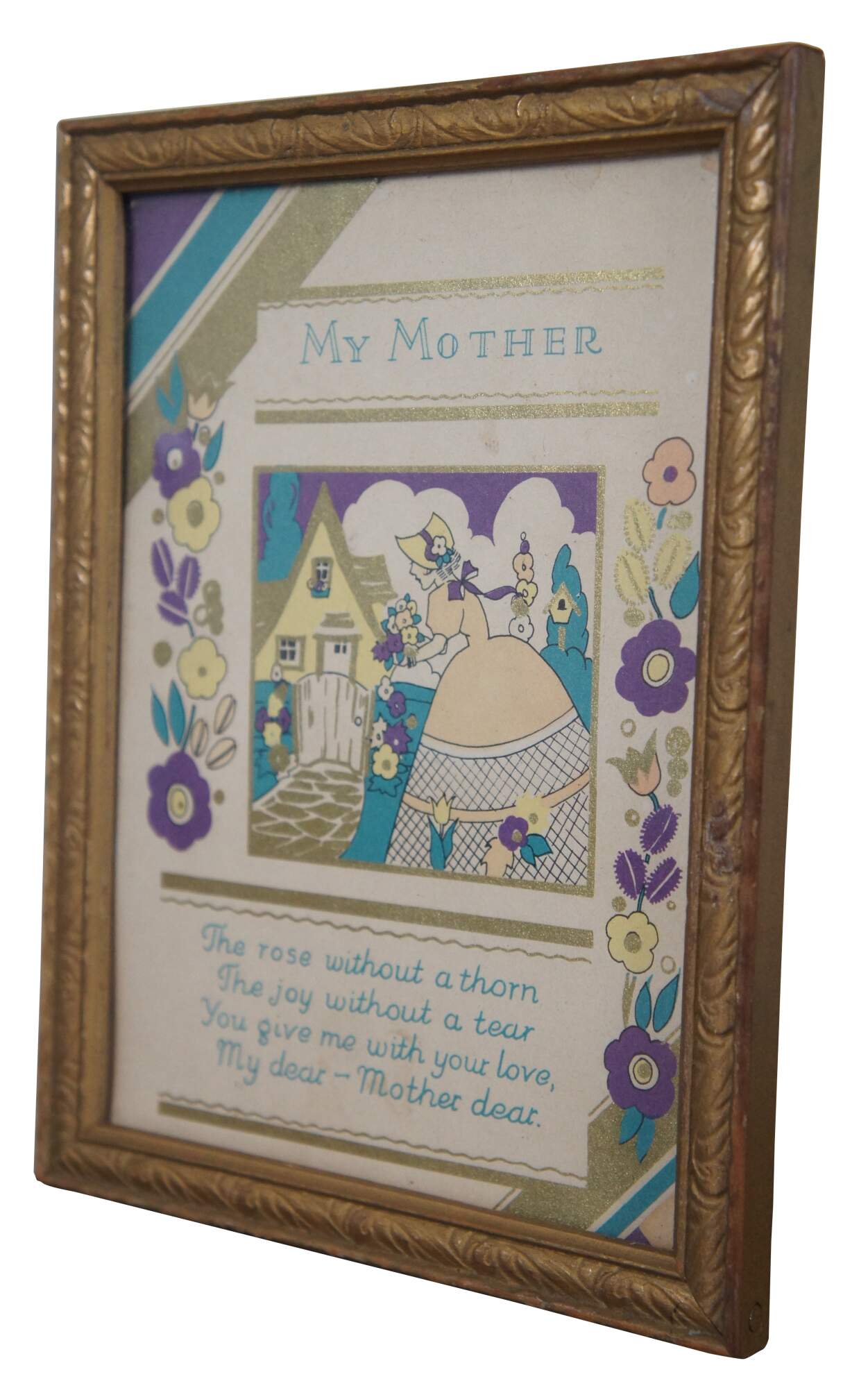 Antique Art Deco Mother’s Day print showing a floral motif in purple, turquoise, and gold framing a scene of a woman gathering flowers and a motto / poem. Signed on backside, ""Mothers Day gift from Ronald, Watertown South Dakota.