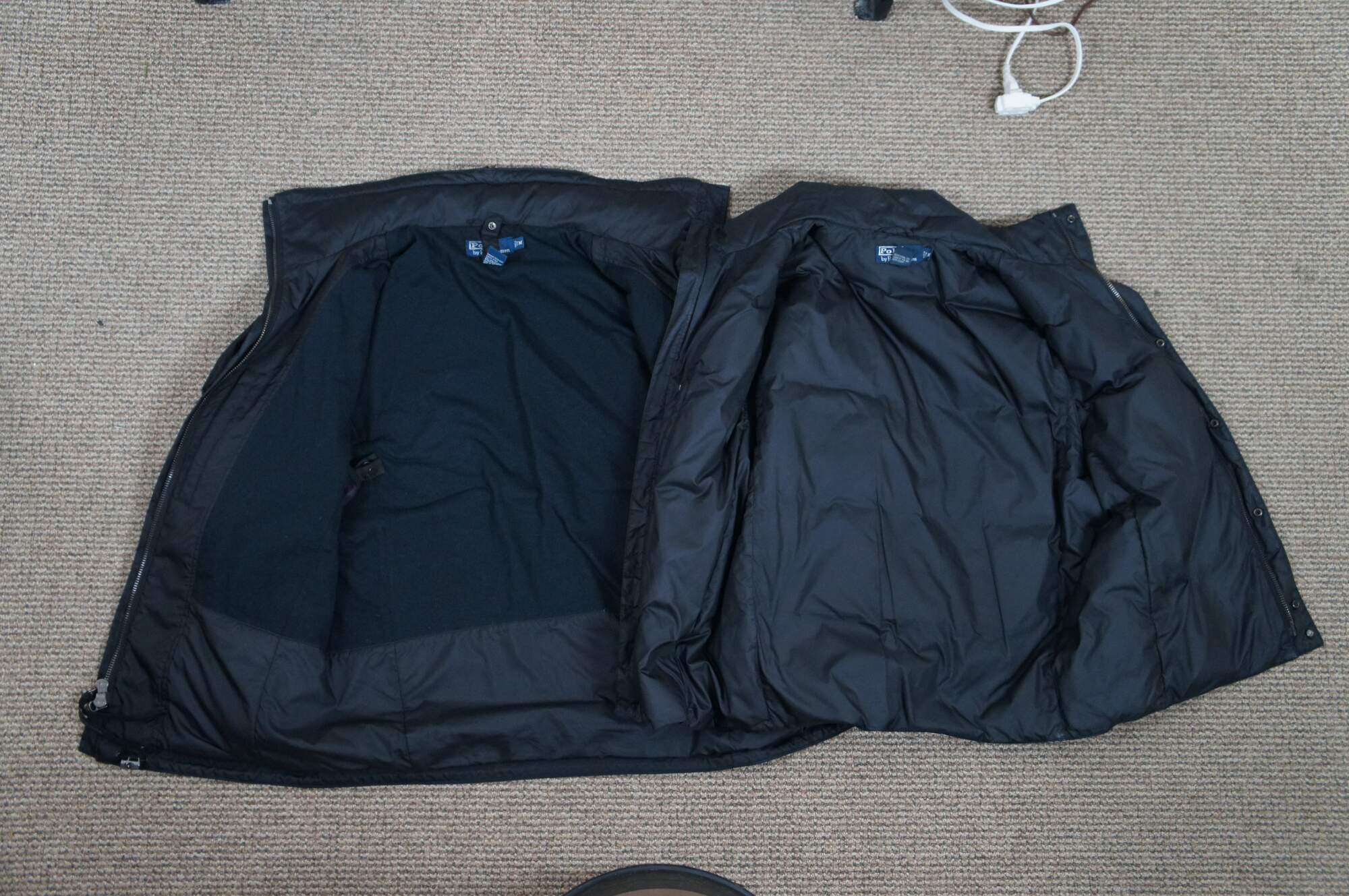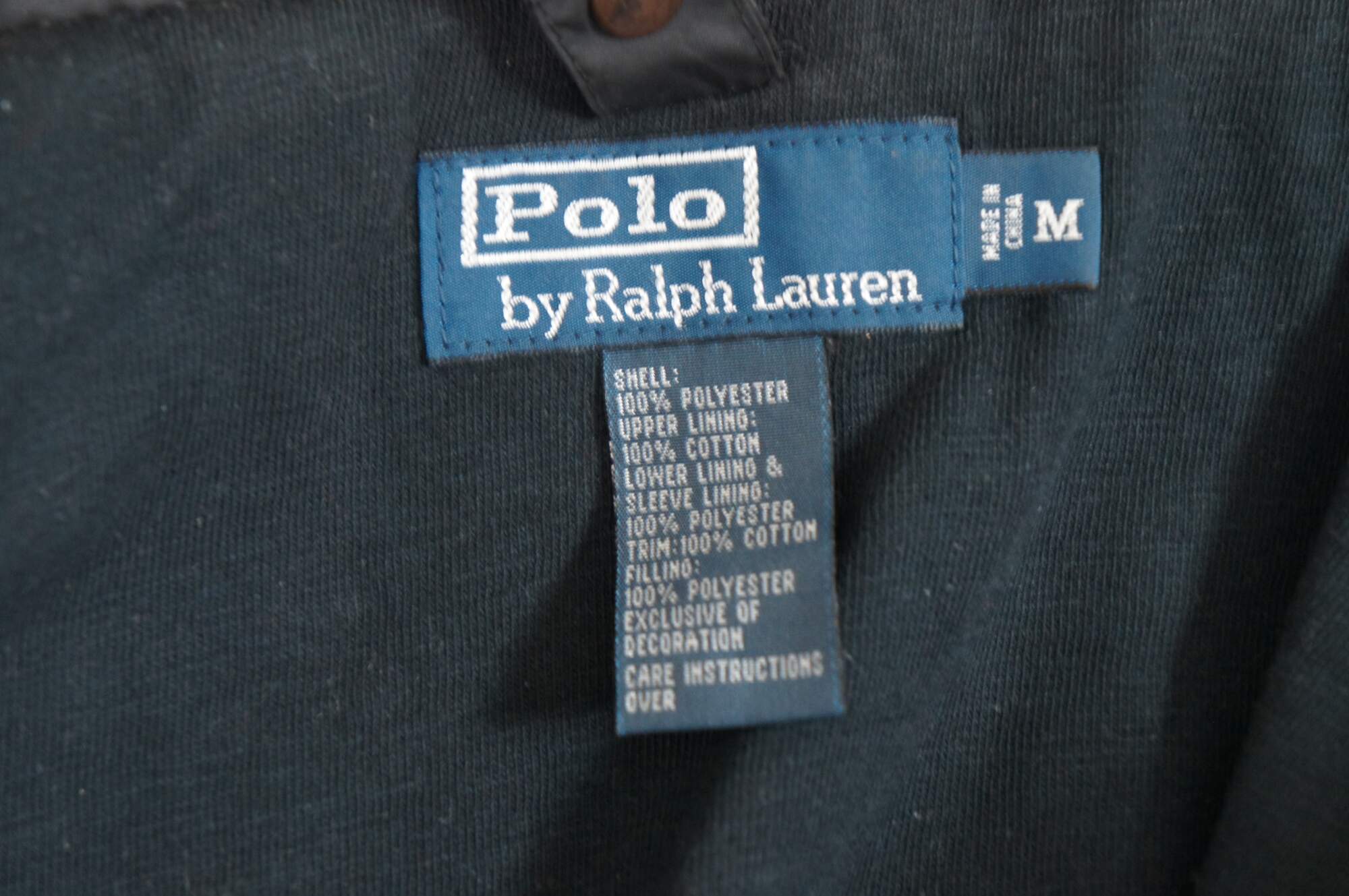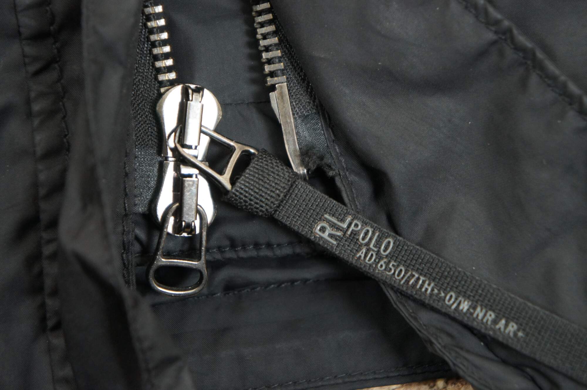 Polo Ralph Lauren black ski jacket and button-in removable vest set. Vest has a full zip front with additional snaps, high collar, two side pockets and chest zipper pocket. Jacket also has a full zip front with additional snaps, high collar, two side pockets, zip pockets on each arm, one exterior and one interior chest pocket. Polyester and Cotton.