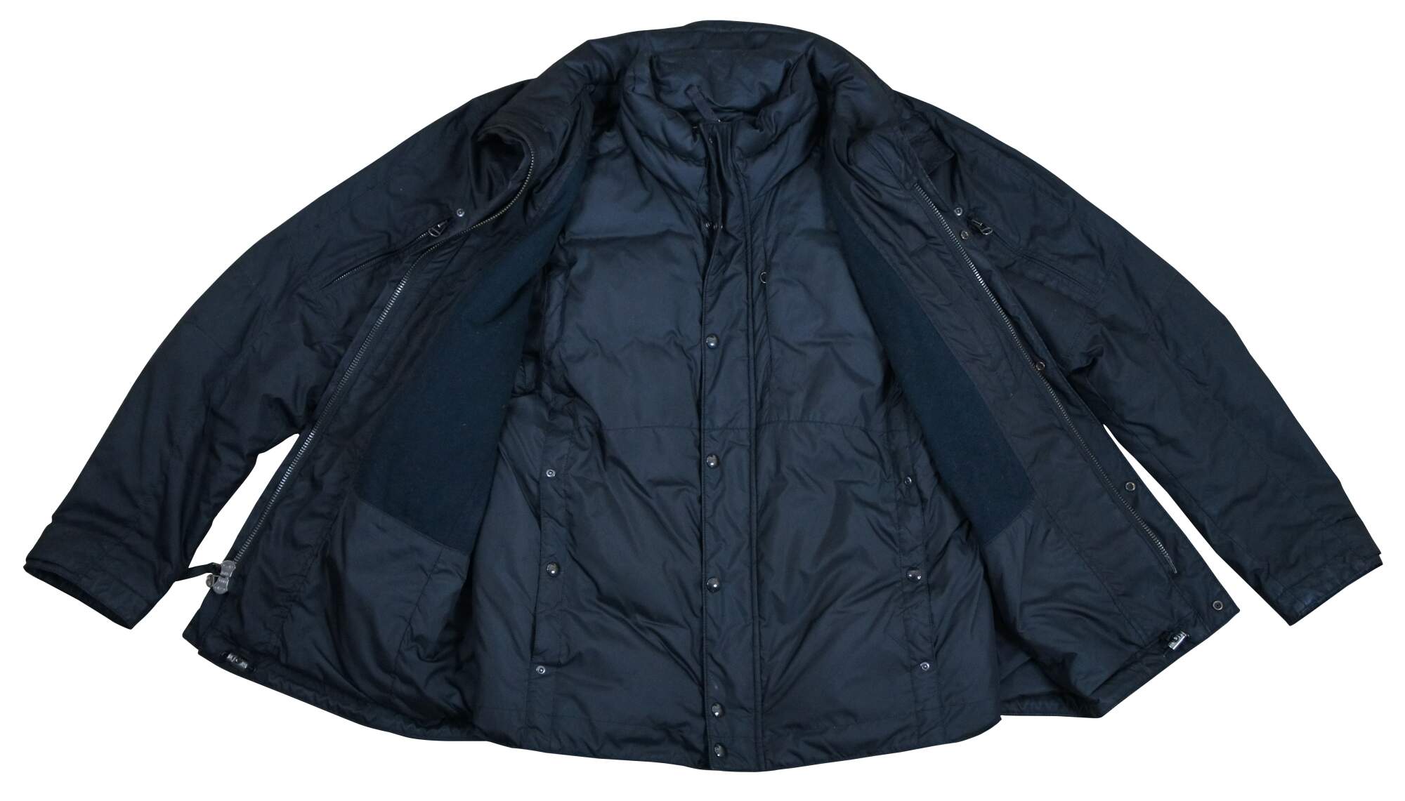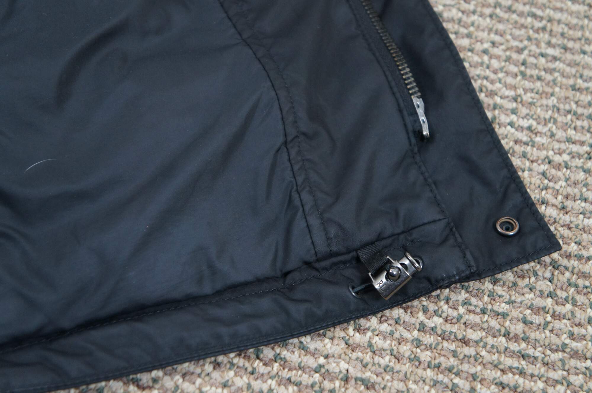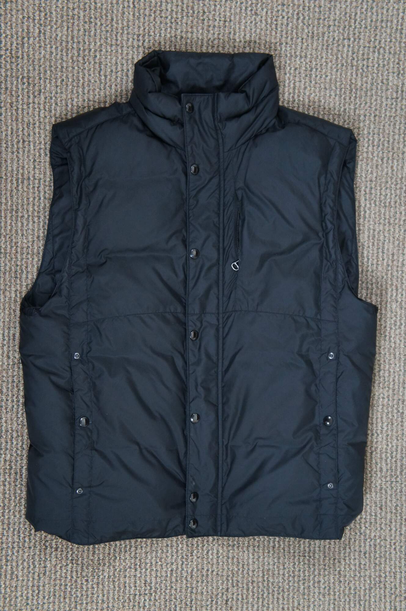 Polo Ralph Lauren black ski jacket and button-in removable vest set. Vest has a full zip front with additional snaps, high collar, two side pockets and chest zipper pocket. Jacket also has a full zip front with additional snaps, high collar, two side pockets, zip pockets on each arm, one exterior and one interior chest pocket. Polyester and Cotton.