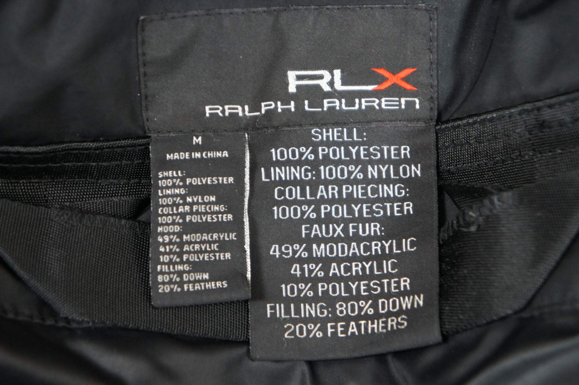Vintage RLX Ralph Lauren water repellent black puffer jacket / winter coat with removable hood and removable faux fur edge / lining. Jacket has full zip front with additional snaps, two flapped side pockets, two flapped chest pockets, one zipper pocket on the arm, high collar, and drawstrings for snugness,