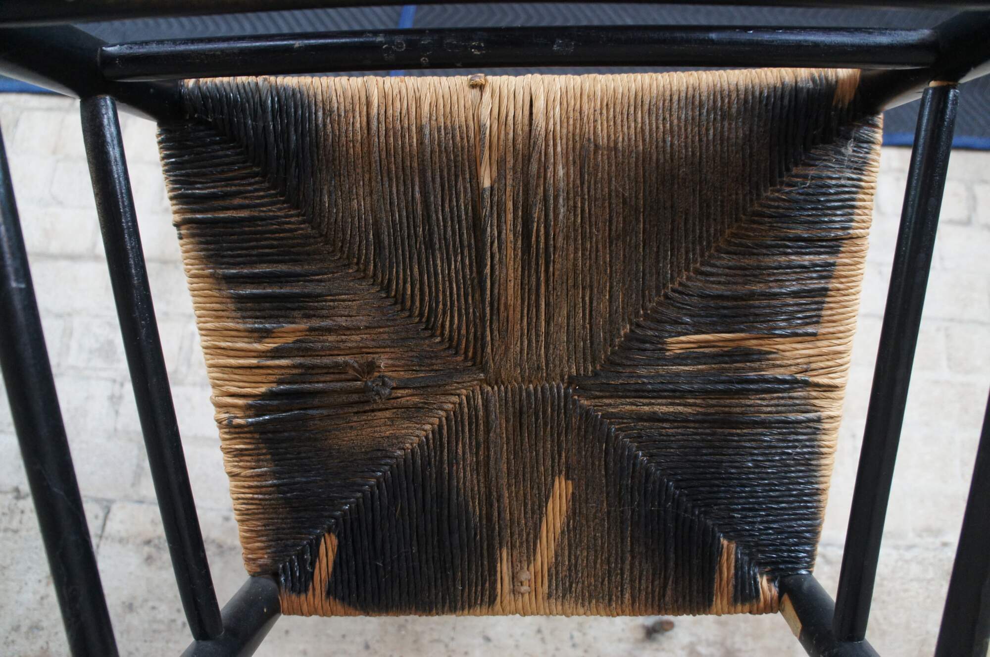 20th Century Shaker style rocking chair. Features a black finish with gold trim along the back rails and a rush seat.
