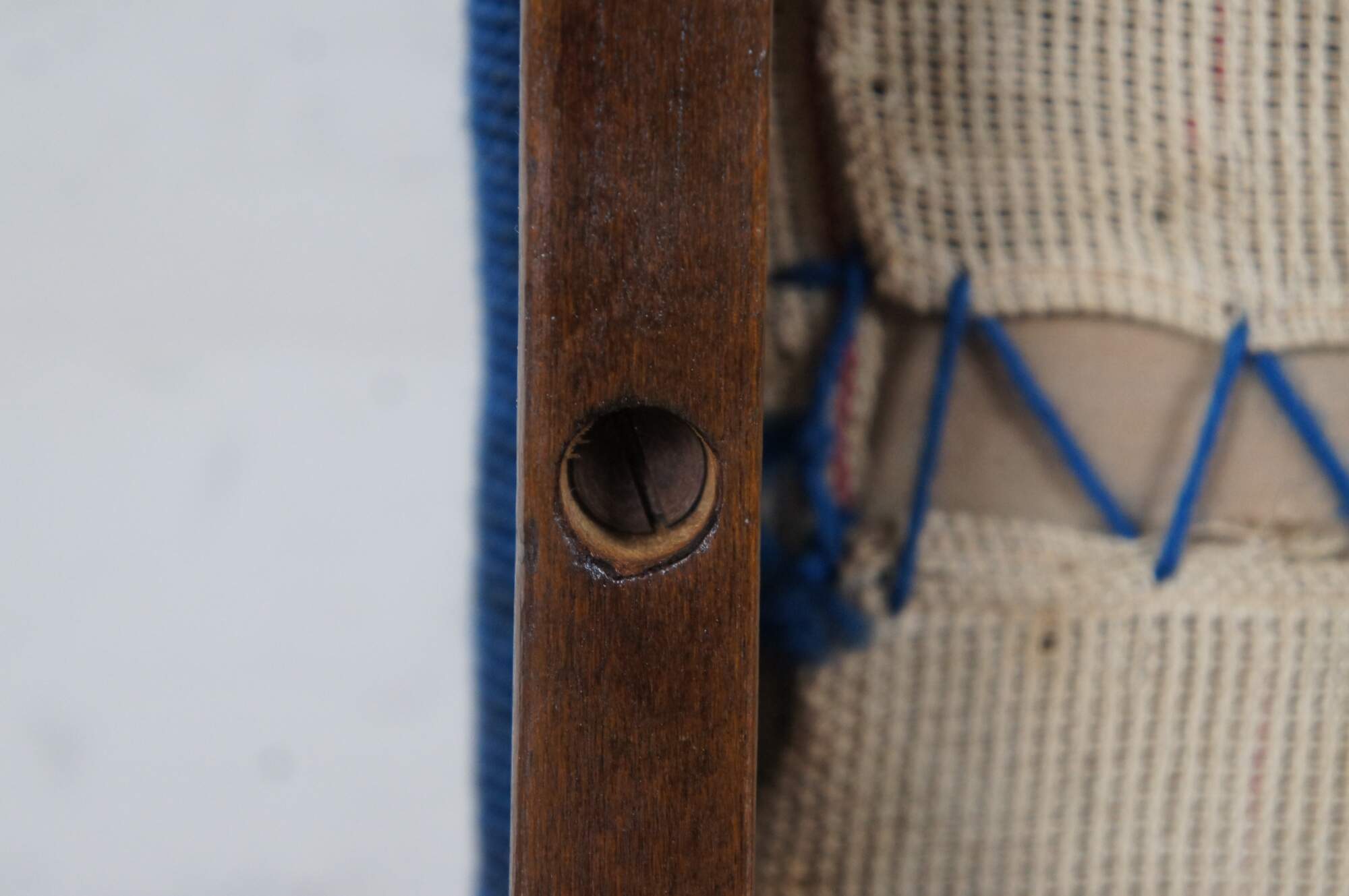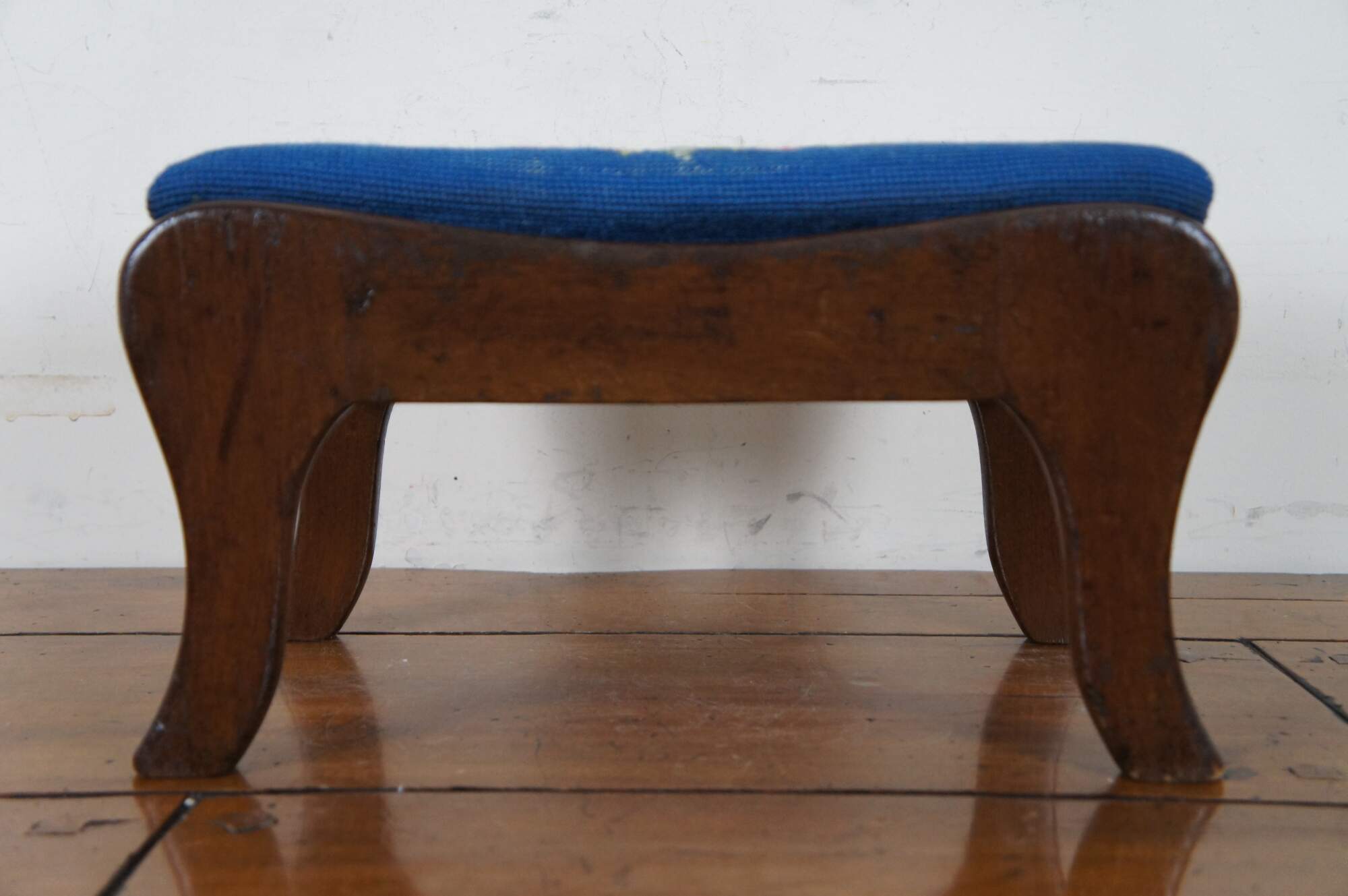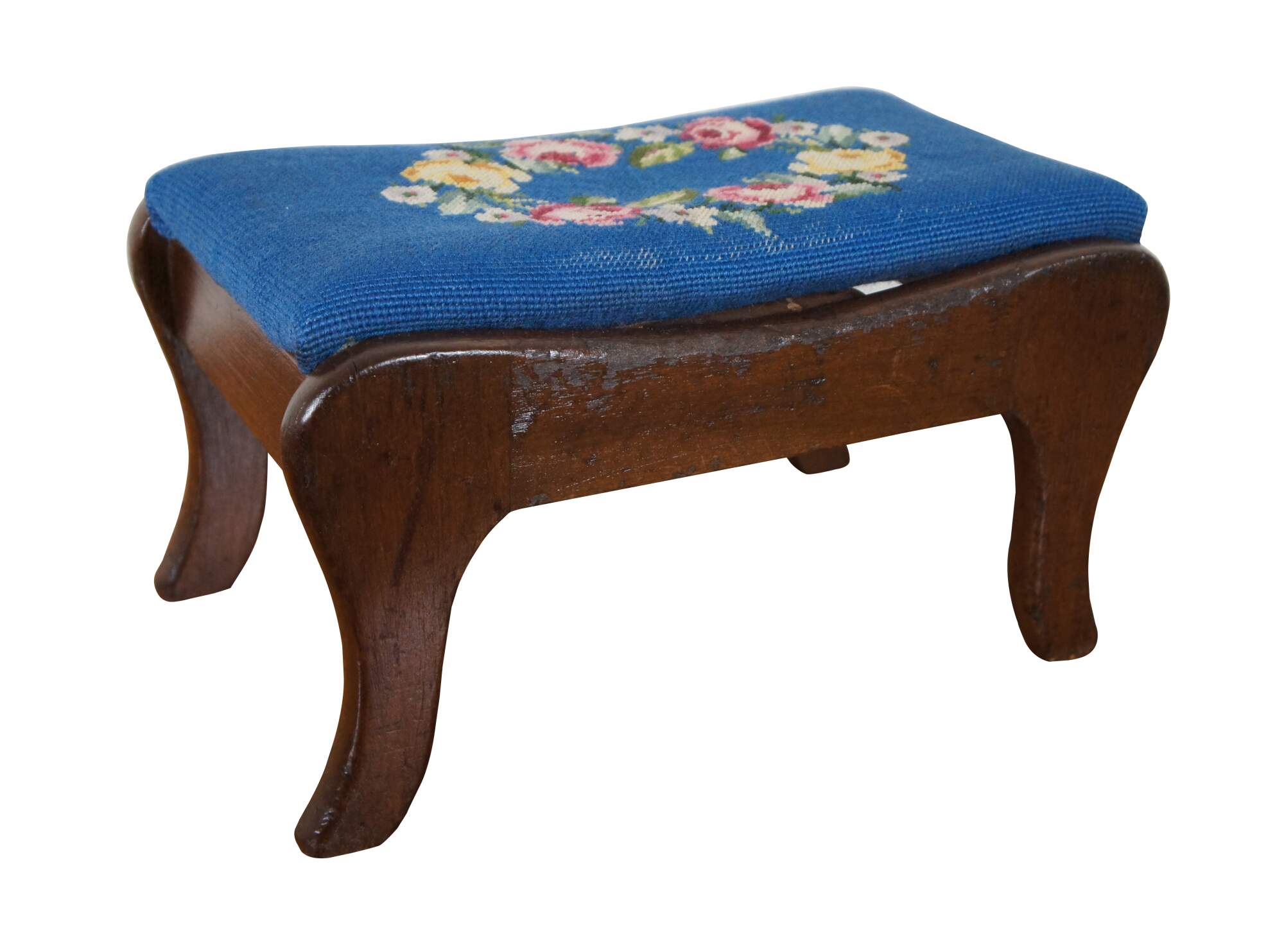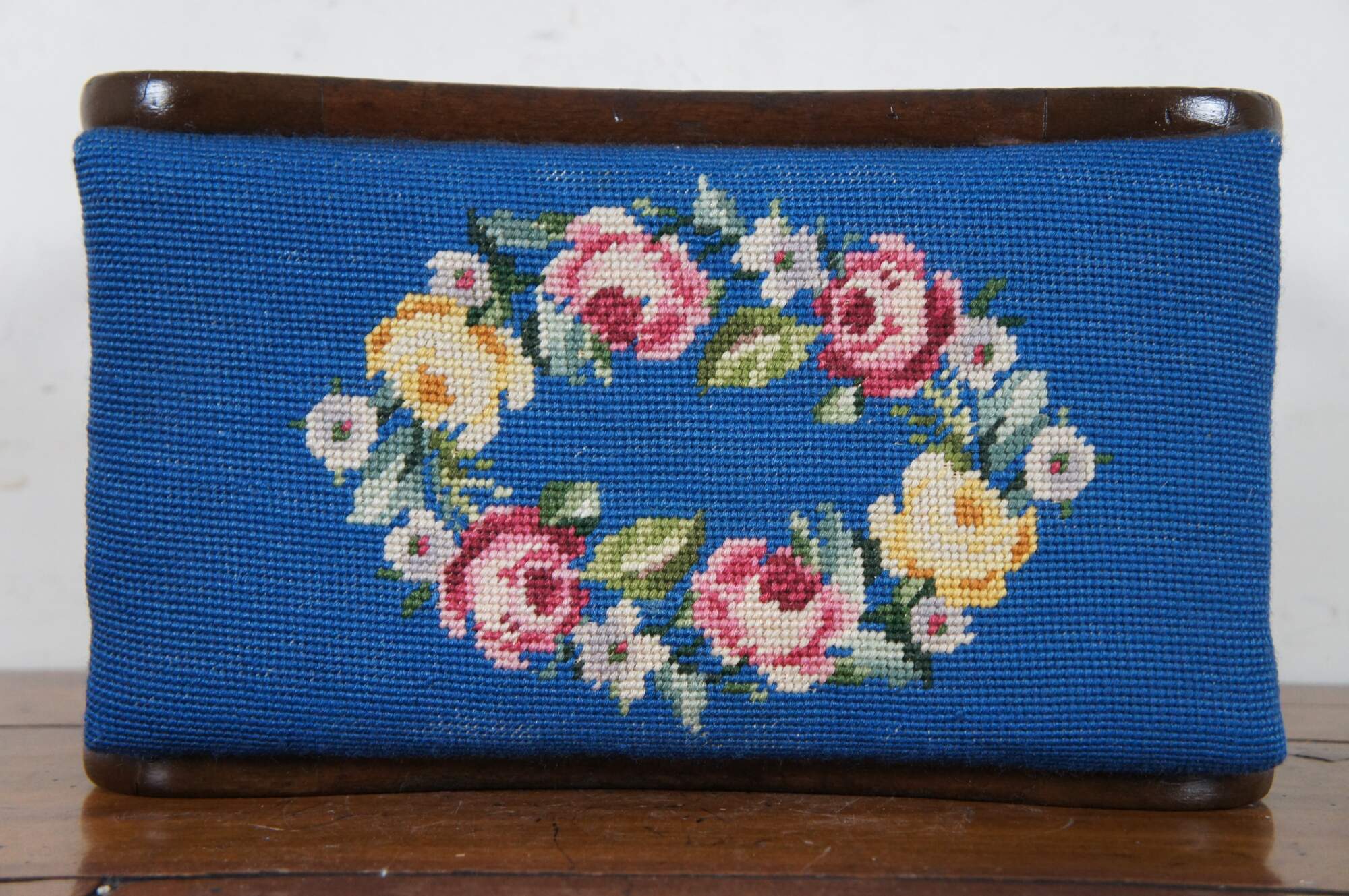 Antique Victorian walnut footstool with hand stitched blue needlepoint cushion showing a wreath of roses and morning glories on a blue ground.