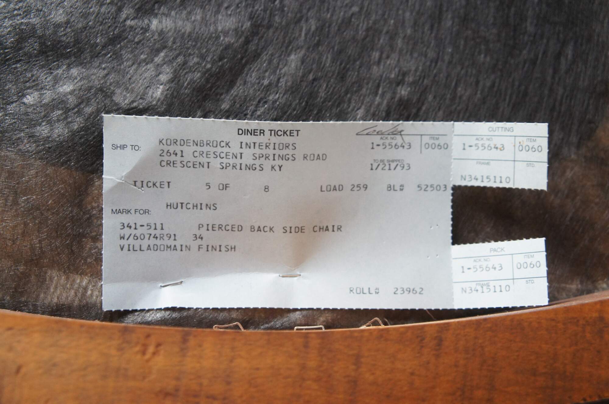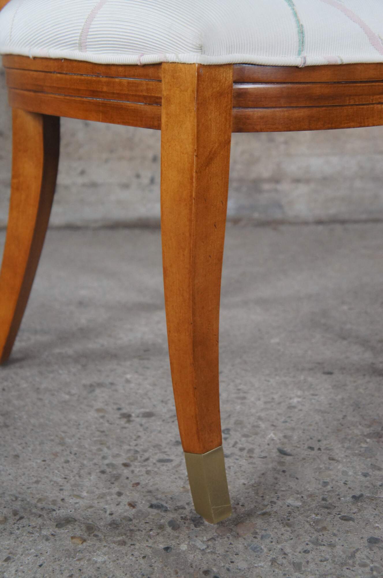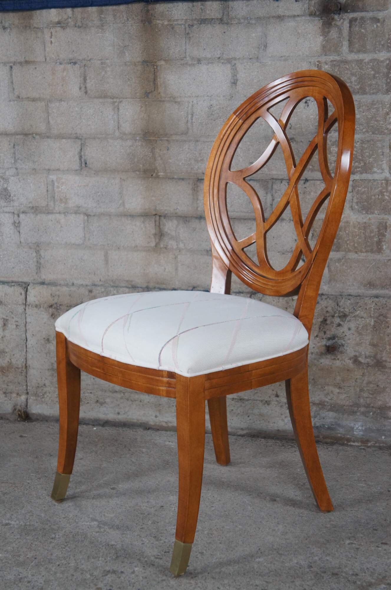 8 vintage Century periced back side chairs 341-511, circa 1993. An oval or spoon shaped interlaced back, finished in their Maple Villadomain finish. The chairs are upholstered in a neutral fabric and supported by saber legs with brass caps.