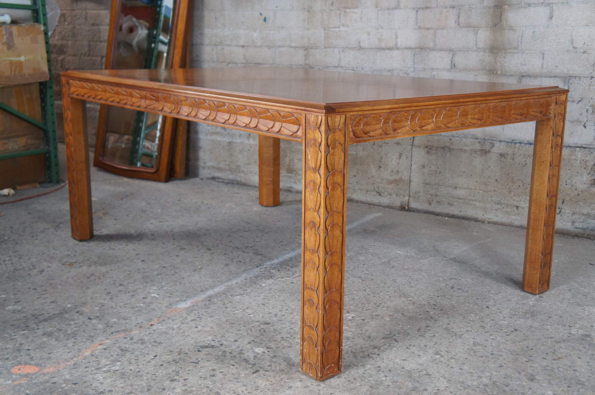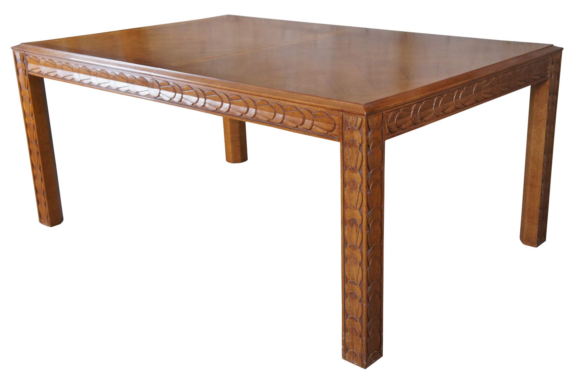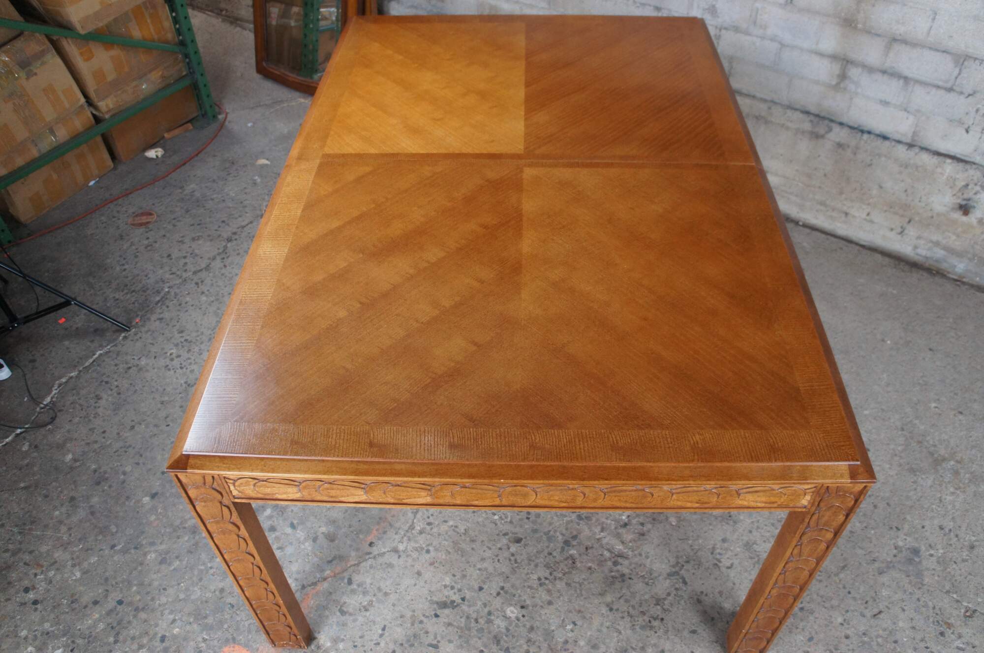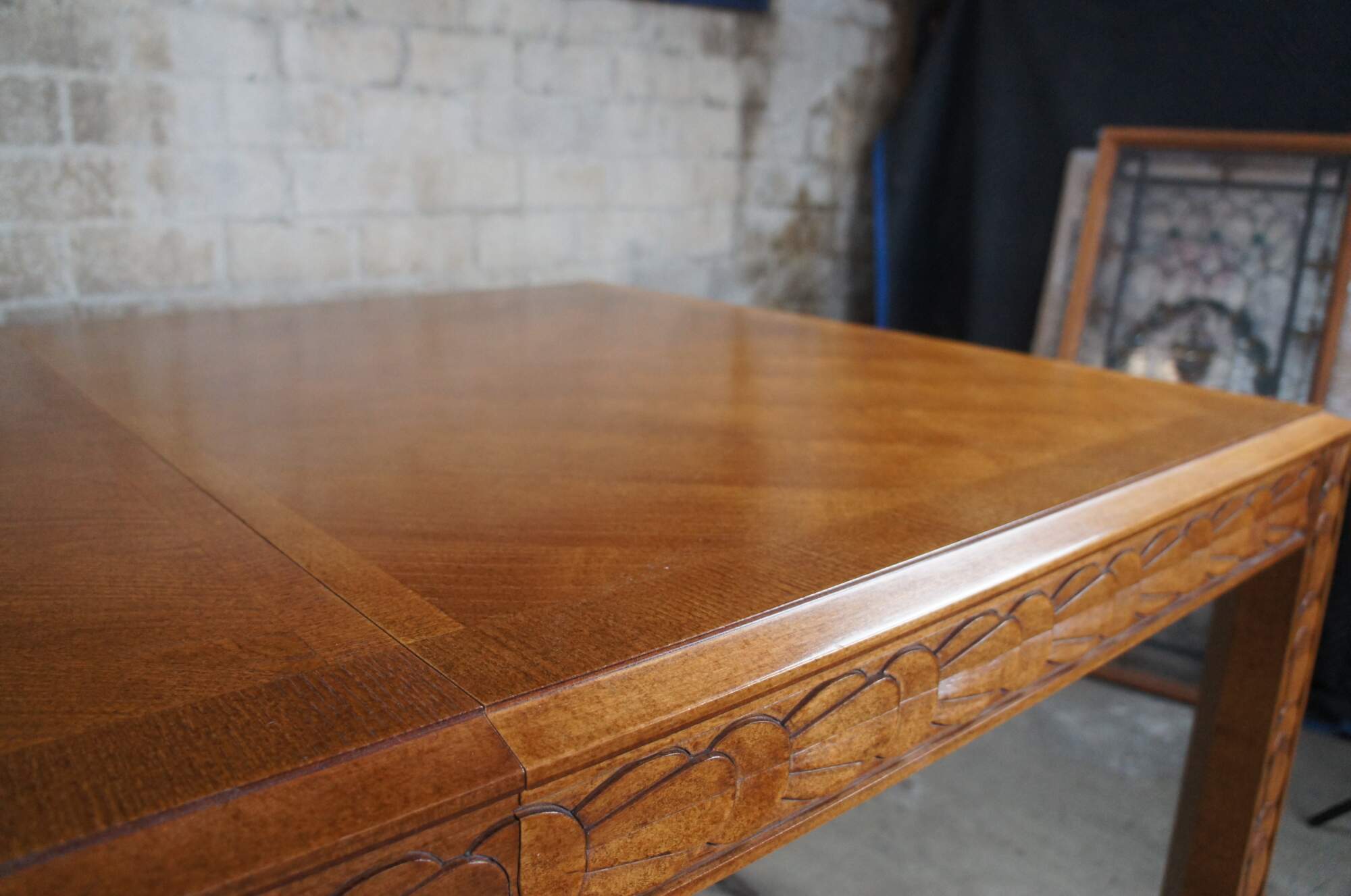 Vintage Century Furniture extendable dining table. Made of maple featuring Parsons style modernist rectangular form with low relief fretwork accents.