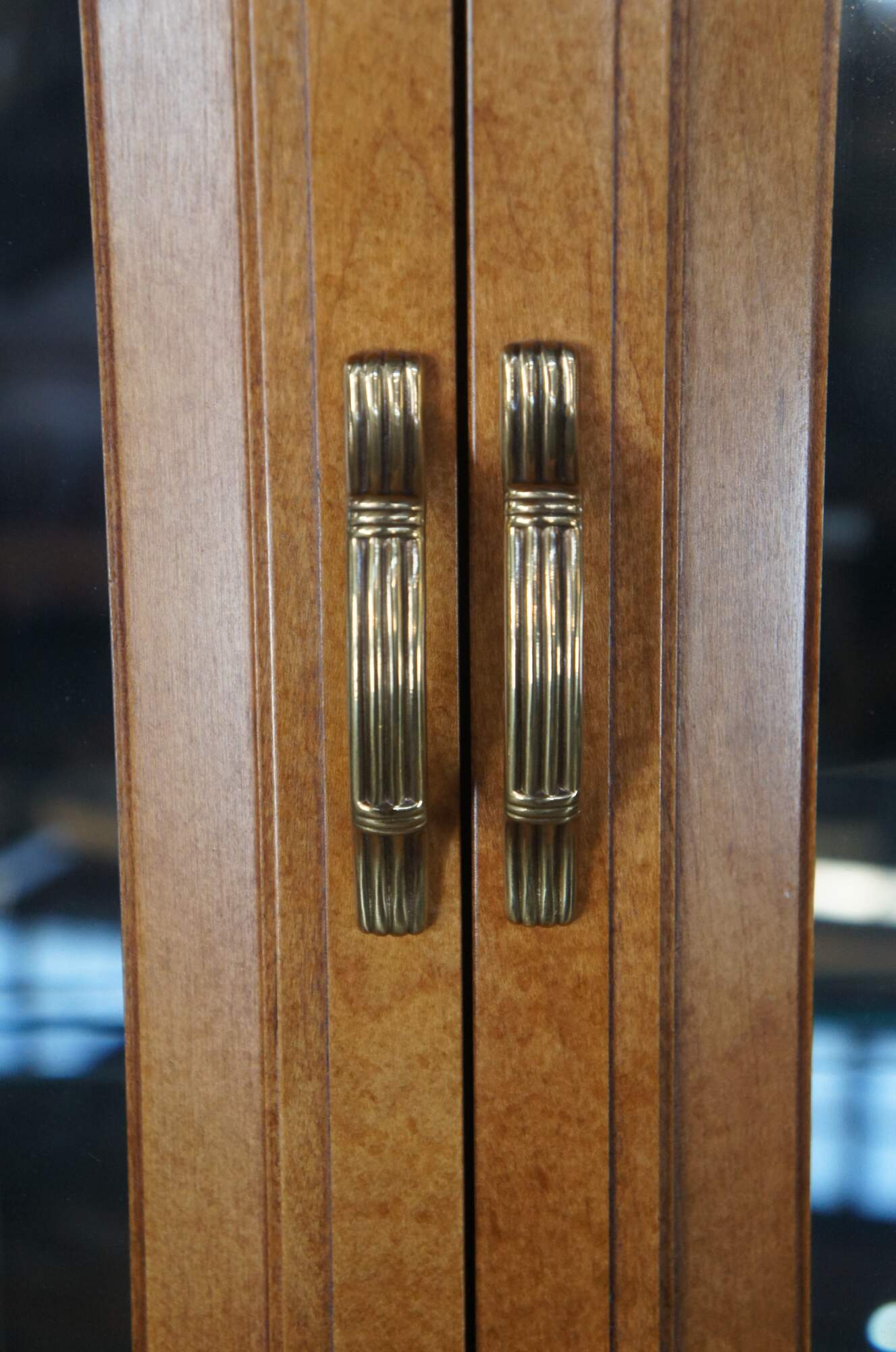 Vintage Century Furniture illuminating breakfront. Made of maple featuring French Neoclassical styling with bullseye banding, a fluted frieze, beveled glass and brass hardware. The base is centered by three drawers set between outer cabinets with shelf. Each features a unique recessed rectangular panel along the front. Display portion houses thick glass shelves with polished edge and plate grooves along the backside. Illuminates via dial along the top left.