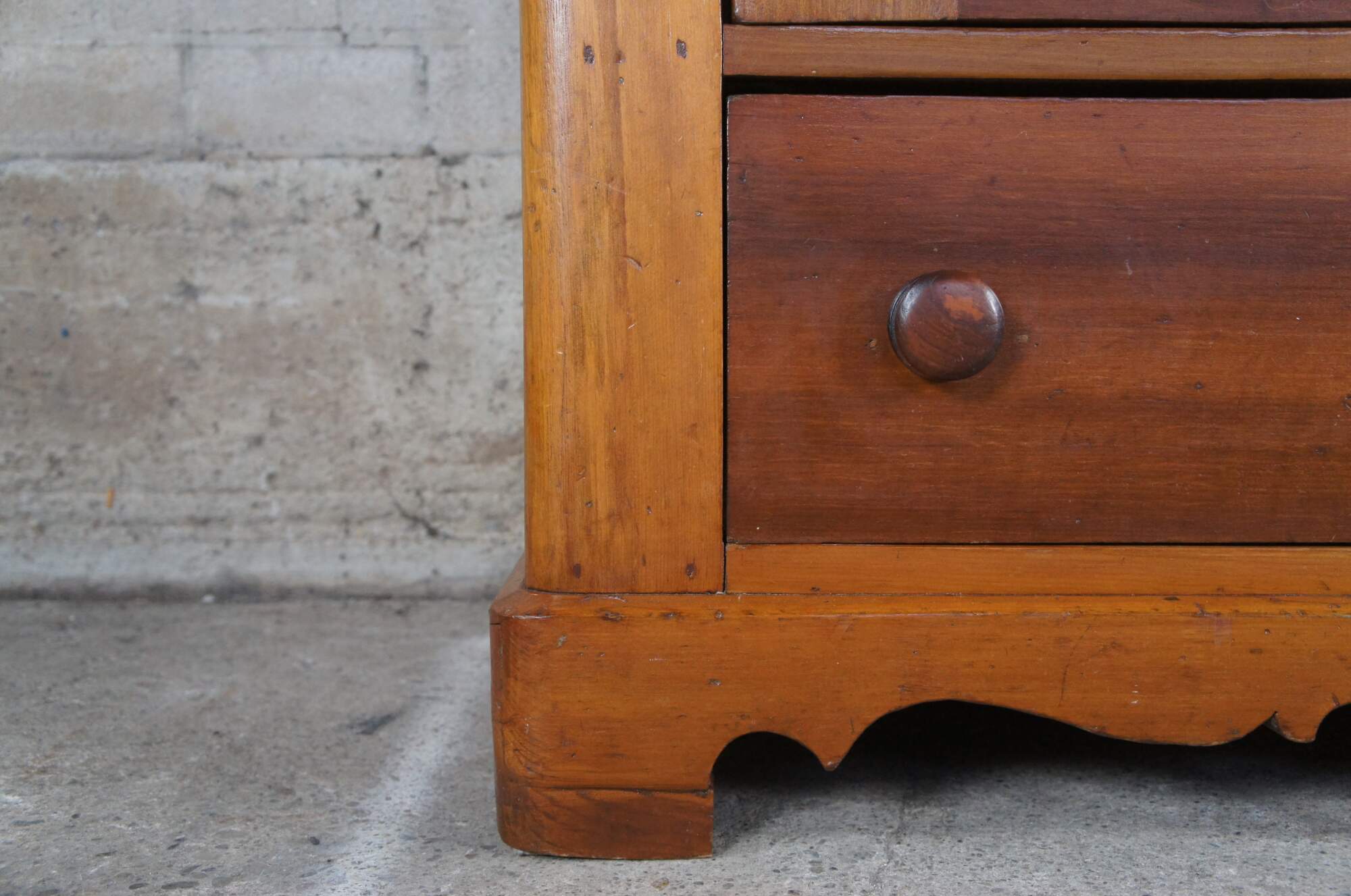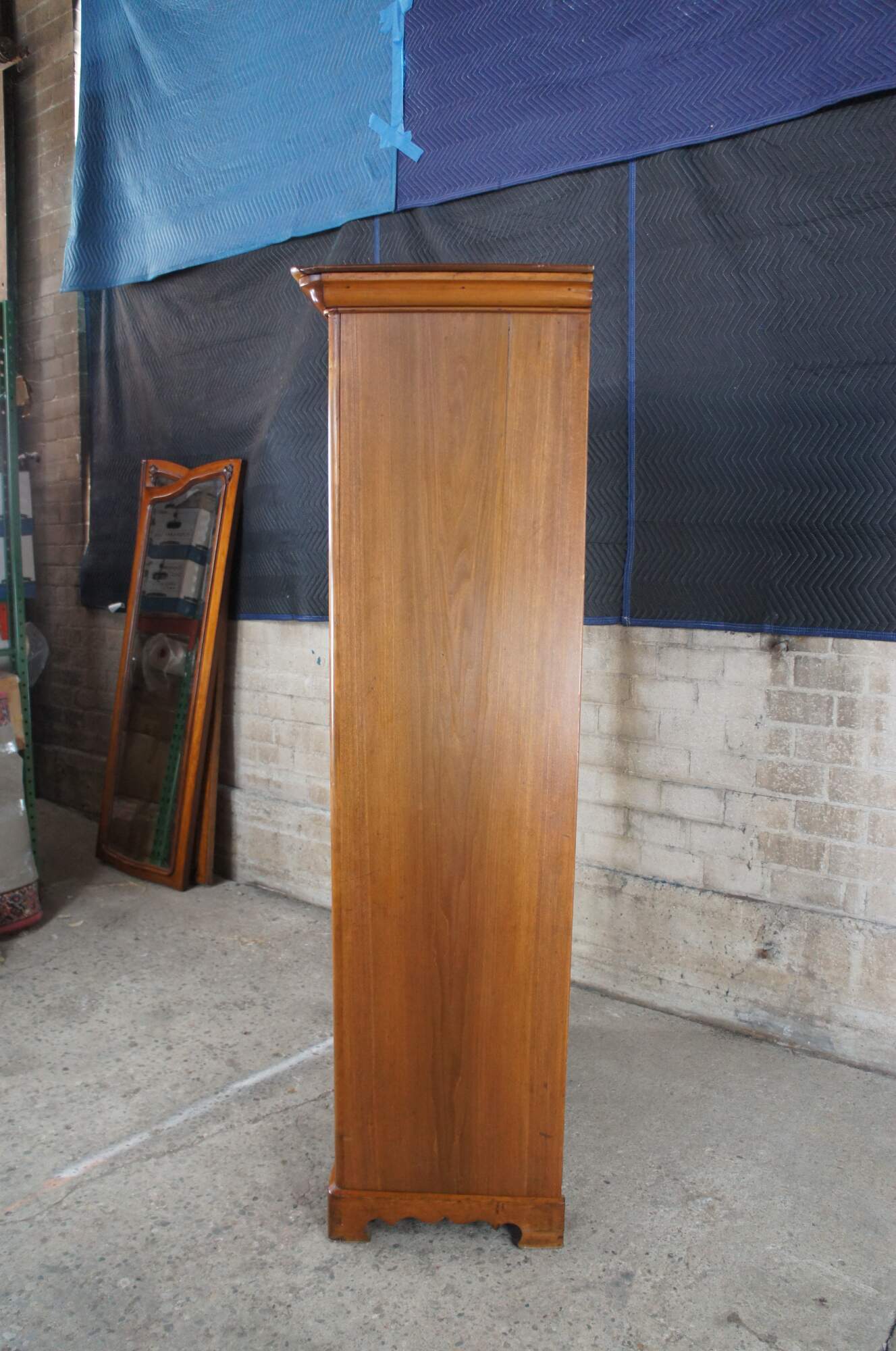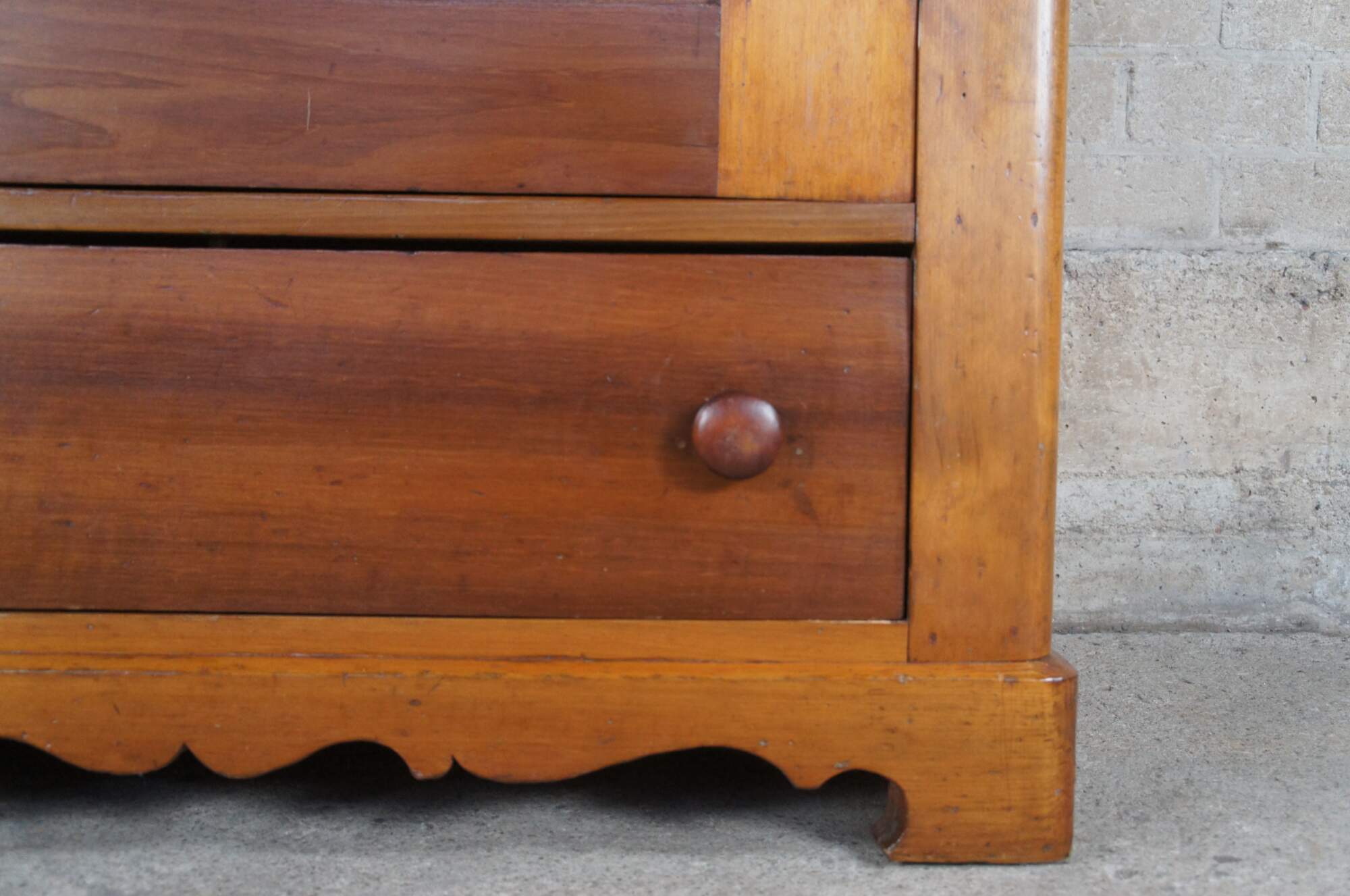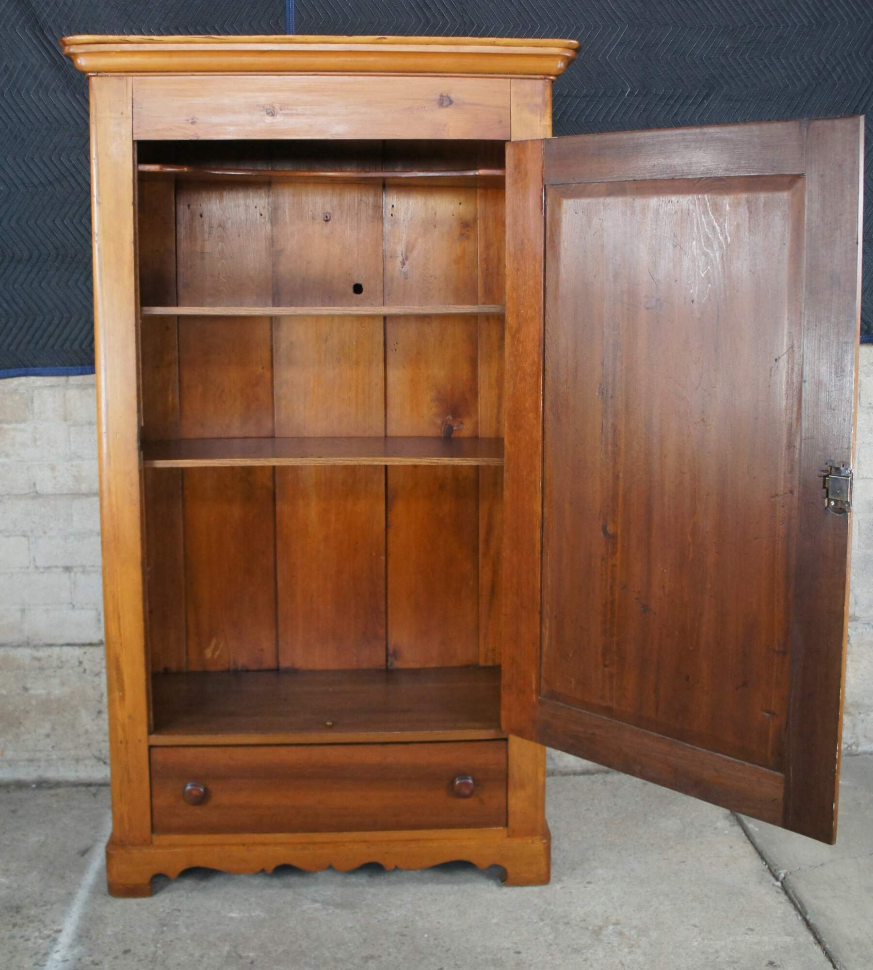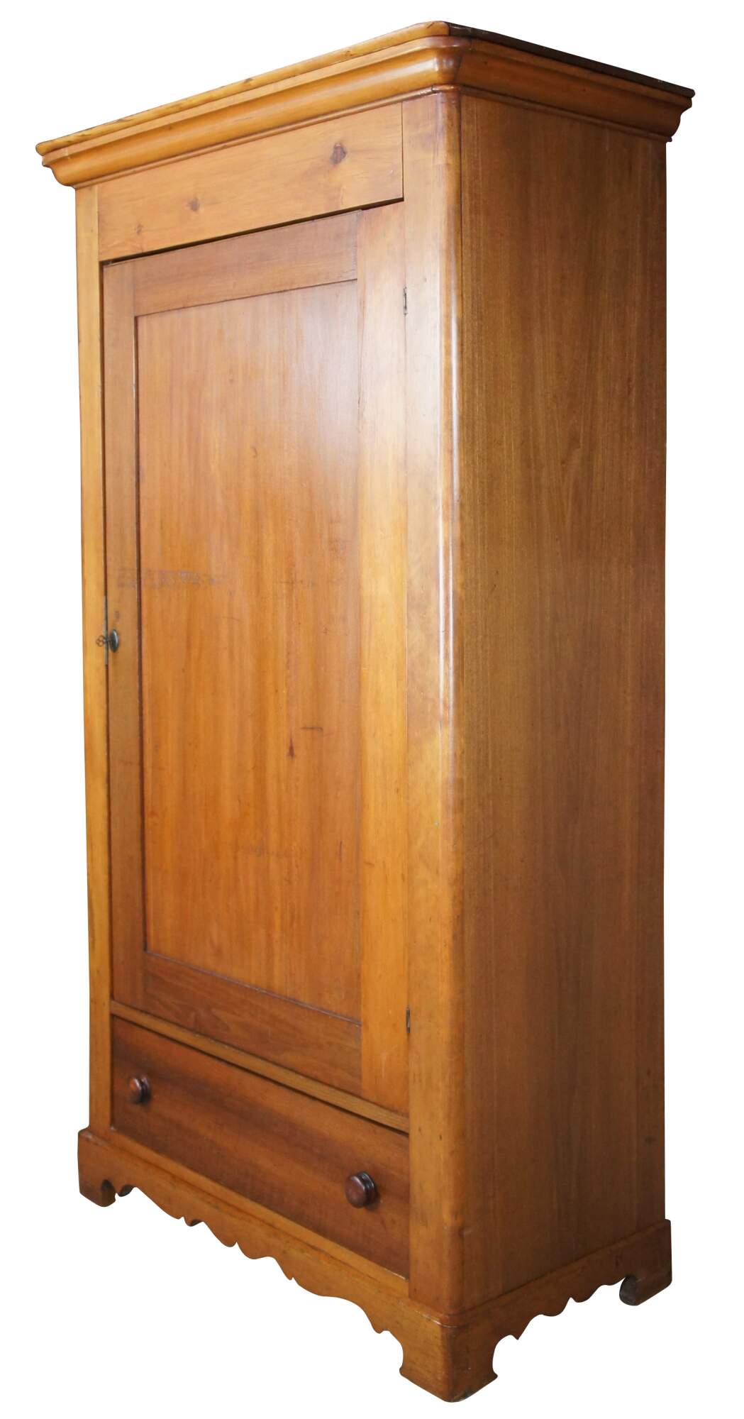 Louis Philippe style Armoire or Linen Press, circa 1870s. Made from pine with a lockable central door that oppens to three interior shelves. The bottom of the cabinet is accented by a lovely serpentine cut apron and large lower hand delivetailed drawer.